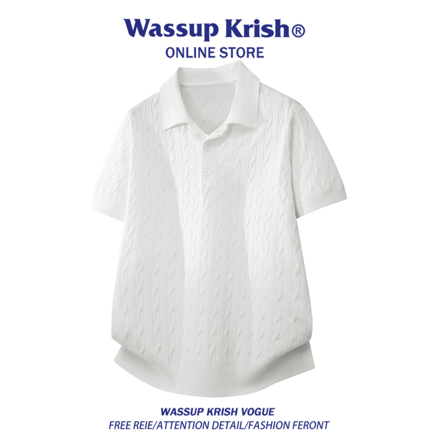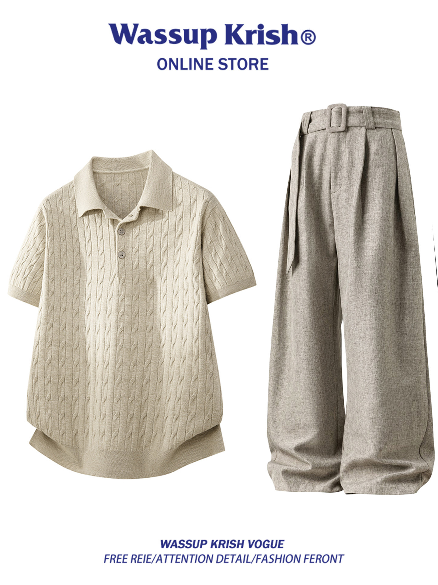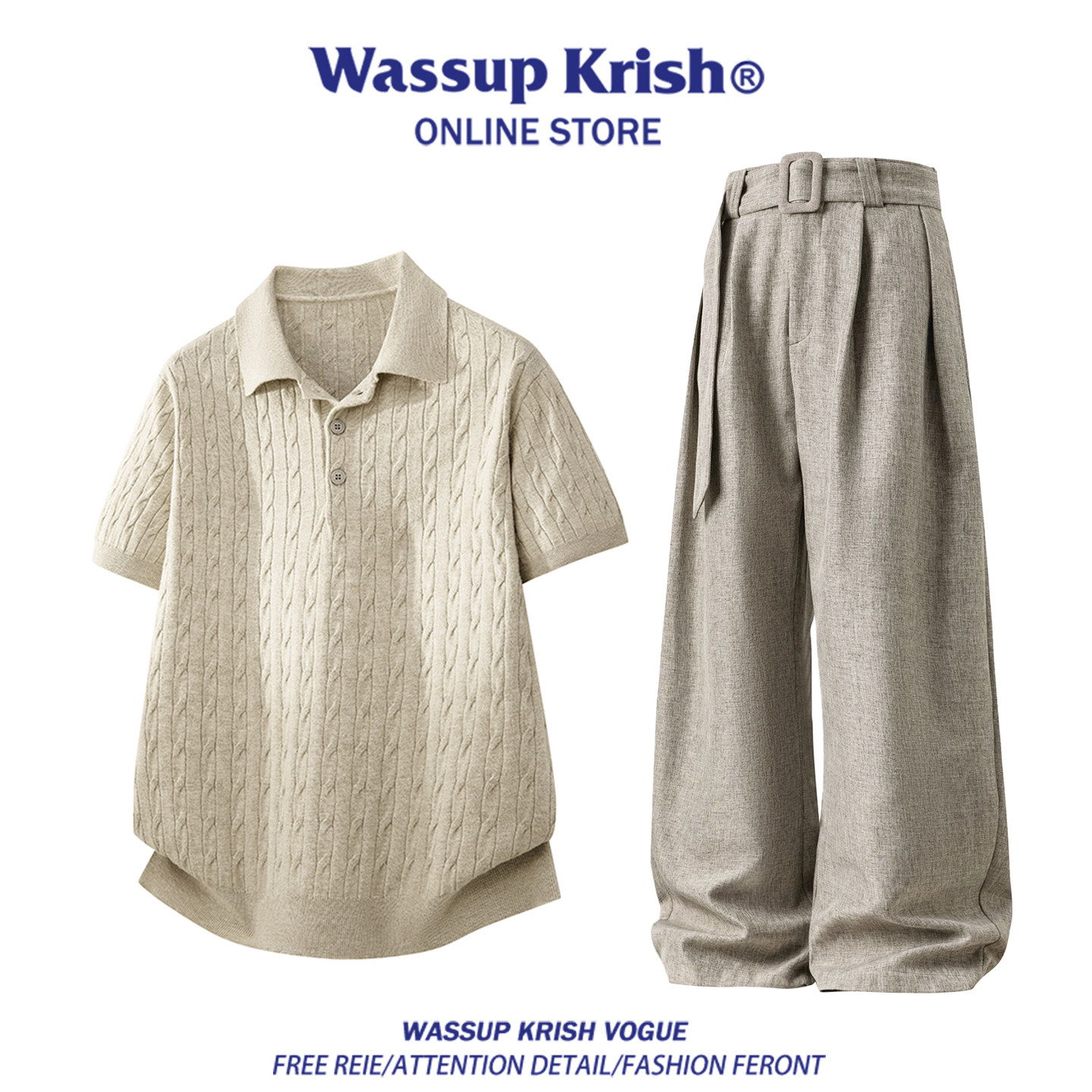 WASSUP KRISH老钱风休闲套装男夏季新款针织麻花短袖polo衫一整套