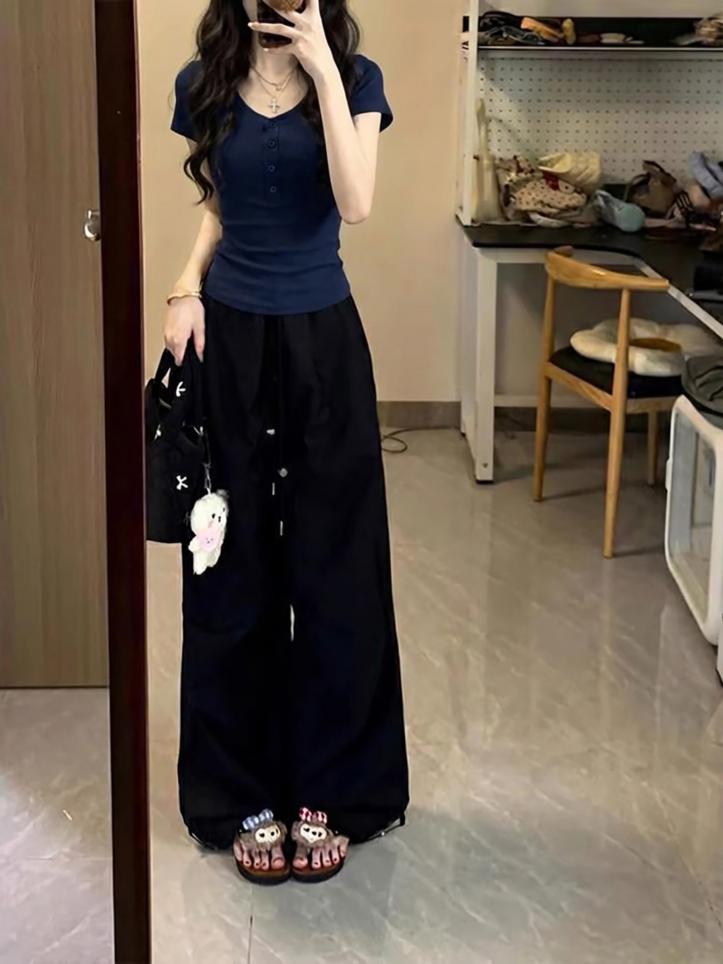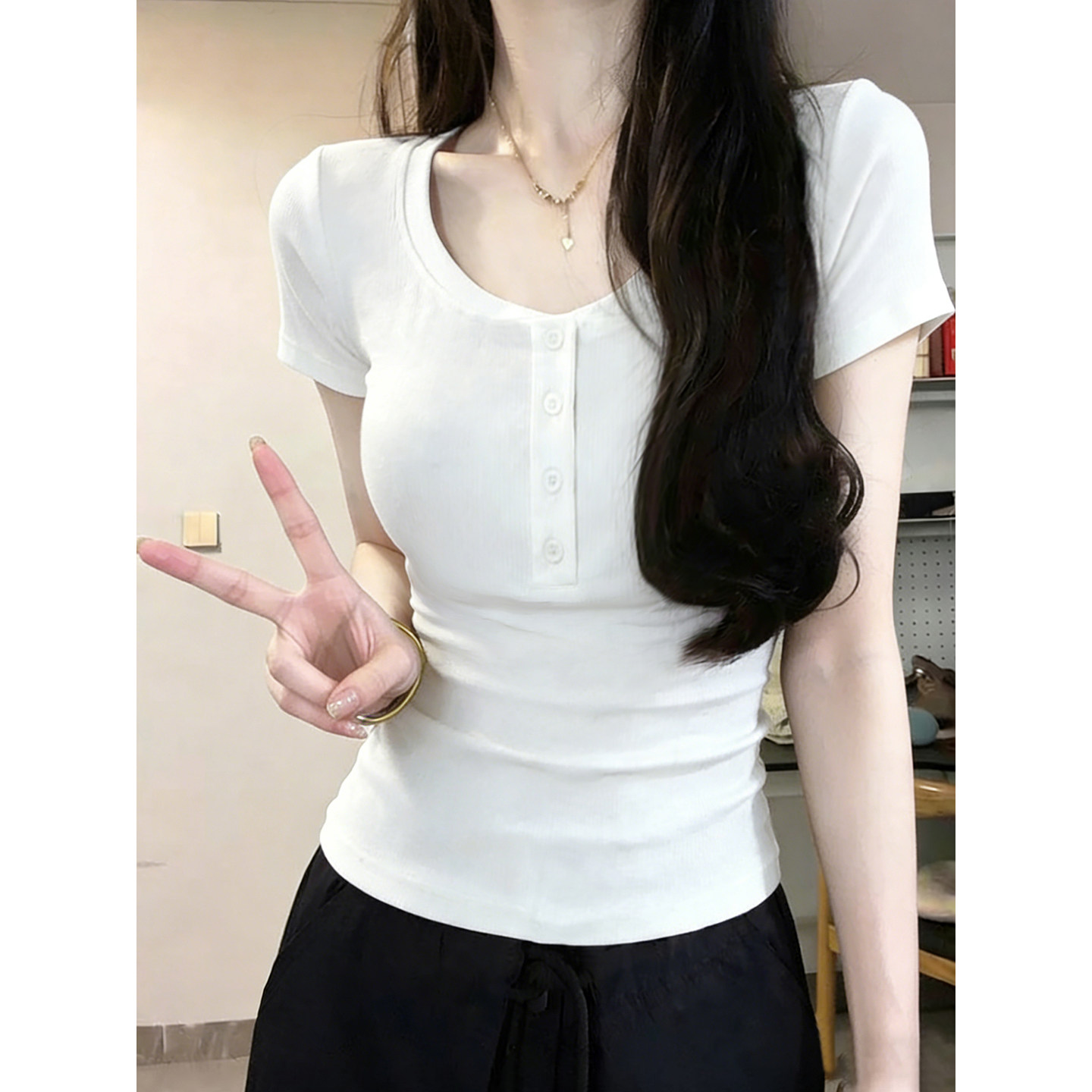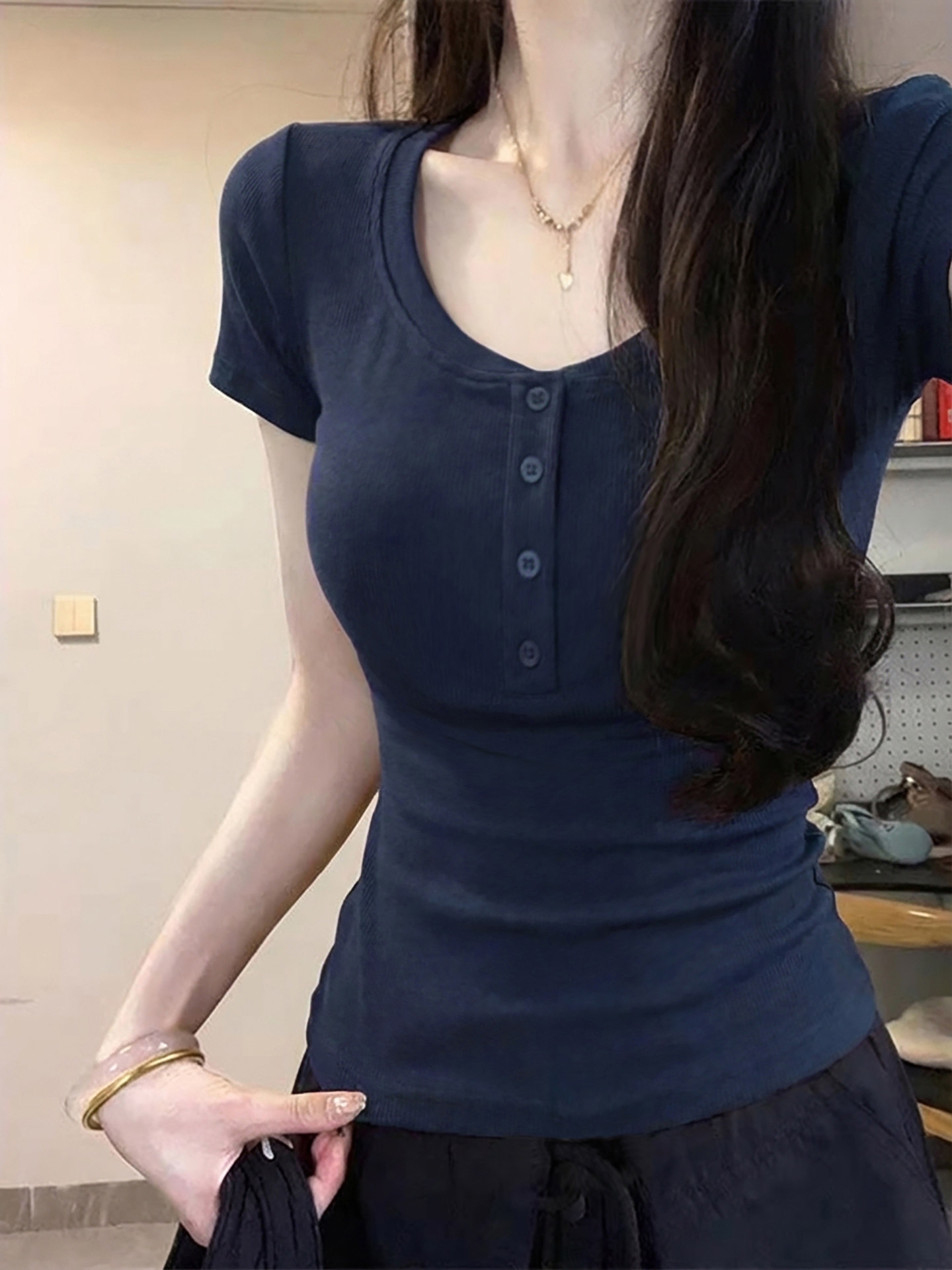 藏蓝色V领正肩纽扣上衣短袖女美式辣妹修身收腰T恤显瘦初夏季穿搭