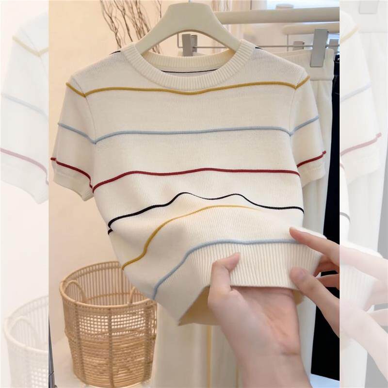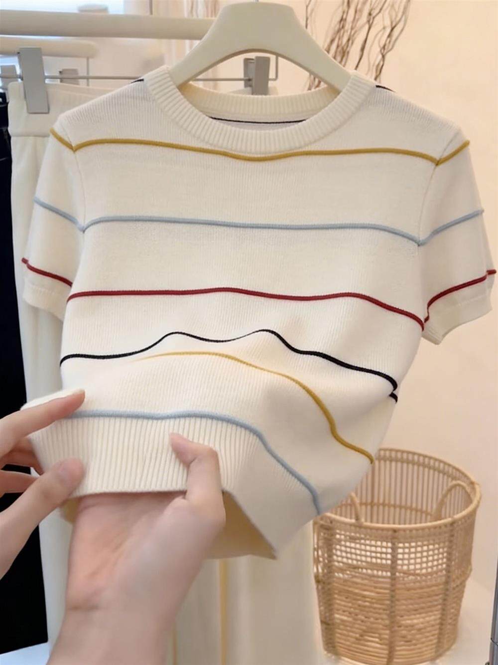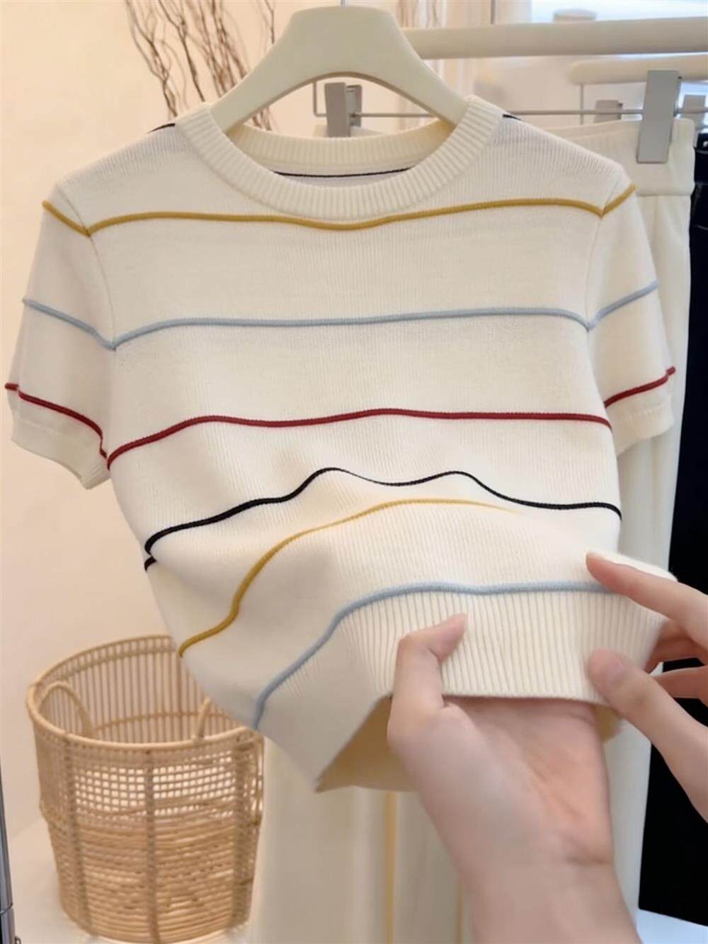 绝美巨好看的小上衣超火减龄针织条纹短袖t恤女2026新款夏季穿搭