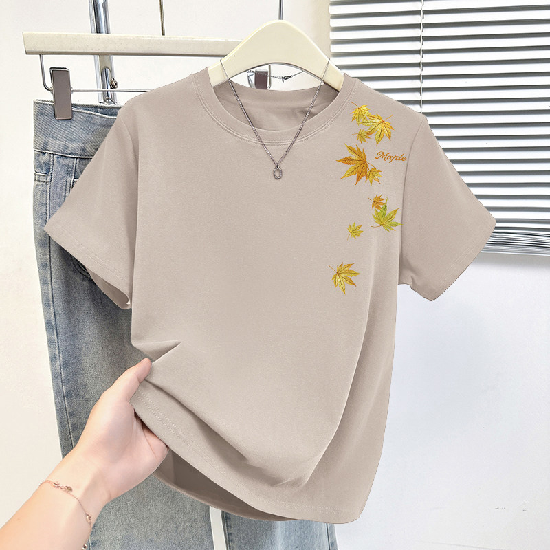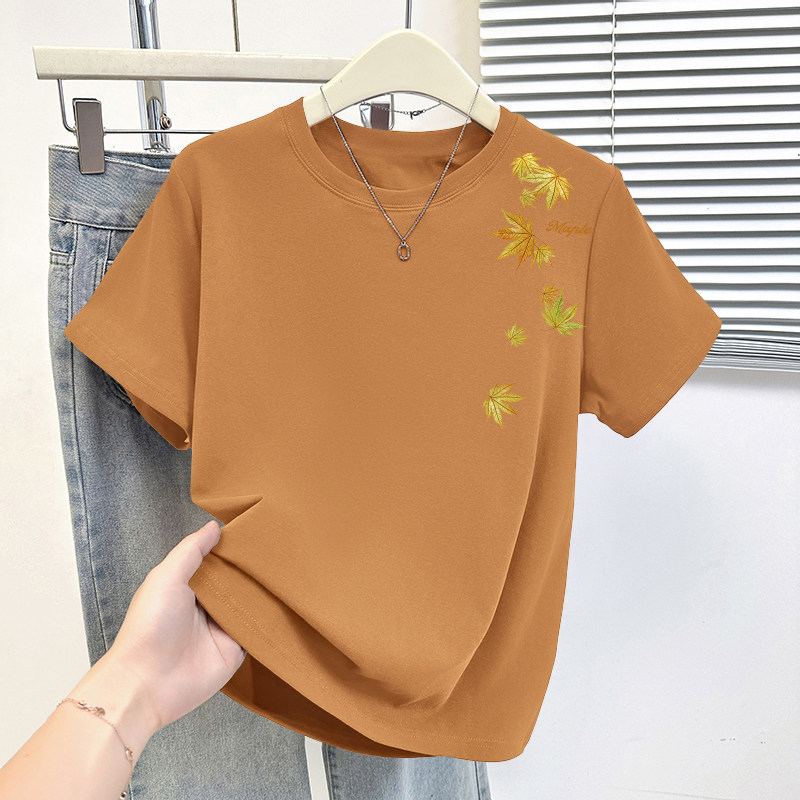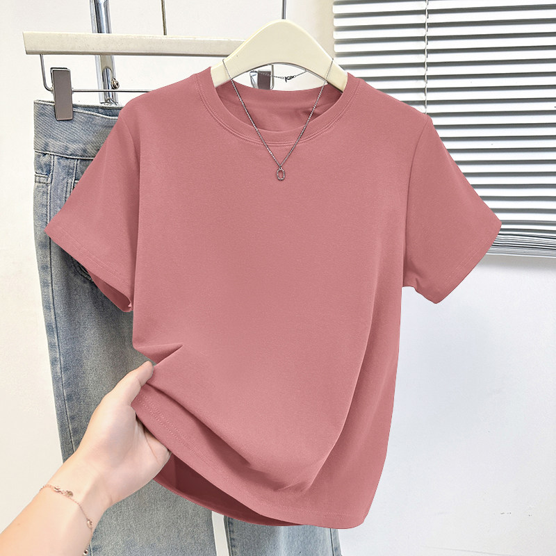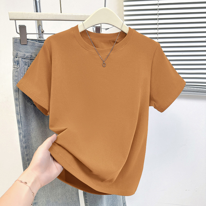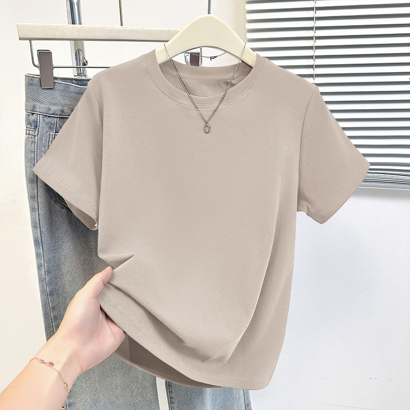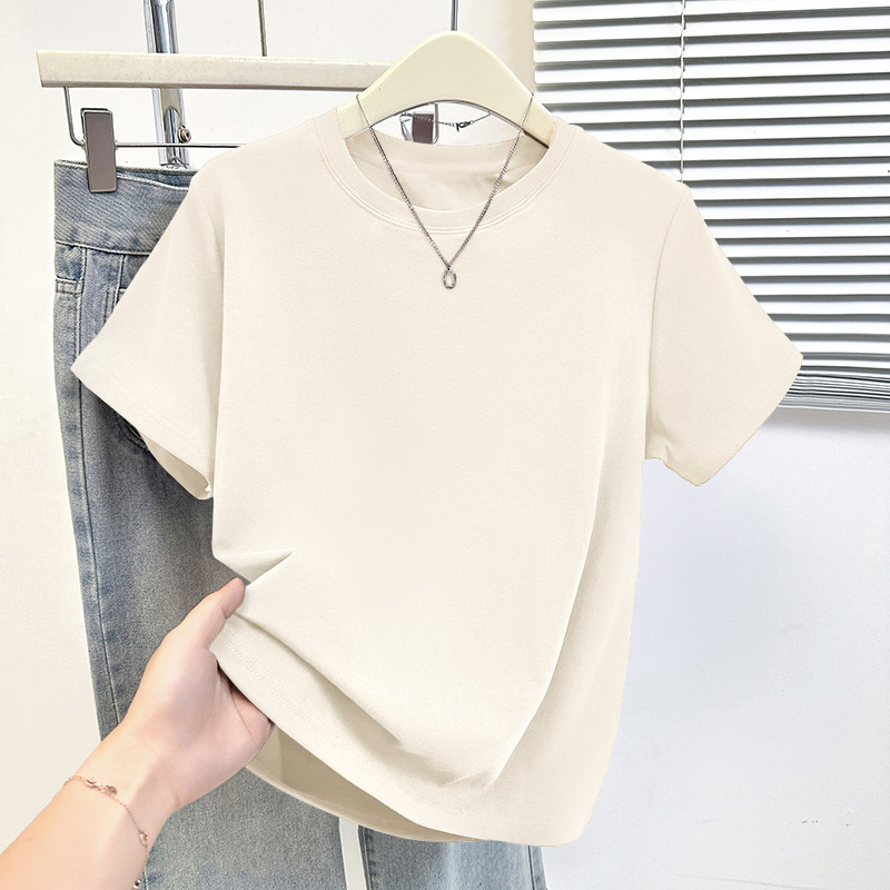 HomeProducts杏色纯棉100%气质减龄大码显瘦圆领t恤女士薄款洋气短袖时尚上衣