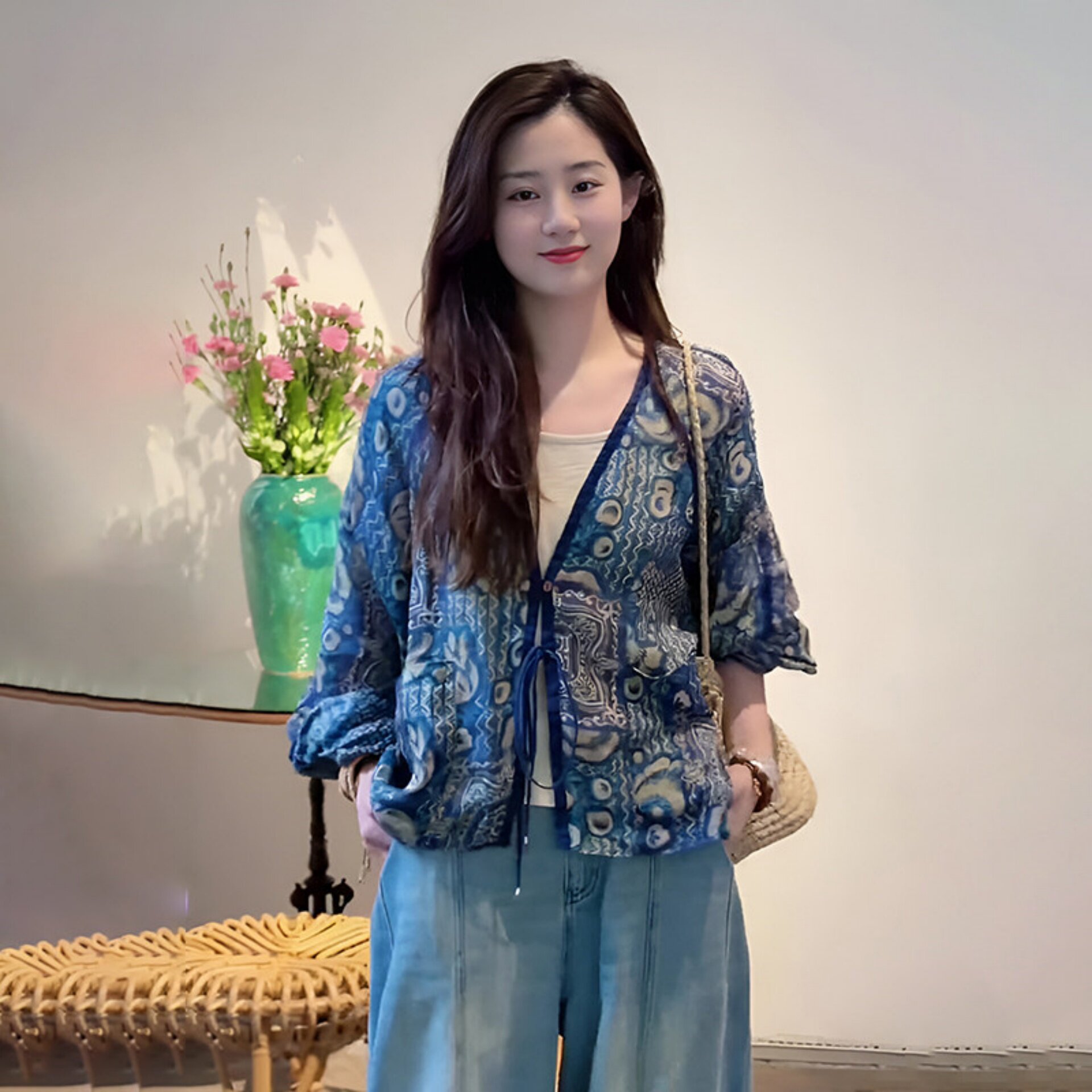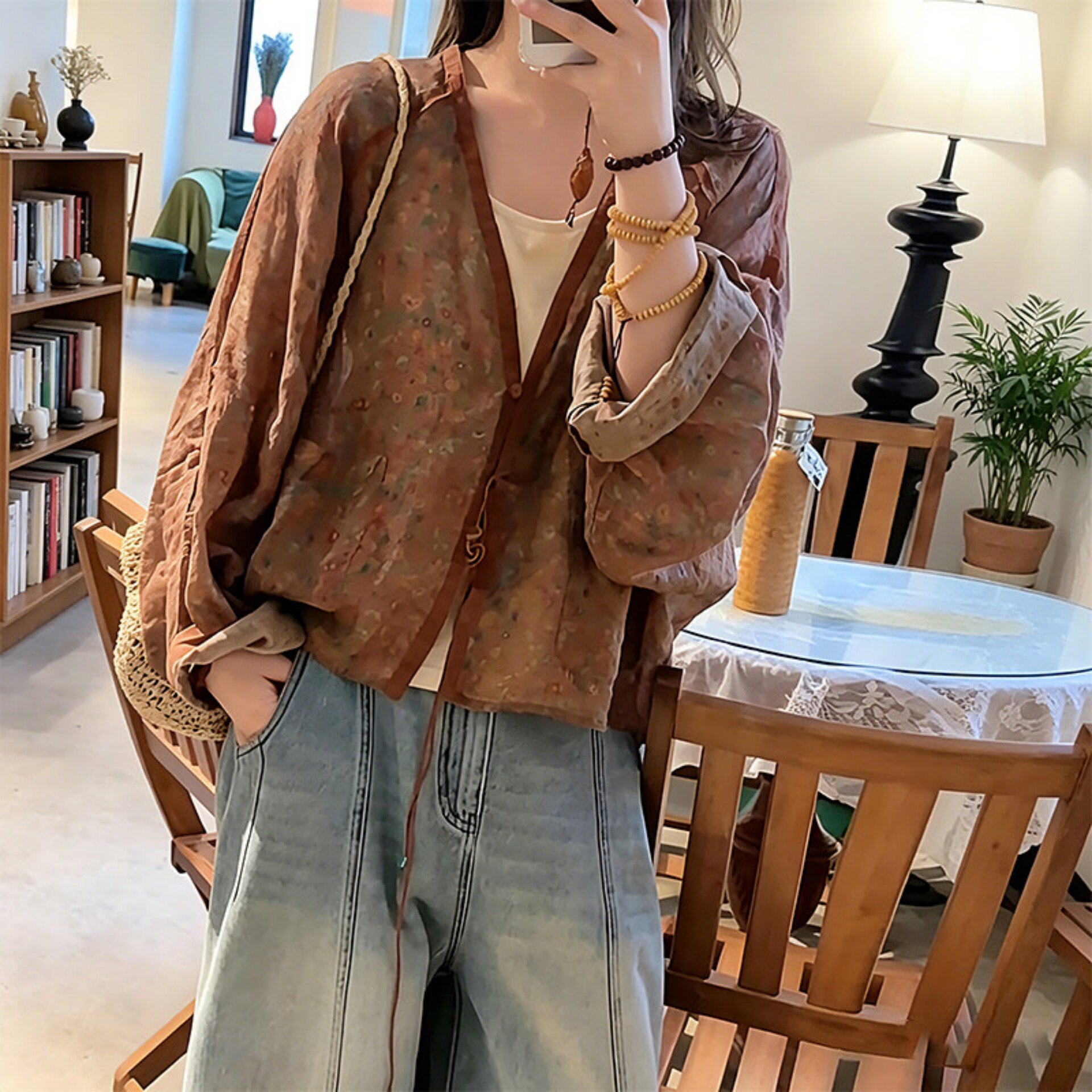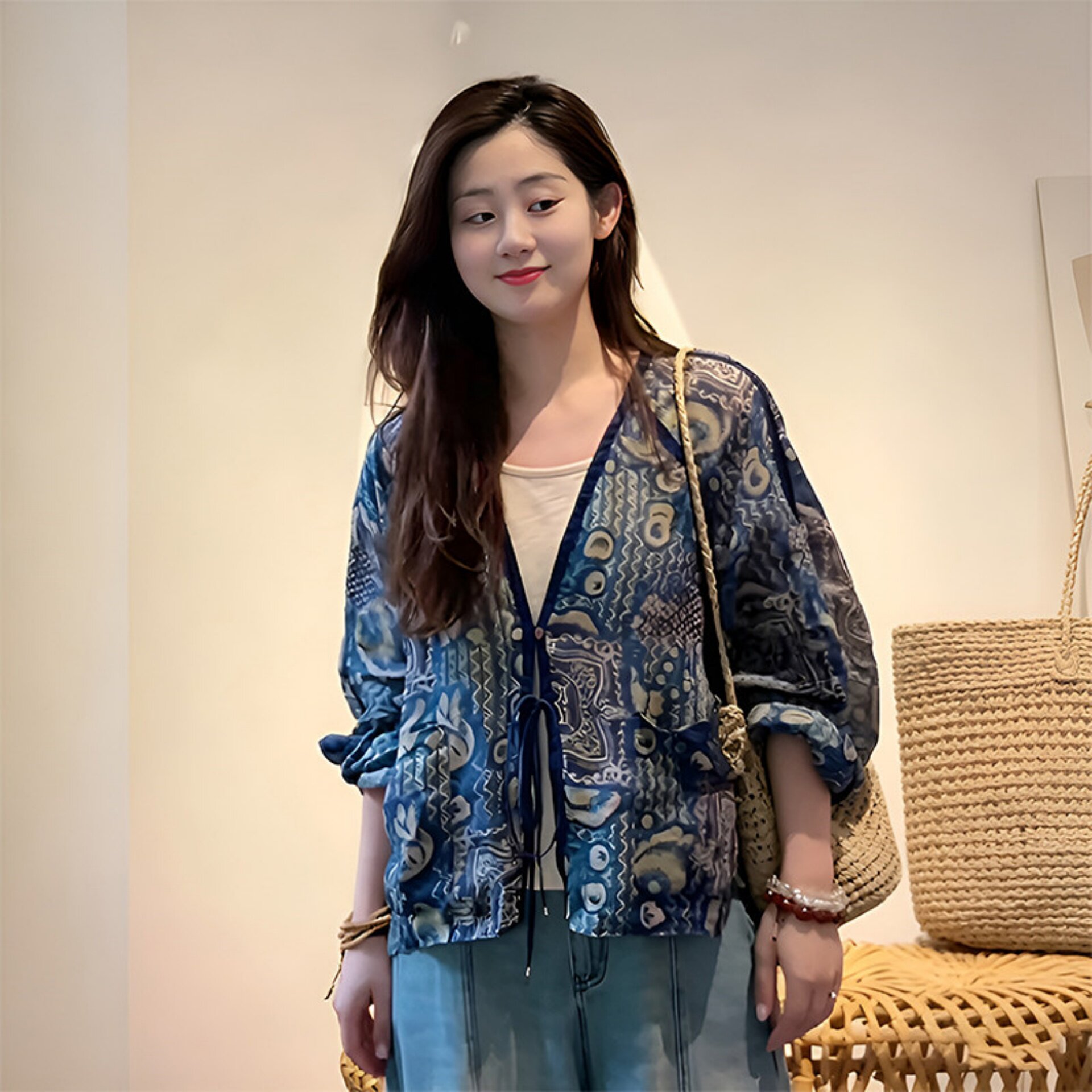 v领系带防晒衬衫女款2026新款夏季宽松薄款外搭罩衫新中式上衣