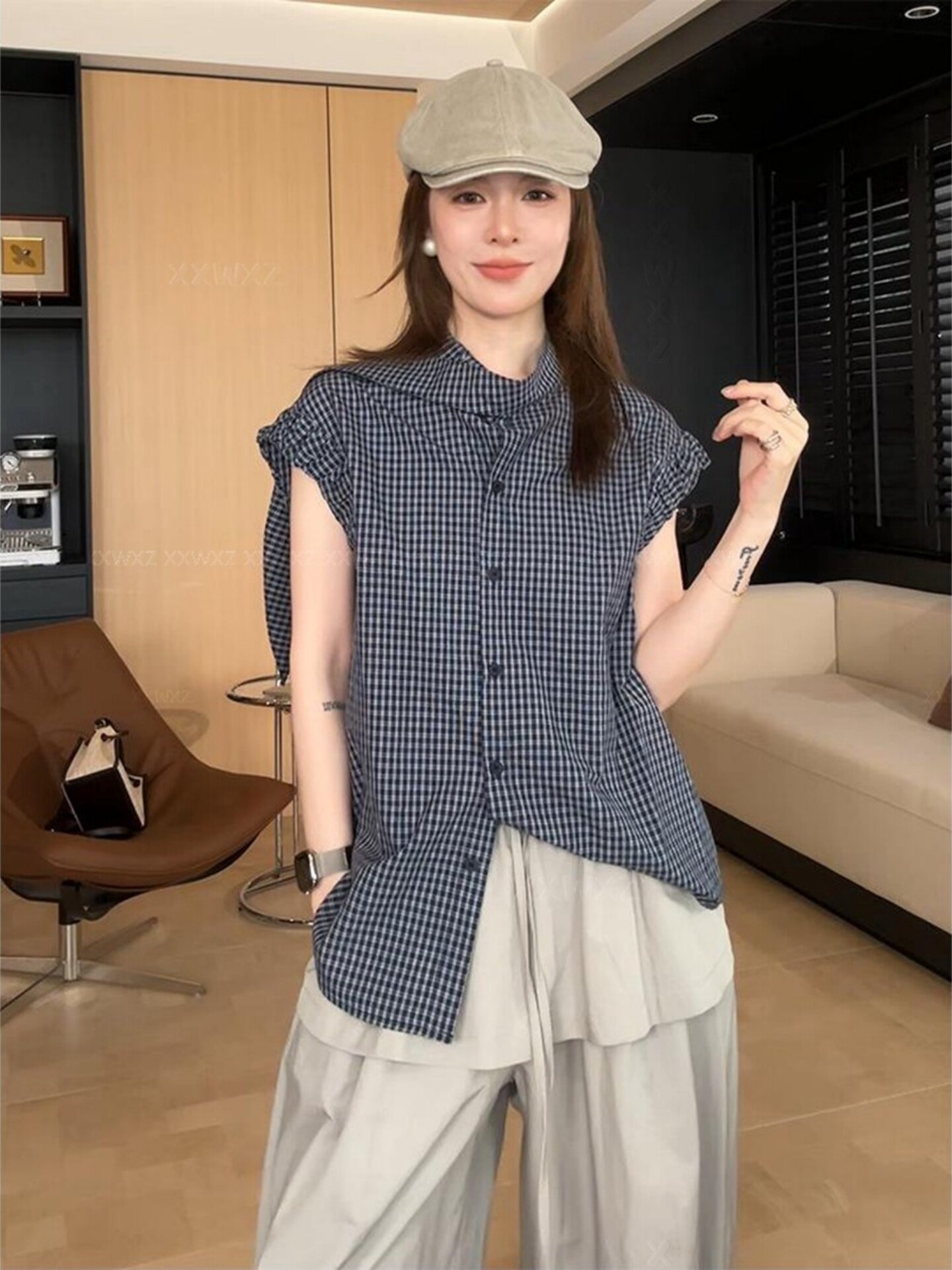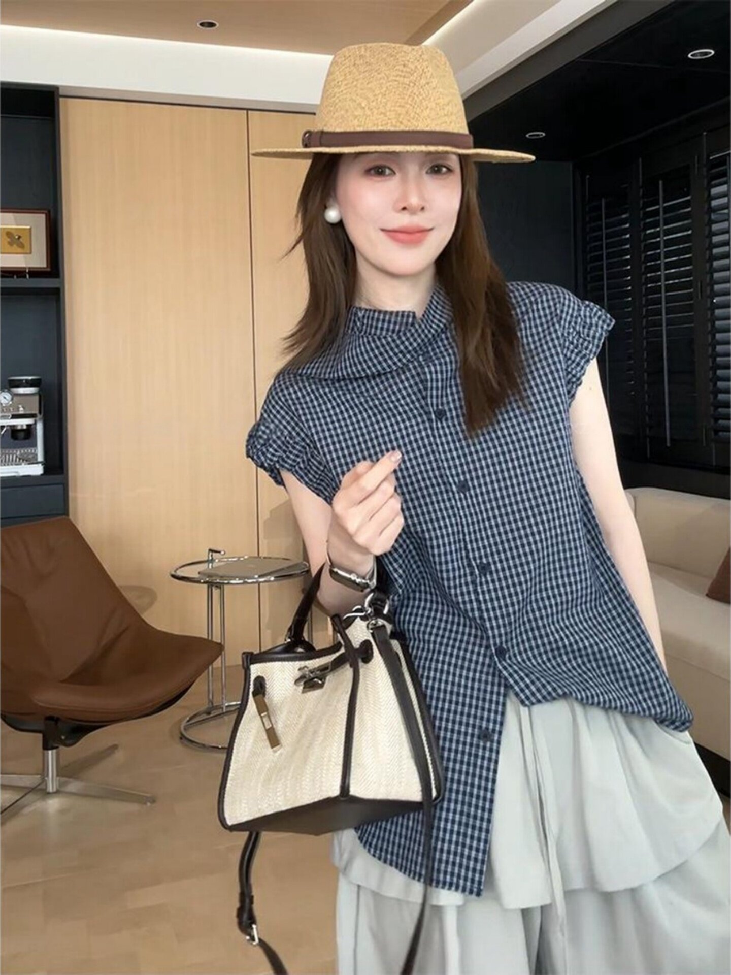 木耳边休闲无袖马甲格子衬衫女款2026新款夏季设计感飘带法式上衣