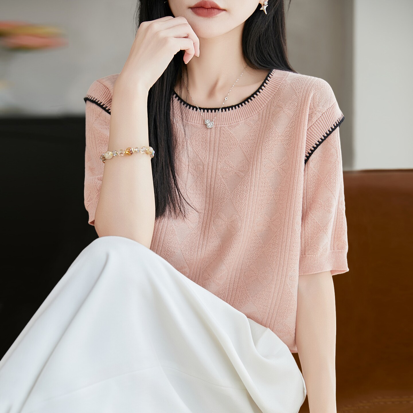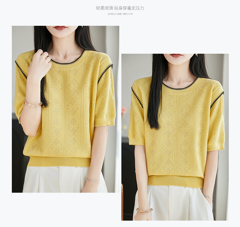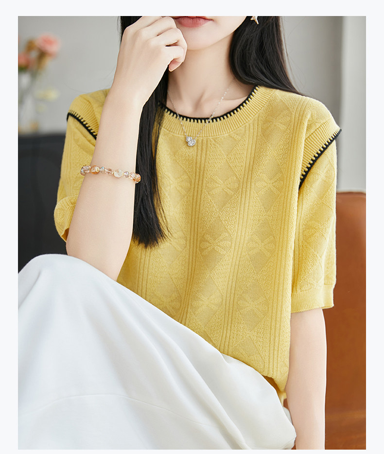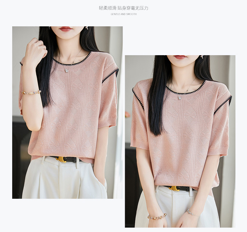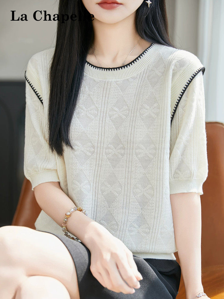 HomeProducts拉夏贝尔撞色提花短袖针织衫女夏薄款胖mm显瘦遮肚子圆领新款上衣