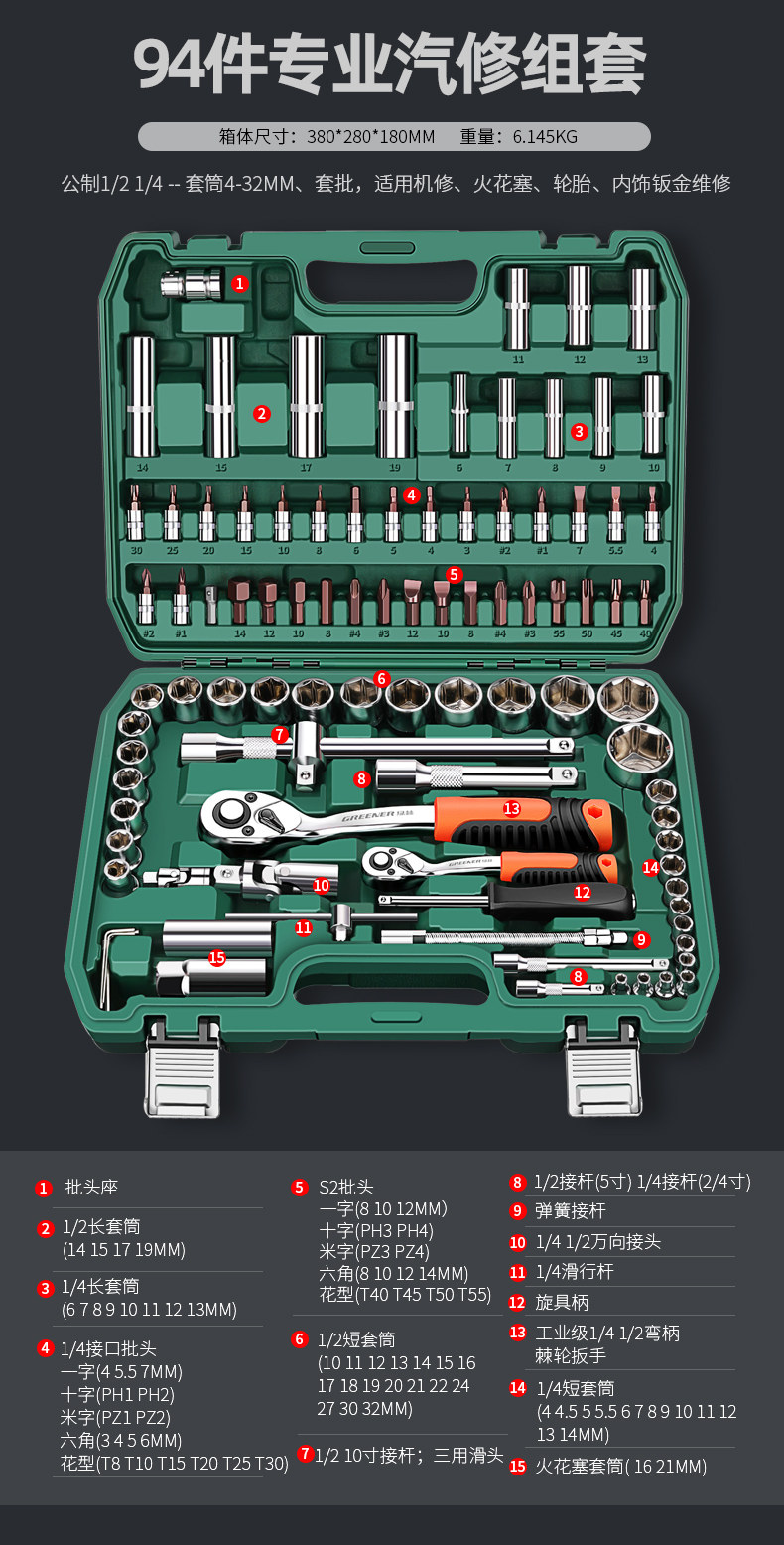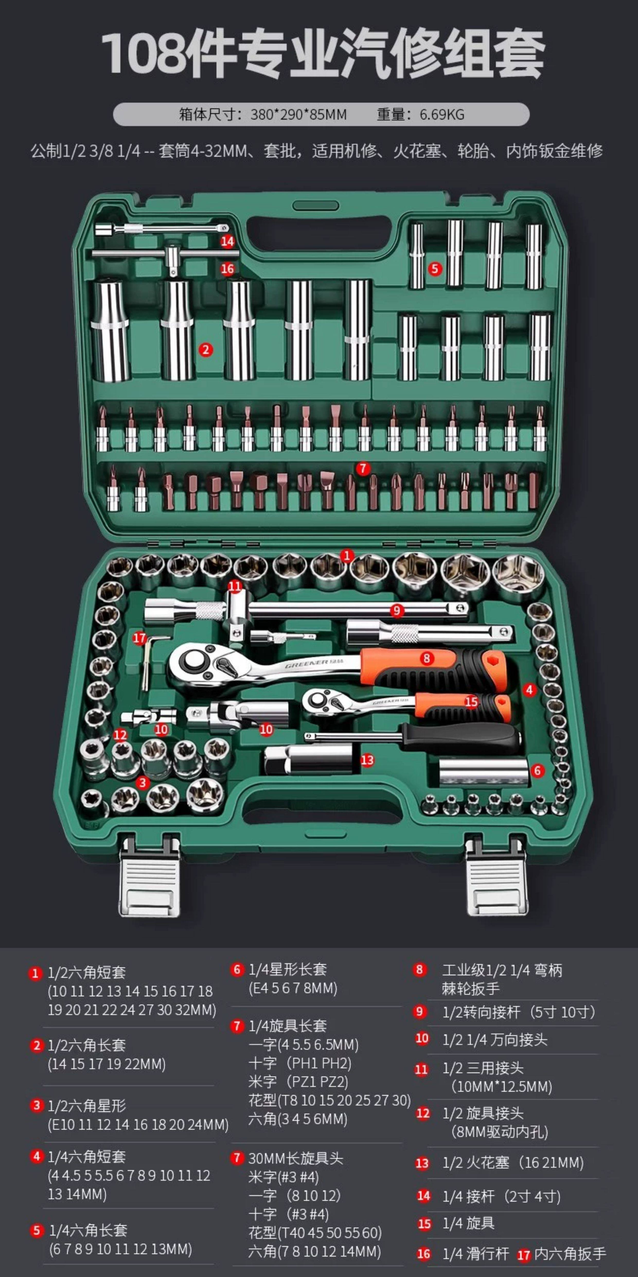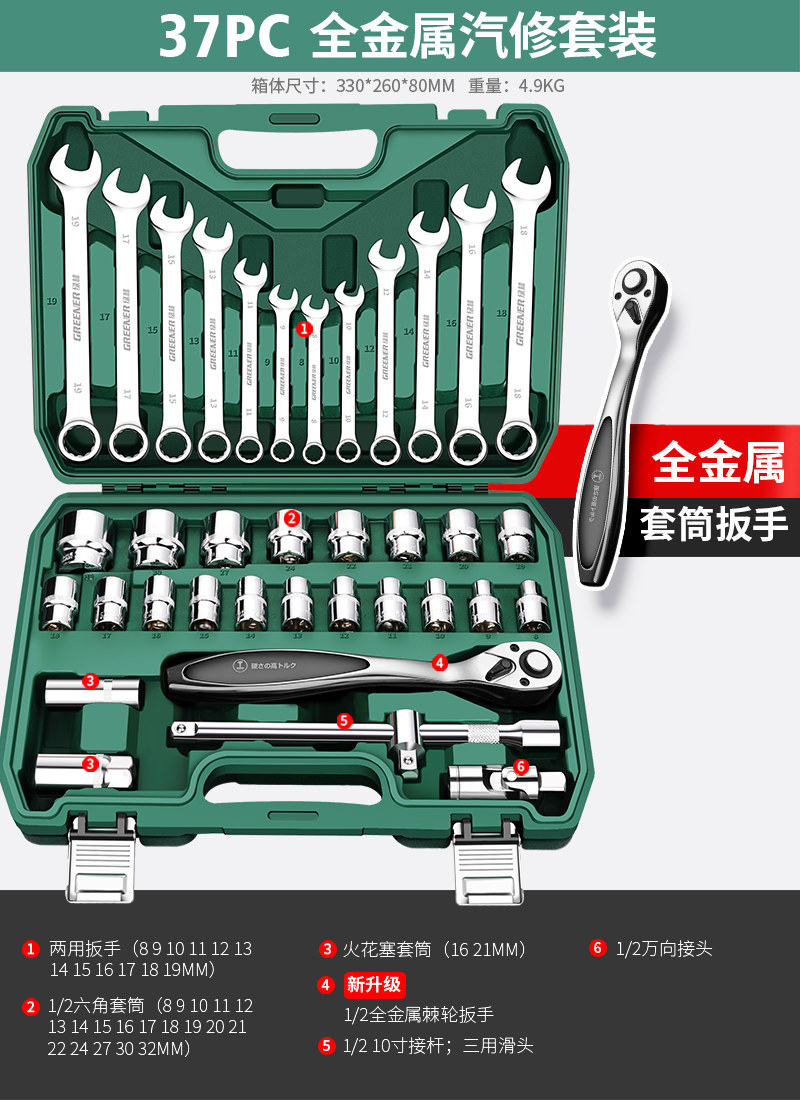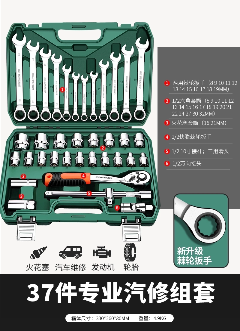 绿林37件套筒扳手工具箱套装大全汽修专用大全棘轮汽车维修理组合