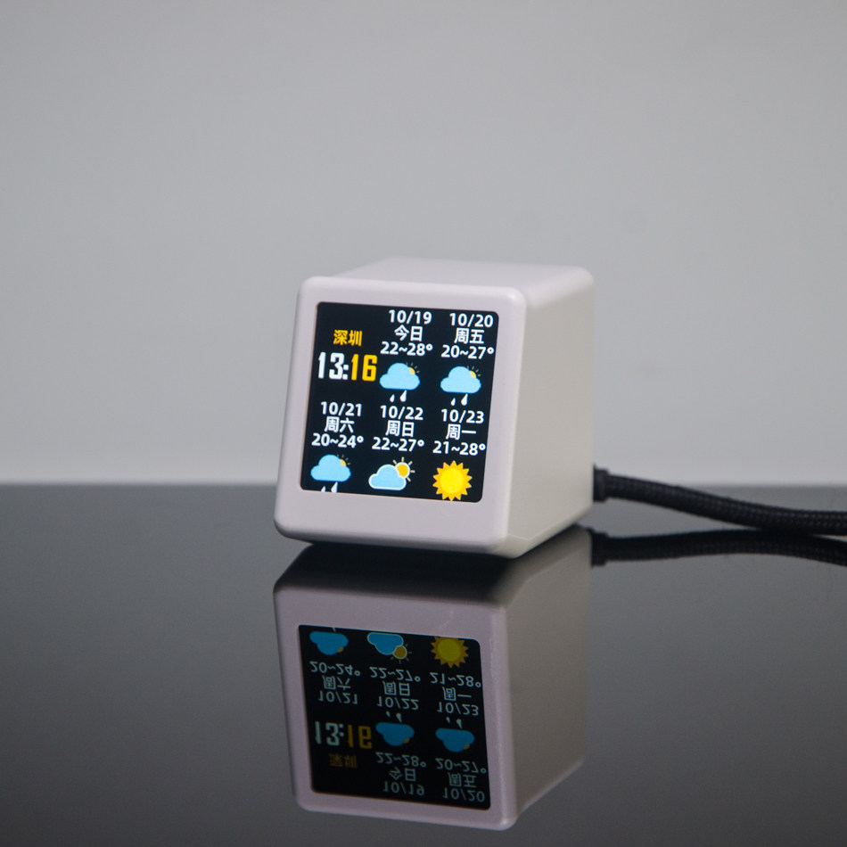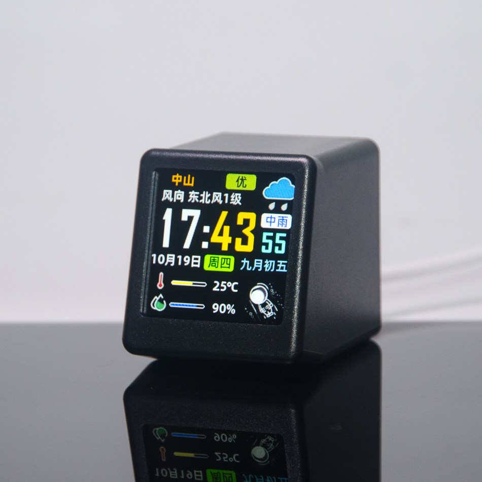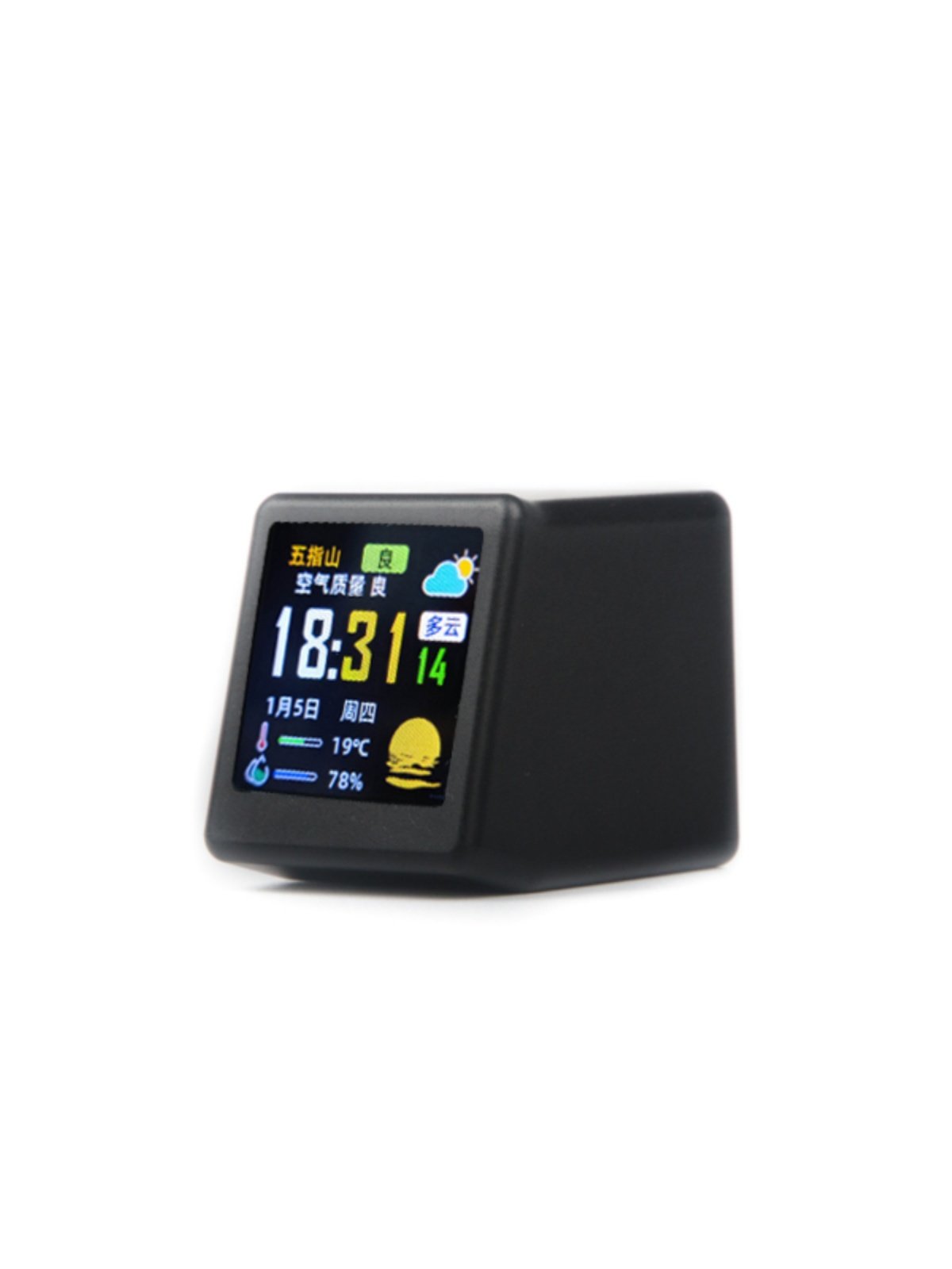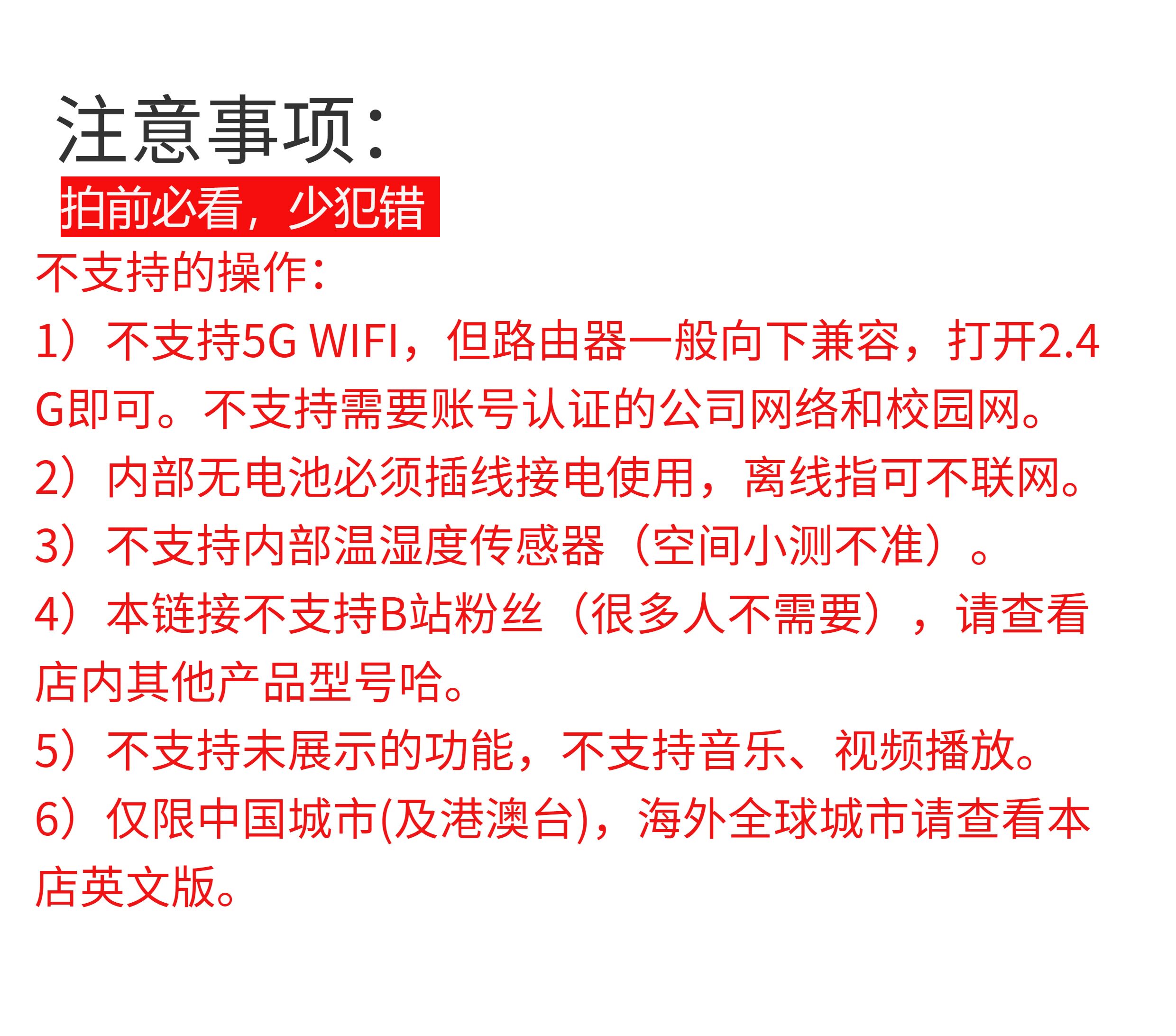 【认真阅读,节约时间,不拍错】 一、基本功能:V3 1)插电使用,Type-C接口,产品尺寸4.5cm X 3.5cm X 4cm,有很多购买客户觉得小,注意看一下,小巧才可爱呢! 2)支持2.4G WIFI联网,手机热点,自动同步天气时间,无需手动对时。 3)支持全国2000多城市、县城,直辖市可支持到区天气,支持输入城市名称直接锁定天气(非查找城市代码的笨方法) 4)可显示天气情况、(室外)温湿度、风速风向、空气质量、最高和最低温度、农历、阳历、星期。 5)支持多种右下角天气动画切换,特别好玩。 6)支持充电宝、移动电源供电,低功耗1W以内。 7)支持夜间模式,夜晚可设置关屏幕(延长使用寿命)。 8)可调时间颜色,万色可调。 9)带无线升级功能,无需安装特别刷机软件接线等复杂操作。 10)支持延迟联网(适合车内使用,车机WIFI启动慢) 11)支持12小时和24小时时间切换。 12)支持自定义NTP时间服务器。 二、全新一代升级内容:V4/V5/V6 1)支持自定义上传全屏GIF动画,240x240像素大小,可用总空间800KB。 2)支持天气时钟右下角小动画自定义上传,80x80像素大小,共享总空间800KB。 3)多主题,共9大主题,并且支持多主题自动切换。 4)全新设计操作后台,简单高效,支持鸿蒙、苹果、安卓、Windows、Linux系统。 5)动画图片可用素材1000+张例图。 7)相册模式支持多达30张JPG图片(共享总空间800KB)。 8)股市,可以实时跟踪股票价格,自定义刷新间隔,支持A股和港股。 9)天数倒计时功能,可以显示距离某天(中高考等)还有多少天数。 10)增加超大字体,距离4-5米可看清。 11)天气预报功能,可显示5日天气预报。 12)自定义开机jpg图片或gif动画,可加品牌LOGO,模拟系统启动等动画。 13)支持华硕路由器(2.4G频段) 14)支持手动配网,可连接隐藏2.4G WIFI。 15)【可选升级配置】支持6组闹钟,只响一次,周一到周五,周一到周六,周一到周日。 16)【可选升级配置】支持离线模式,时间记忆,快速开机,无需联网,时间准确,车载必备。 17)车载推荐:V5/V6支持离线时钟(不联网指不联网可以正常显示时间, Offline的意思)