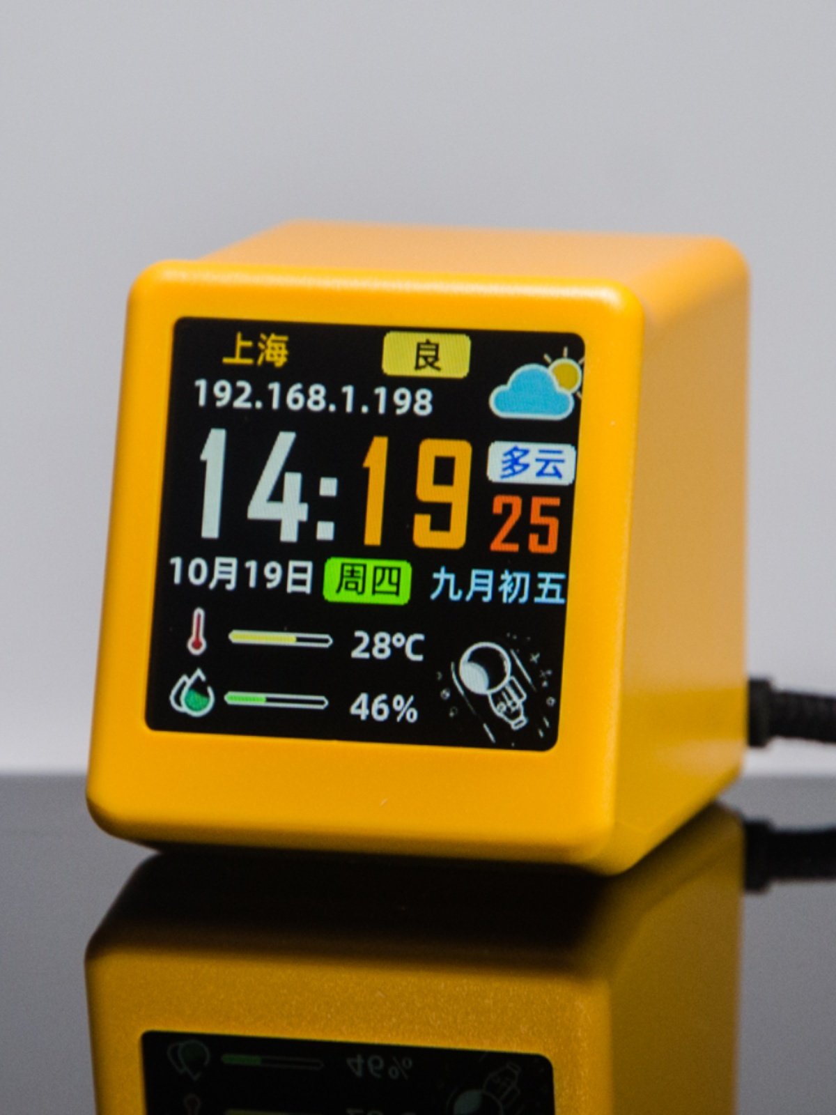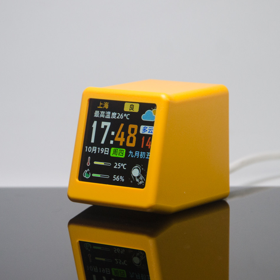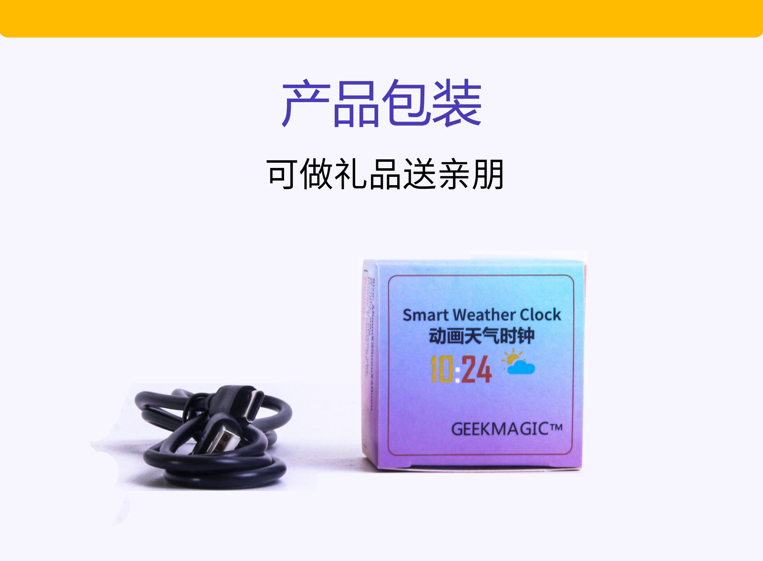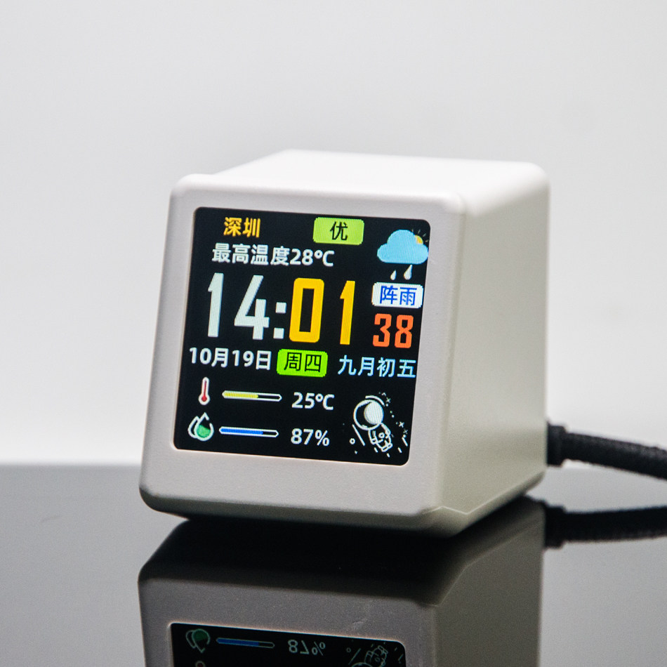 【认真阅读,节约时间,不拍错】 一、基本功能:V3 1)插电使用,Type-C接口,产品尺寸4.5cm X 3.5cm X 4cm,有很多购买客户觉得小,注意看一下,小巧才可爱呢! 2)支持2.4G WIFI联网,手机热点,自动同步天气时间,无需手动对时。 3)支持全国2000多城市、县城,直辖市可支持到区天气,支持输入城市名称直接锁定天气(非查找城市代码的笨方法) 4)可显示天气情况、(室外)温湿度、风速风向、空气质量、最高和最低温度、农历、阳历、星期。 5)支持多种右下角天气动画切换,特别好玩。 6)支持充电宝、移动电源供电,低功耗1W以内。 7)支持夜间模式,夜晚可设置关屏幕(延长使用寿命)。 8)可调时间颜色,万色可调。 9)带无线升级功能,无需安装特别刷机软件接线等复杂操作。 10)支持延迟联网(适合车内使用,车机WIFI启动慢) 11)支持12小时和24小时时间切换。 12)支持自定义NTP时间服务器。 二、全新一代升级内容:V4/V5/V6 1)支持自定义上传全屏GIF动画,240x240像素大小,可用总空间800KB。 2)支持天气时钟右下角小动画自定义上传,80x80像素大小,共享总空间800KB。 3)多主题,共9大主题,并且支持多主题自动切换。 4)全新设计操作后台,简单高效,支持鸿蒙、苹果、安卓、Windows、Linux系统。 5)动画图片可用素材1000+张例图。 7)相册模式支持多达30张JPG图片(共享总空间800KB)。 8)股市,可以实时跟踪股票价格,自定义刷新间隔,支持A股和港股。 9)天数倒计时功能,可以显示距离某天(中高考等)还有多少天数。 10)增加超大字体,距离4-5米可看清。 11)天气预报功能,可显示5日天气预报。 12)自定义开机jpg图片或gif动画,可加品牌LOGO,模拟系统启动等动画。 13)支持华硕路由器(2.4G频段) 14)支持手动配网,可连接隐藏2.4G WIFI。 15)【可选升级配置】支持6组闹钟,只响一次,周一到周五,周一到周六,周一到周日。 16)【可选升级配置】支持离线模式,时间记忆,快速开机,无需联网,时间准确,车载必备。 17)车载推荐:V5/V6支持离线时钟(不联网指不联网可以正常显示时间, Offline的意思)