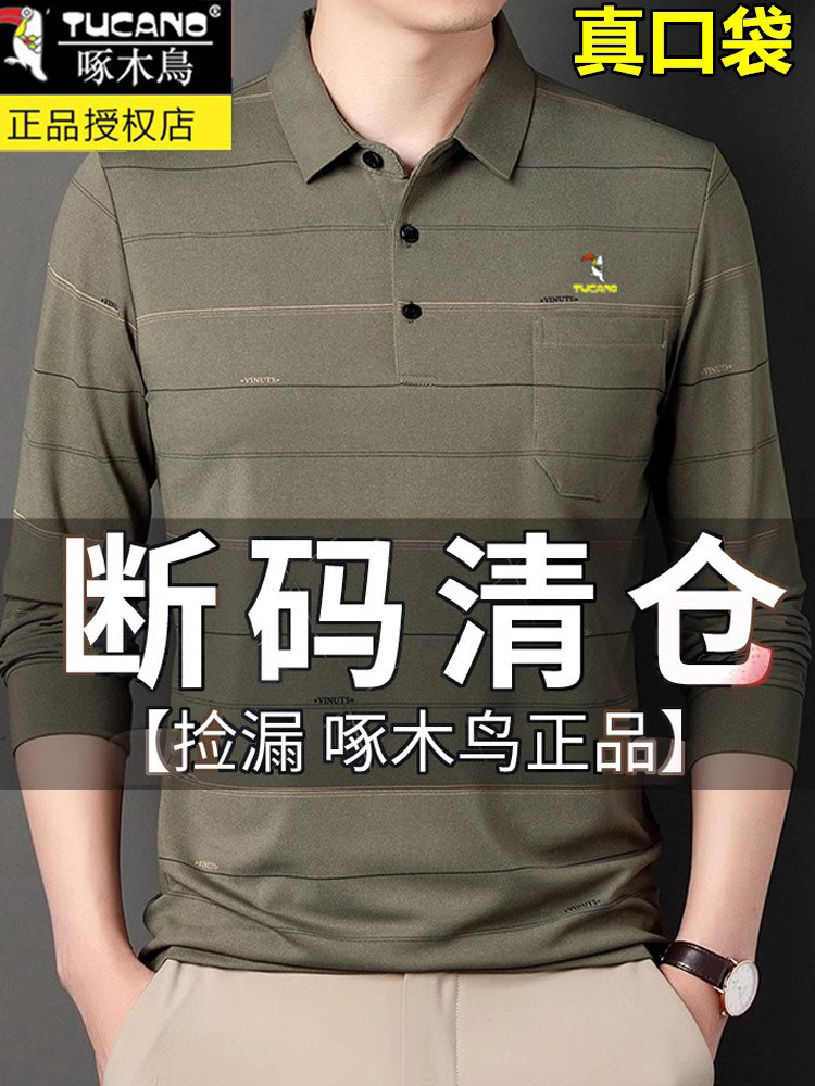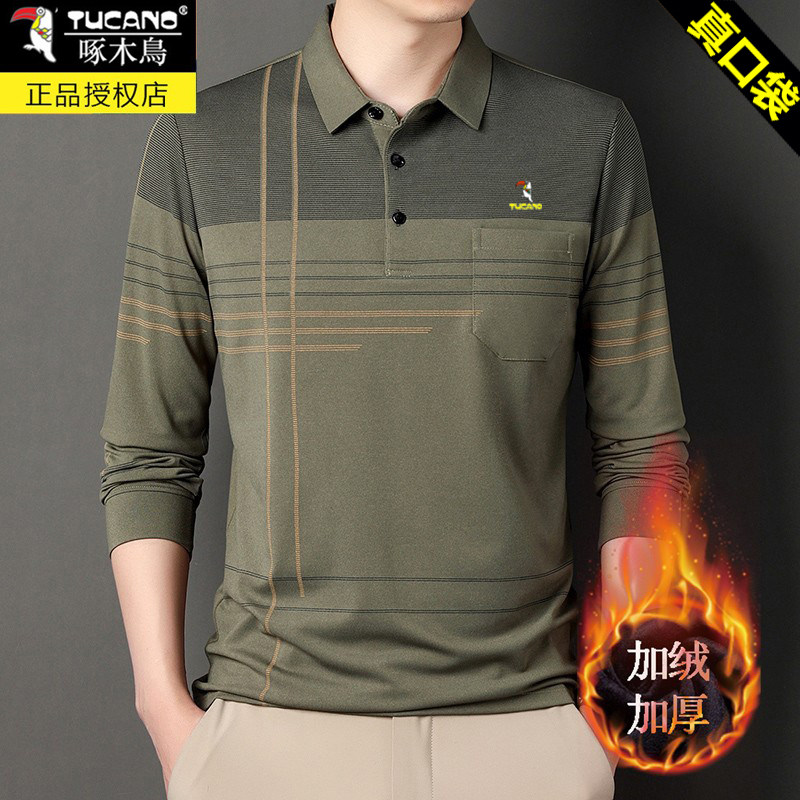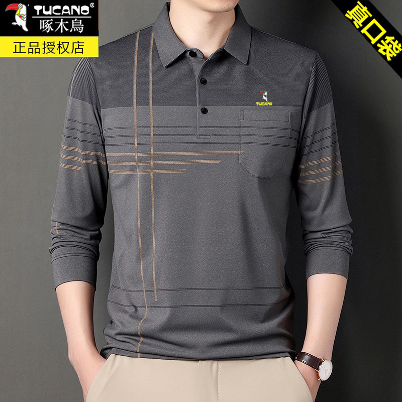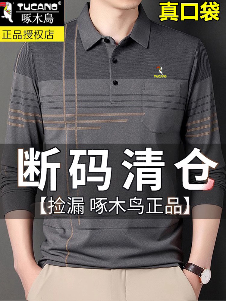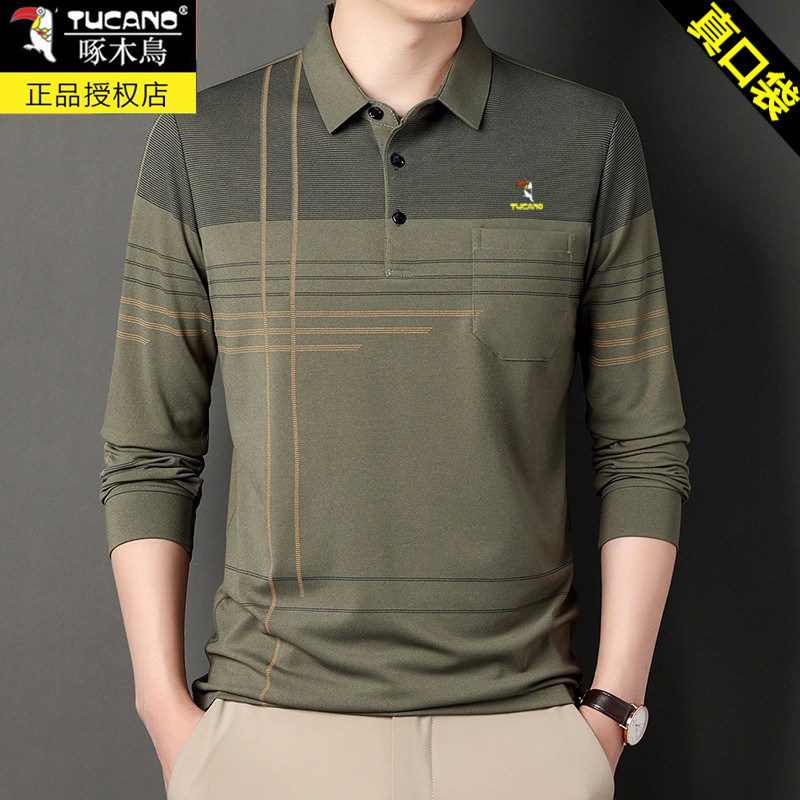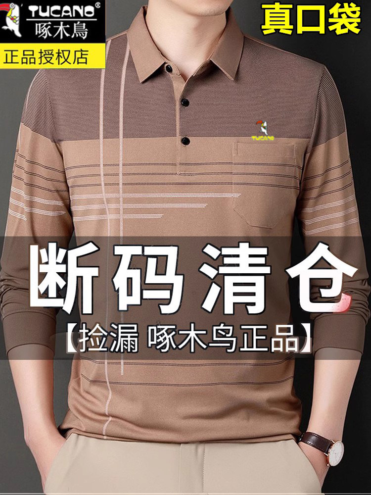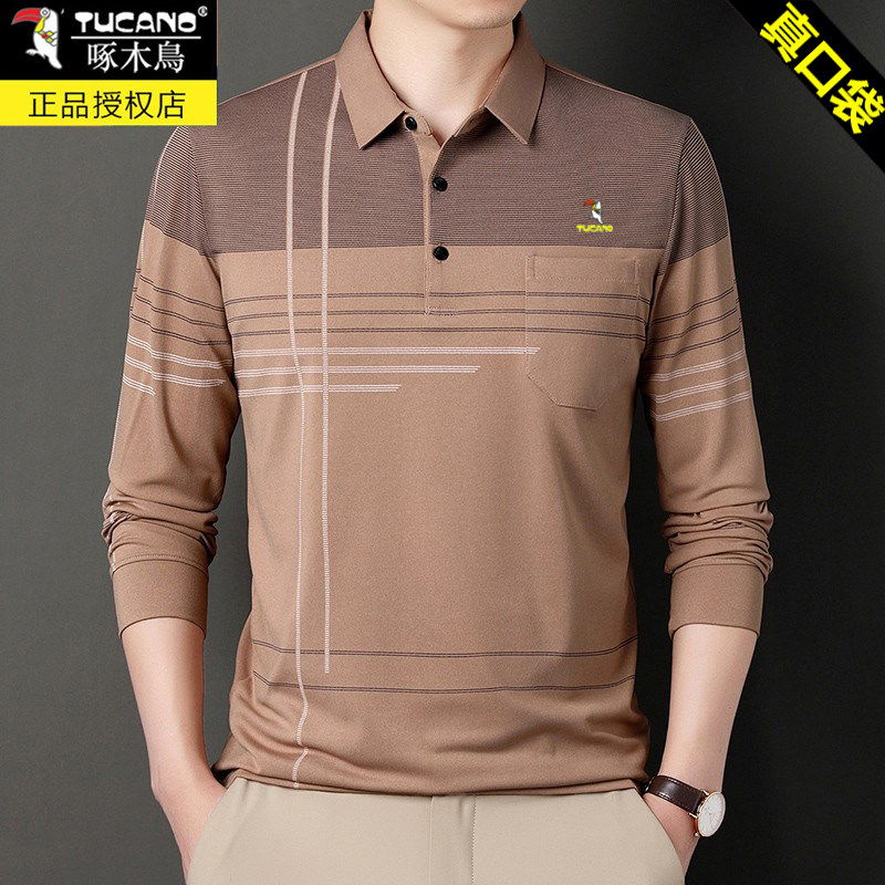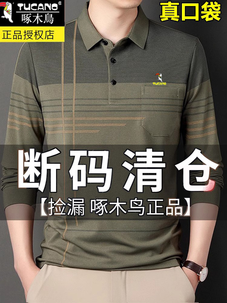 HomeProducts啄木鸟爸爸春装长袖t恤纯棉父亲中老年秋衣男有领口袋打底衫上衣