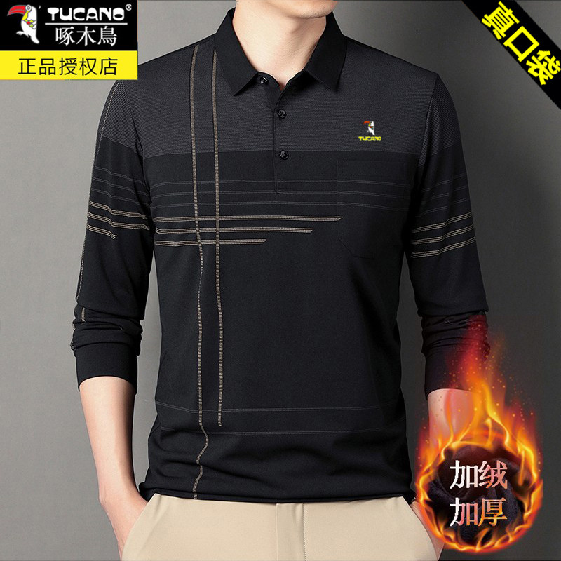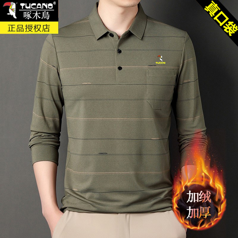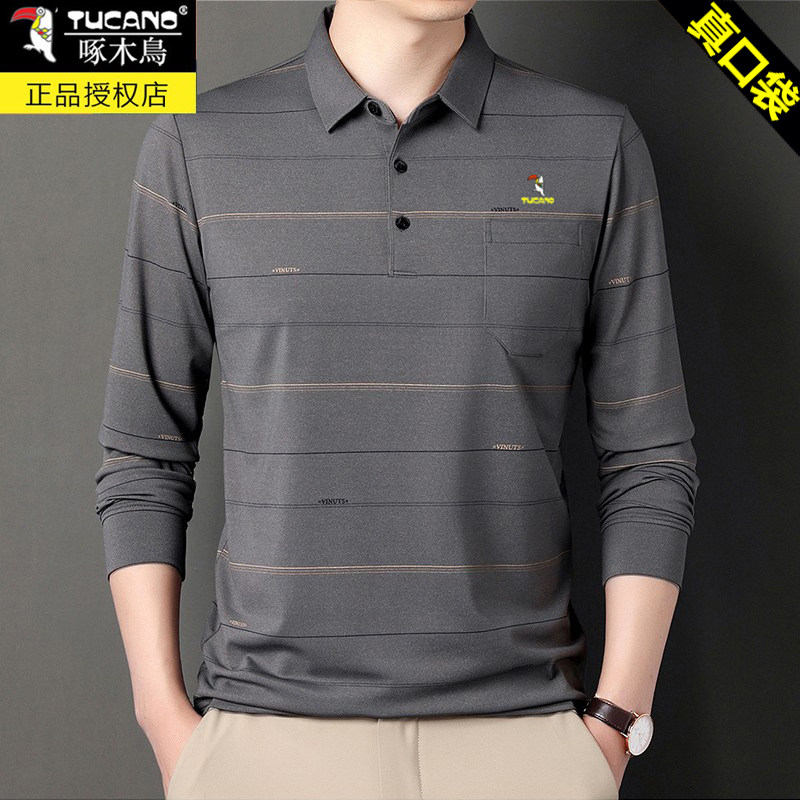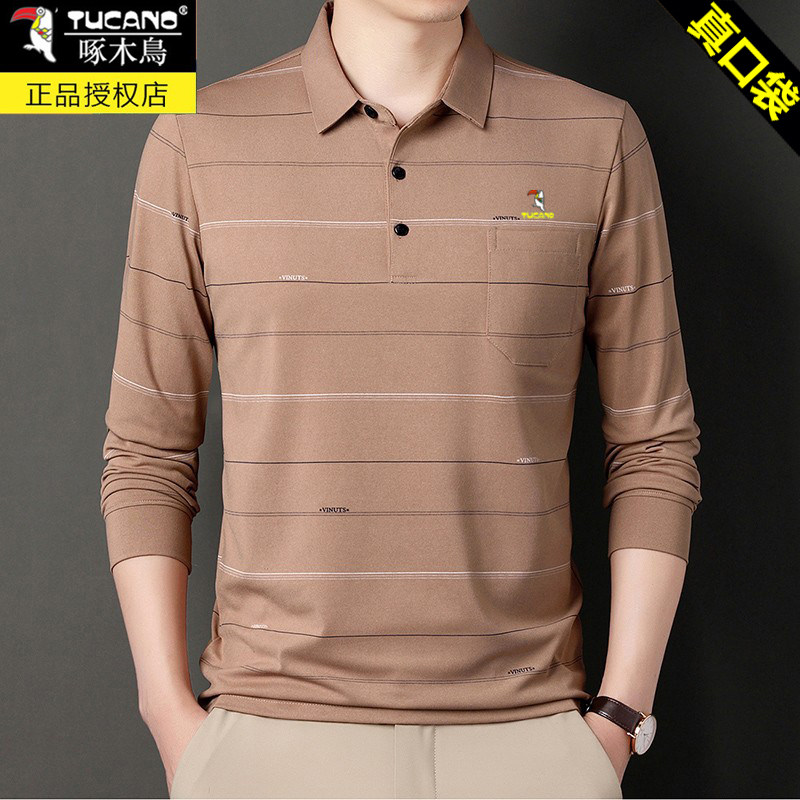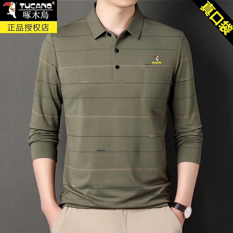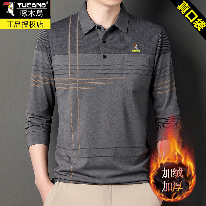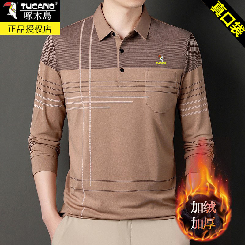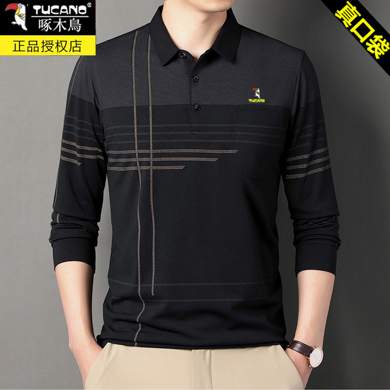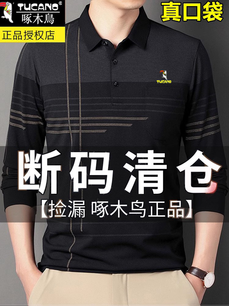 HomeProducts啄木鸟爸爸春装长袖t恤纯棉父亲中老年秋衣男有领口袋打底衫上衣