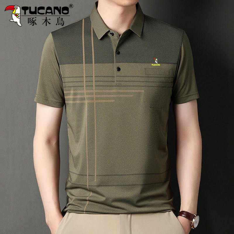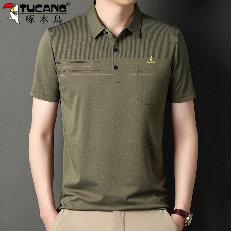 啄木鸟爸爸春装长袖t恤纯棉父亲中老年秋衣男有领口袋打底衫上衣