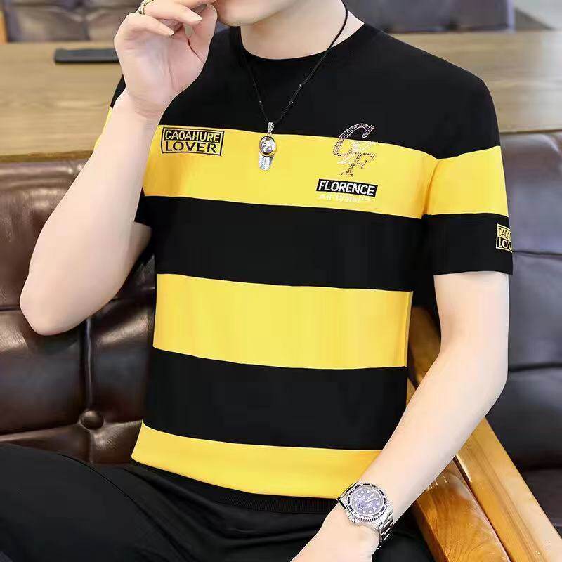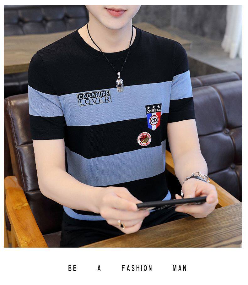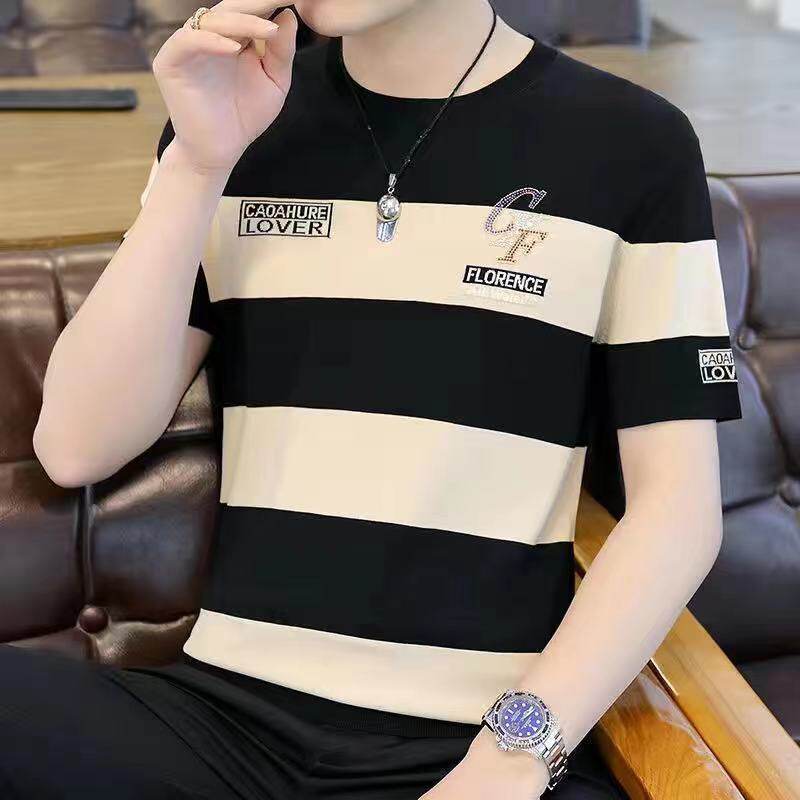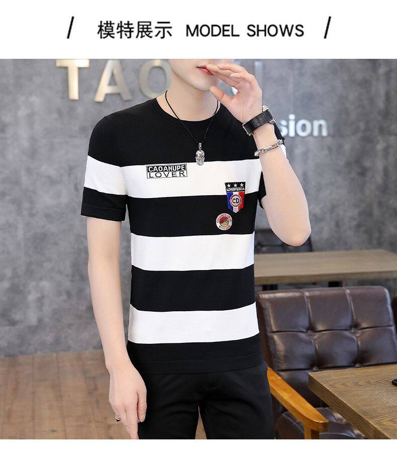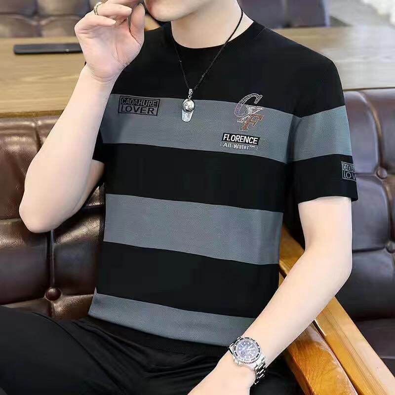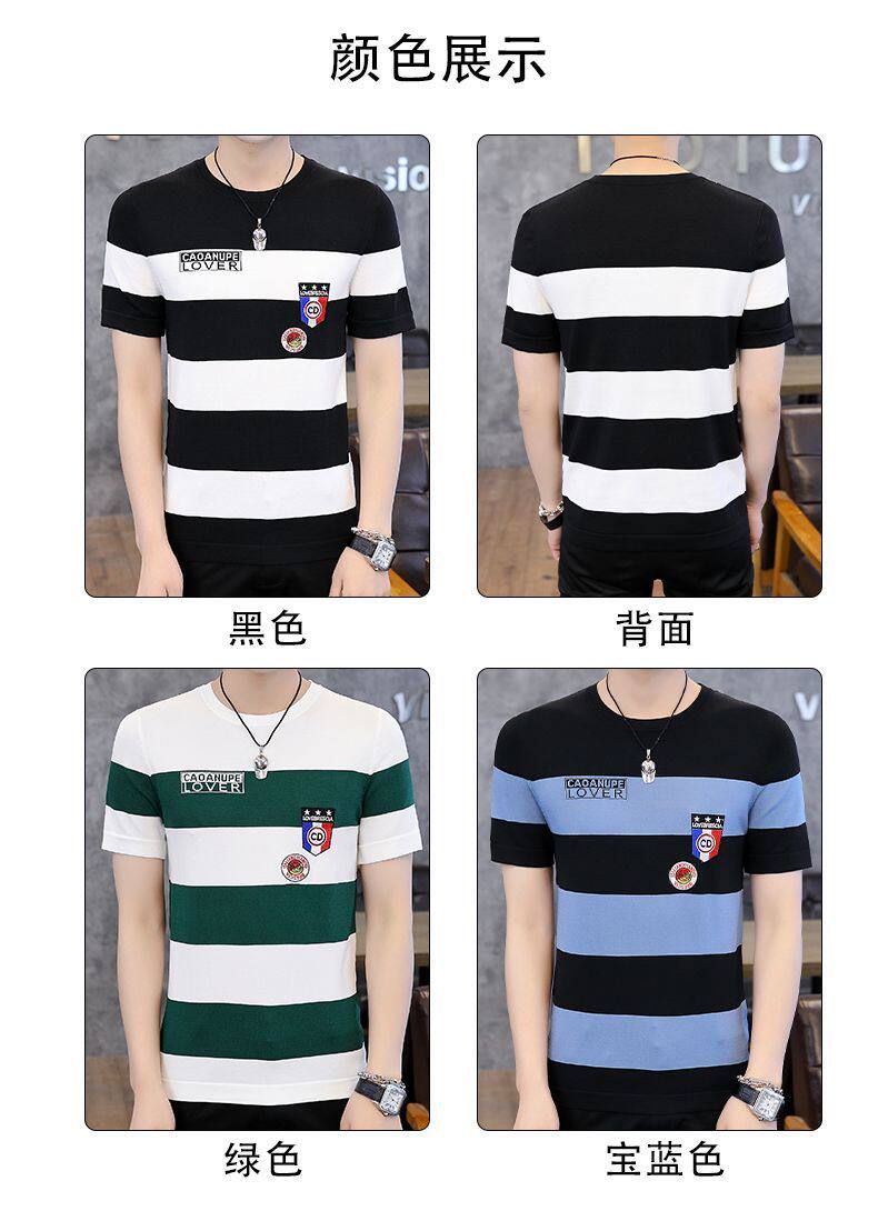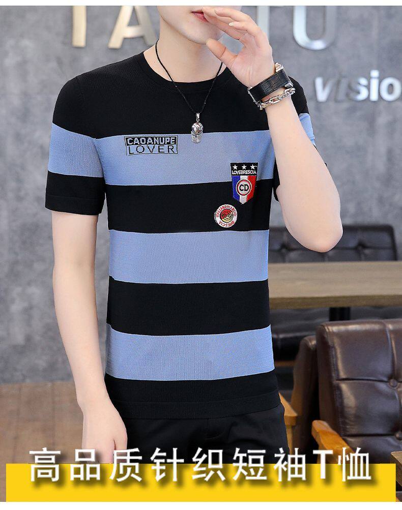9.9清仓欧洲站男士短袖冰丝条纹印花夏季新款青年潮流个性圆领t恤