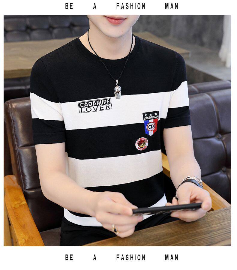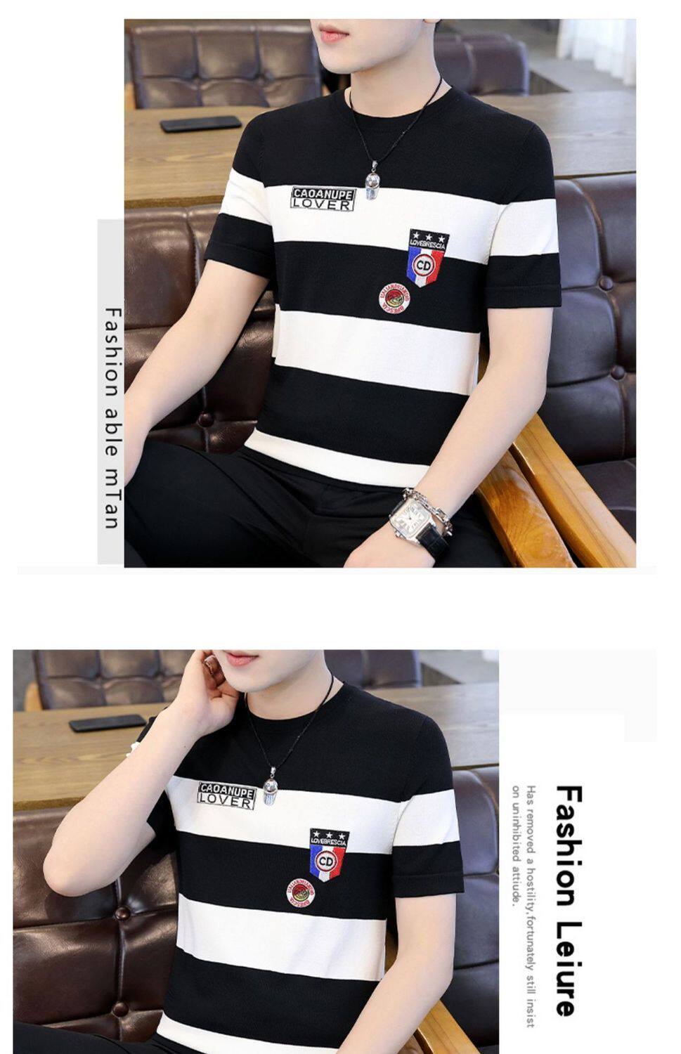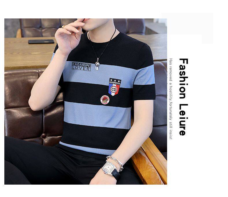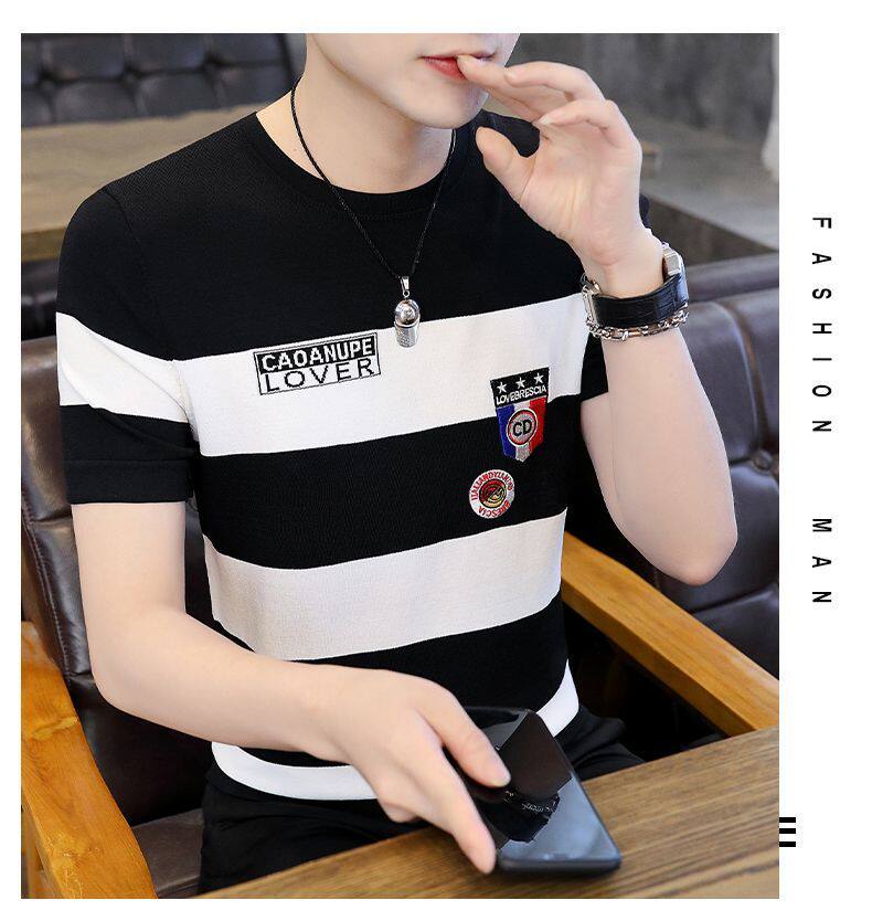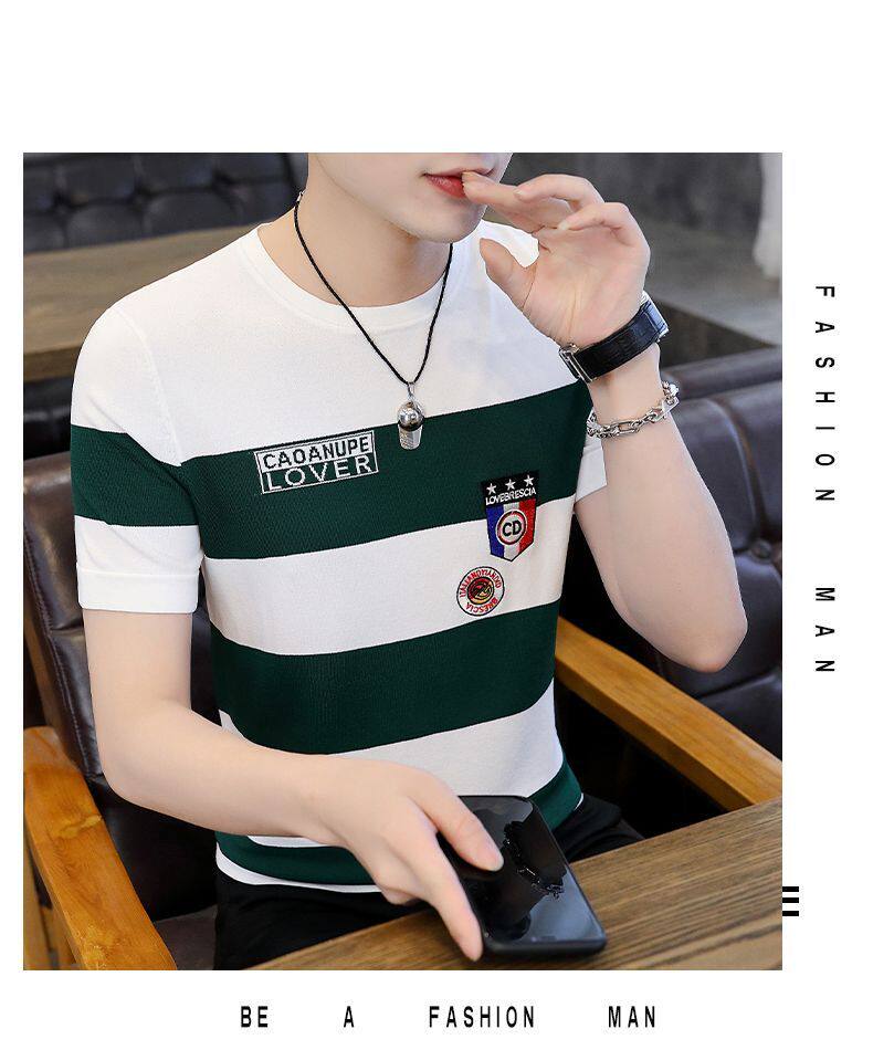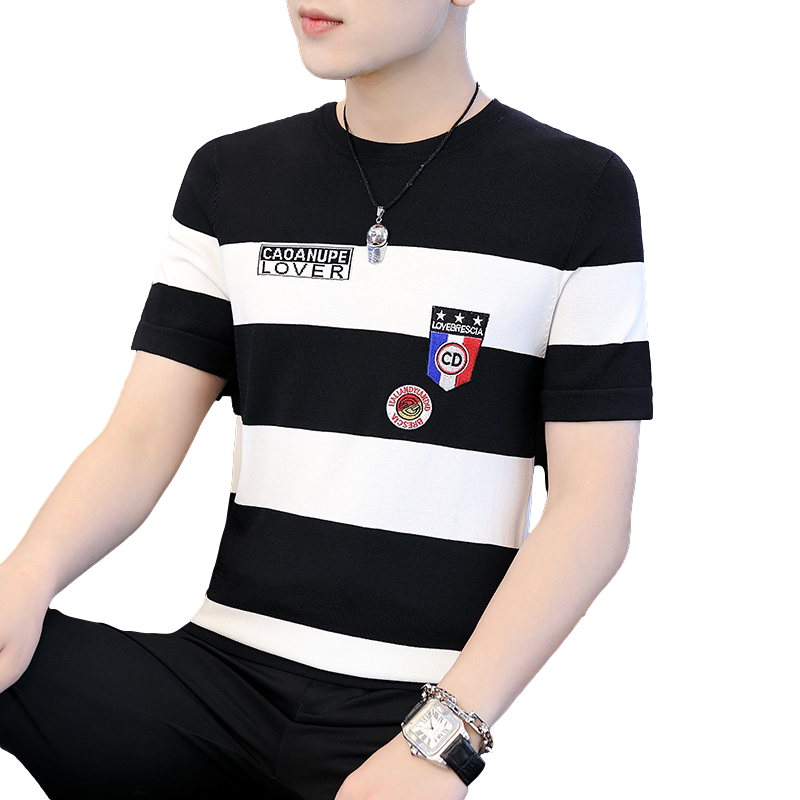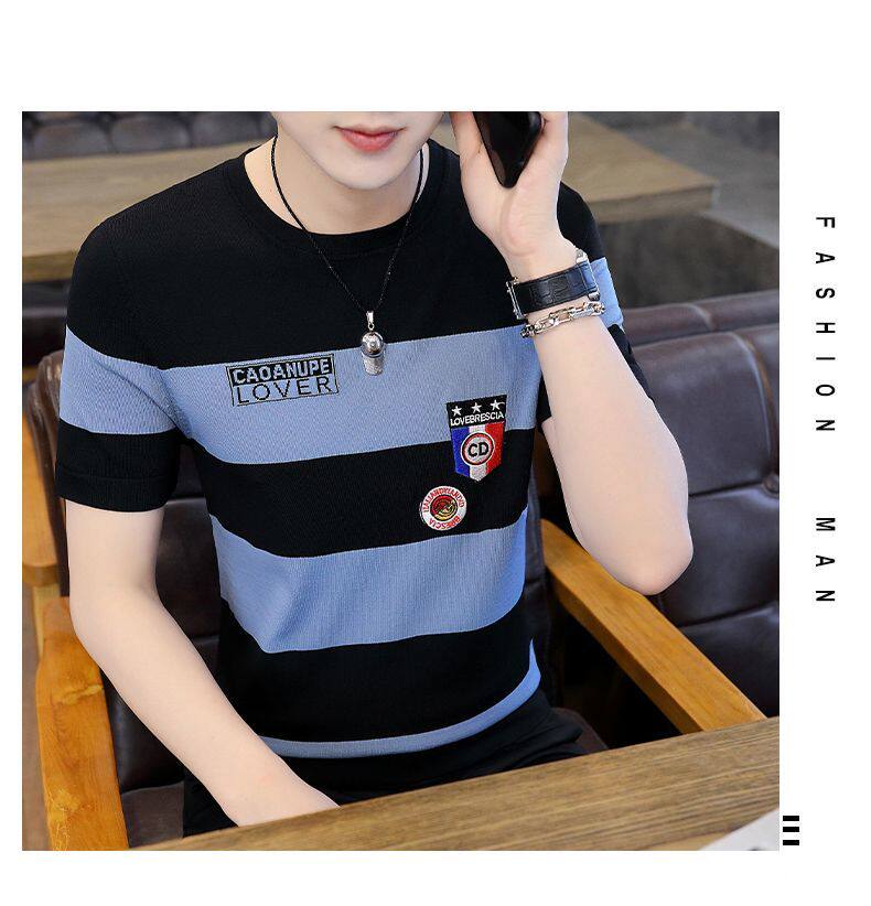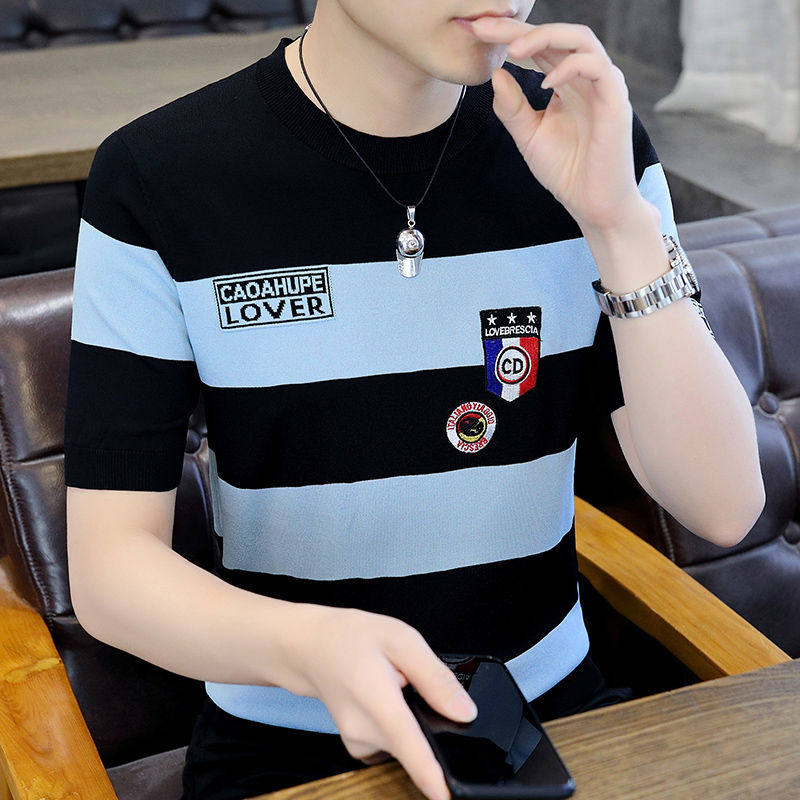 9.9清仓欧洲站男士短袖冰丝条纹印花夏季新款青年潮流个性圆领t恤