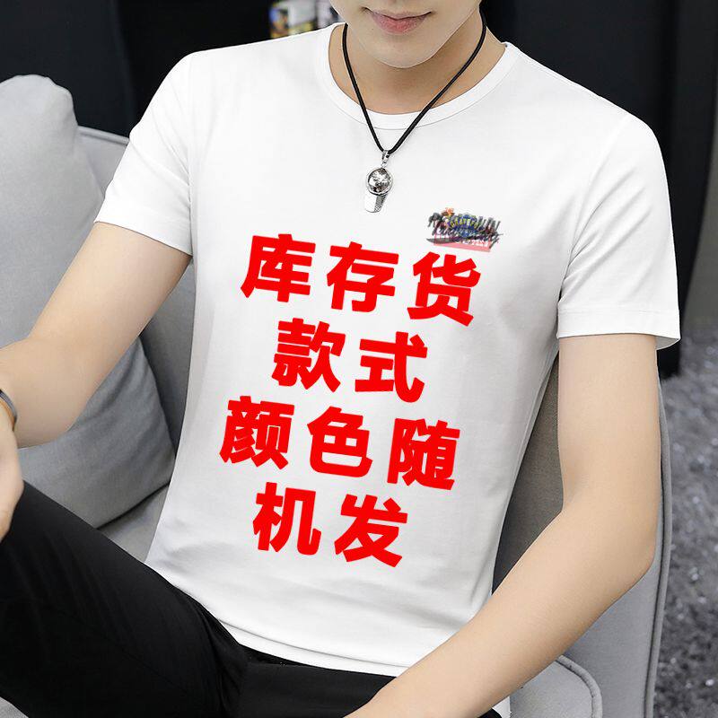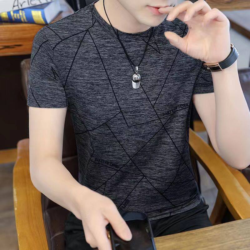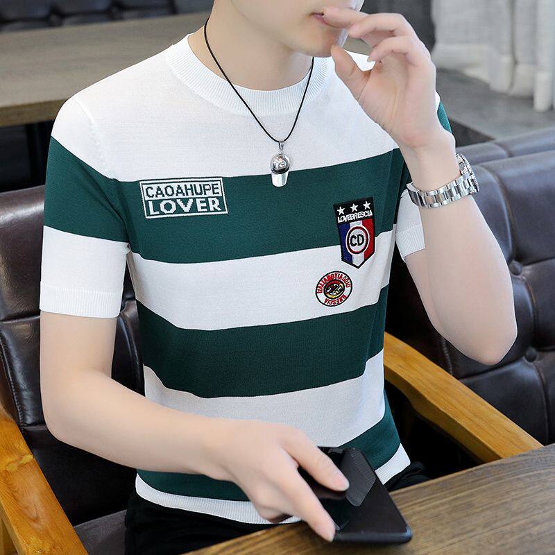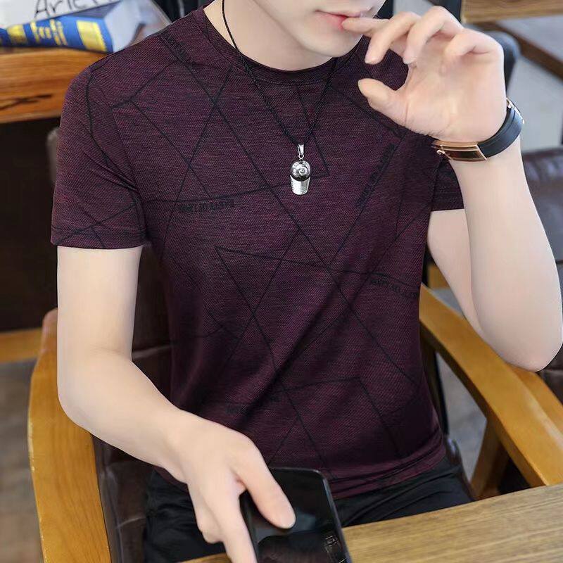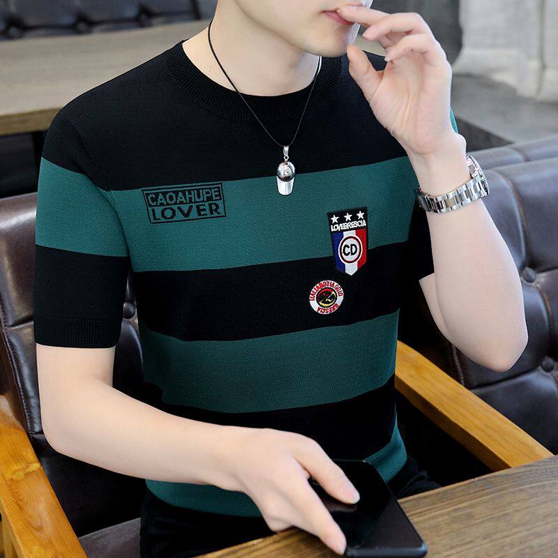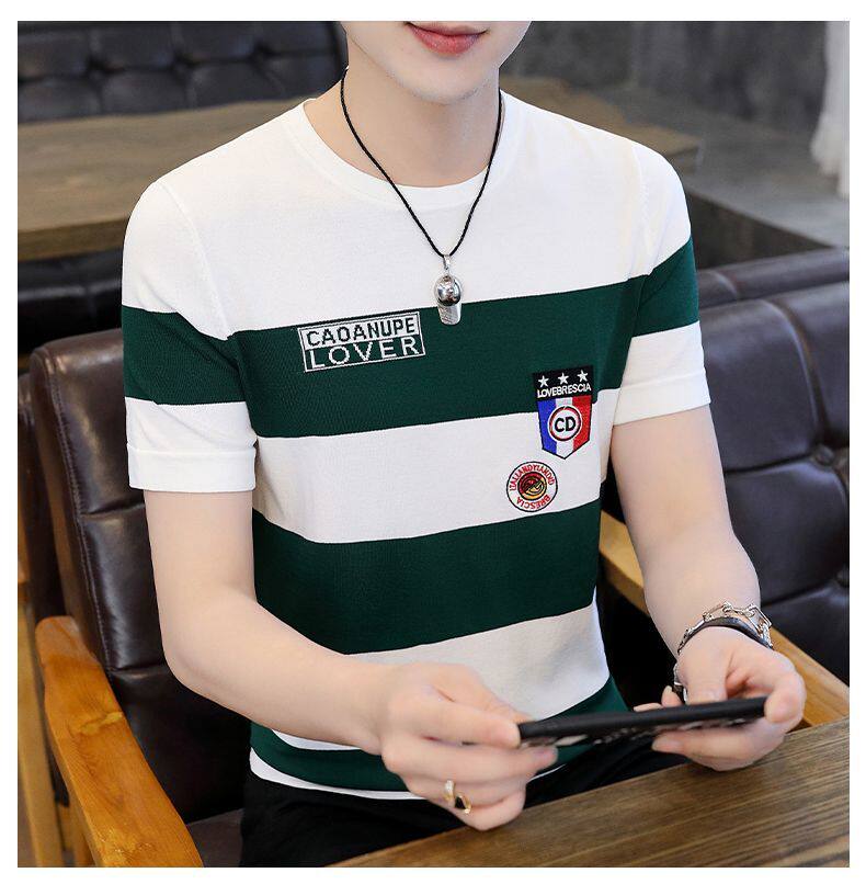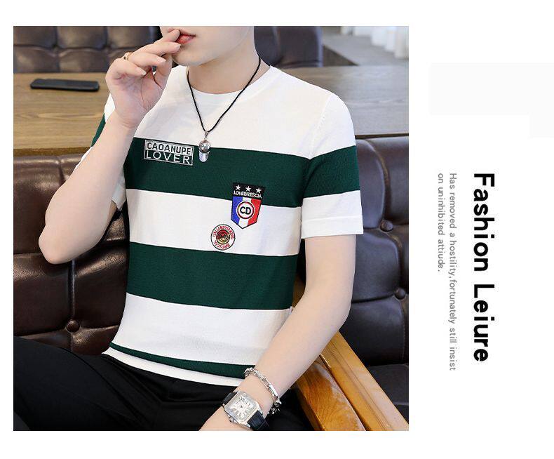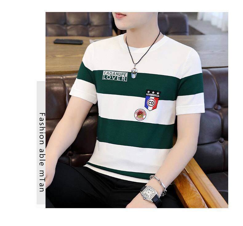 9.9清仓欧洲站男士短袖冰丝条纹印花夏季新款青年潮流个性圆领t恤