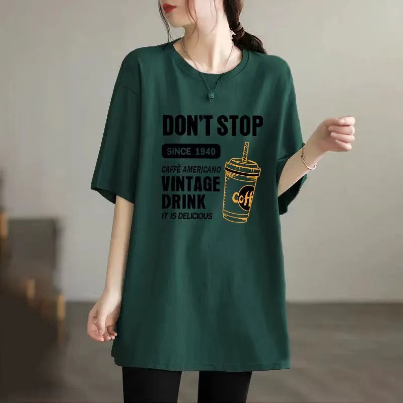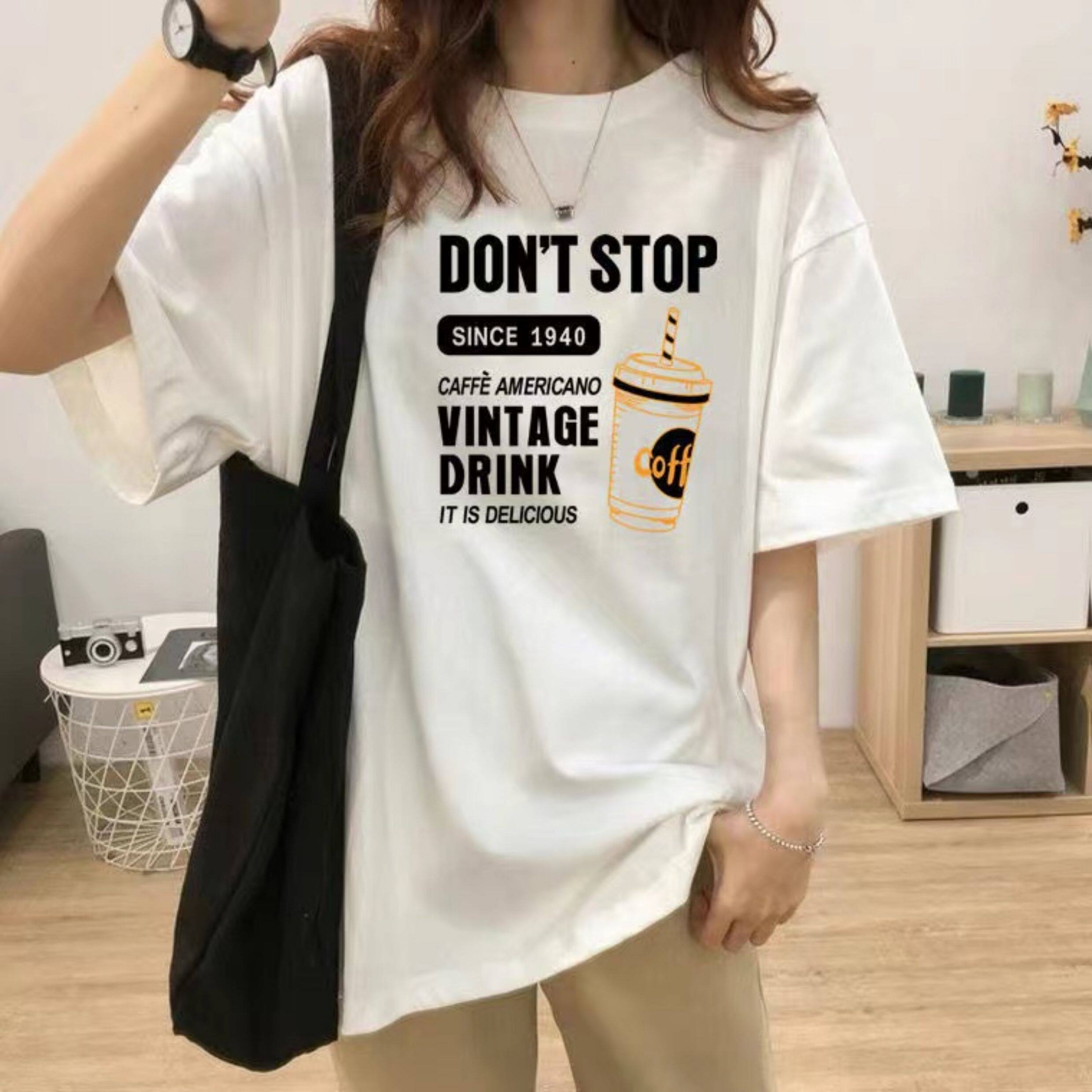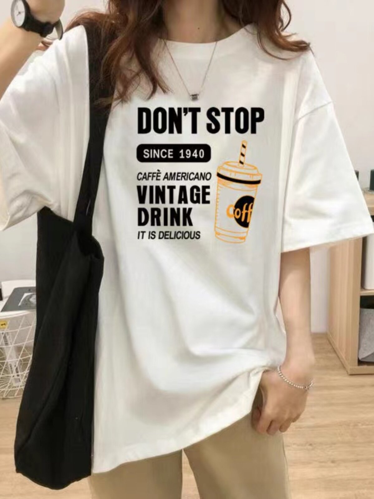 【咖啡字母】 夏季纯棉印花t恤女韩版落肩宽松圆领设计感小众体恤