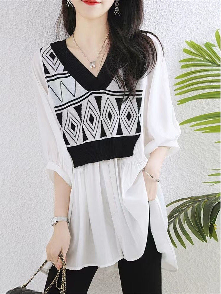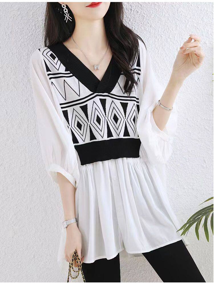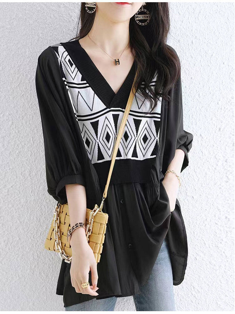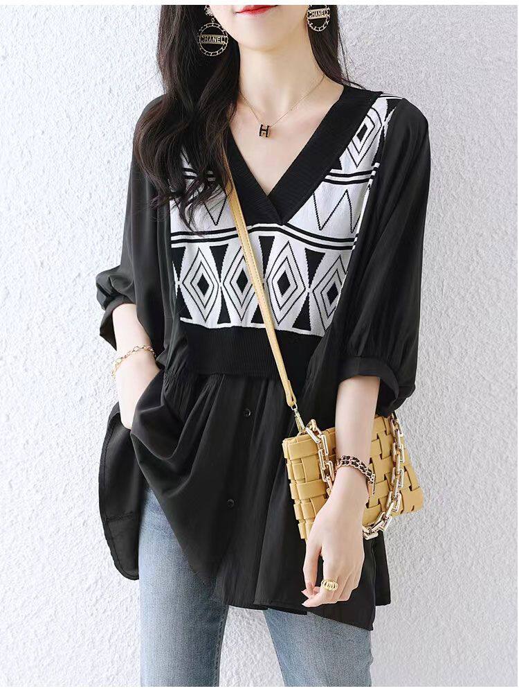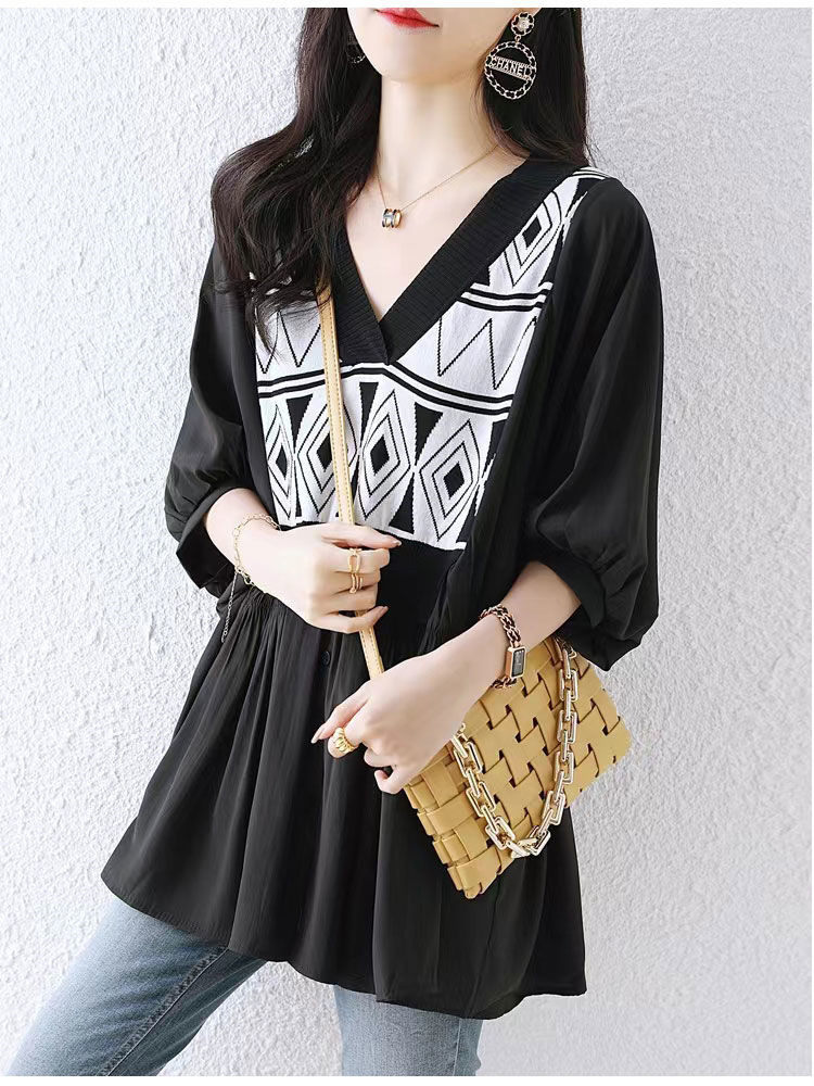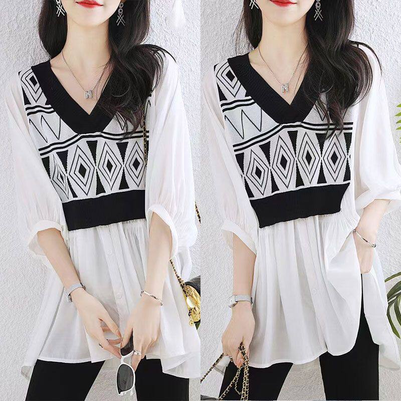 HomeProducts七分袖V领套头衬衫妈妈装夏款遮肚洋气减龄小衫气质时尚雪纺上衣