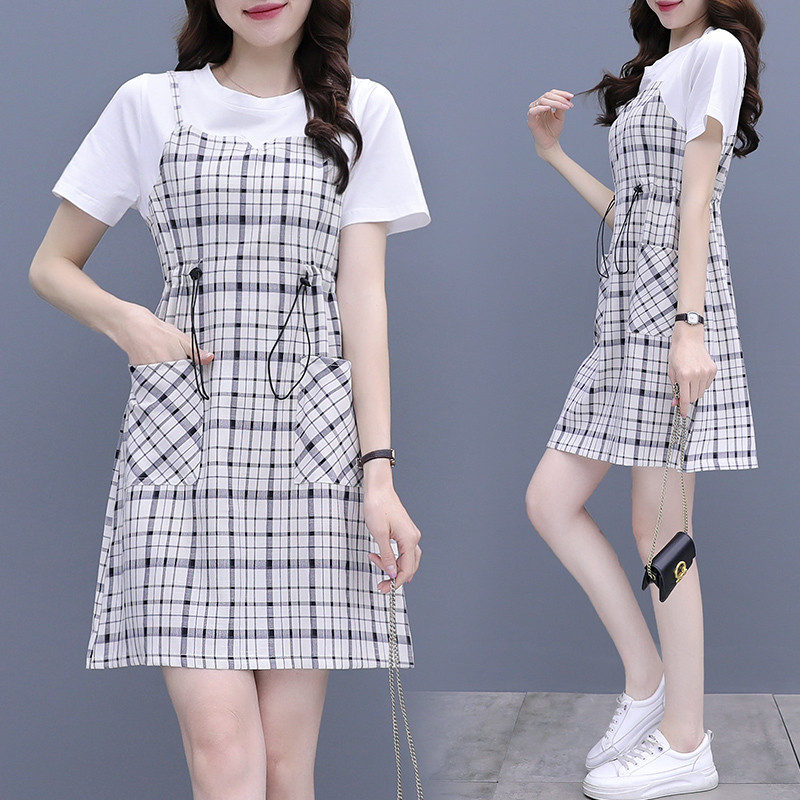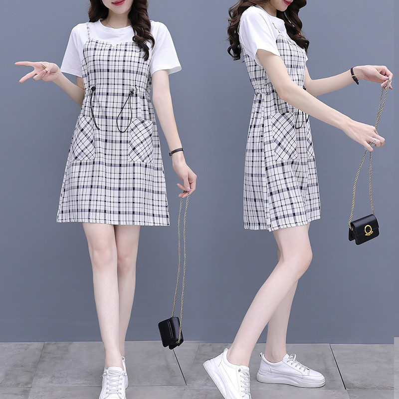 小个子假两件短袖连衣裙子女2024夏季新款大码遮肚收腰显瘦裙子潮
