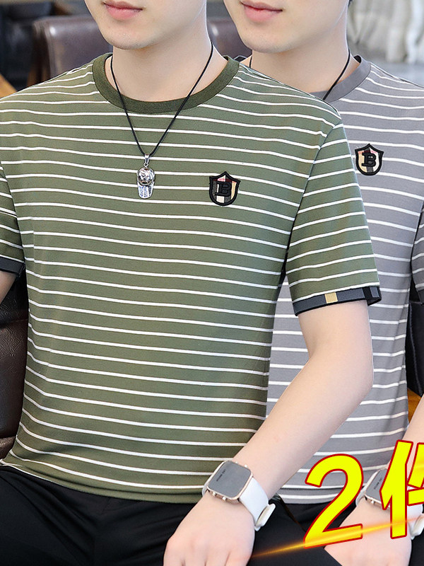 HomeProducts2025新款男士短袖t恤潮流纯棉条纹潮牌百搭修身打底衫半袖上衣夏