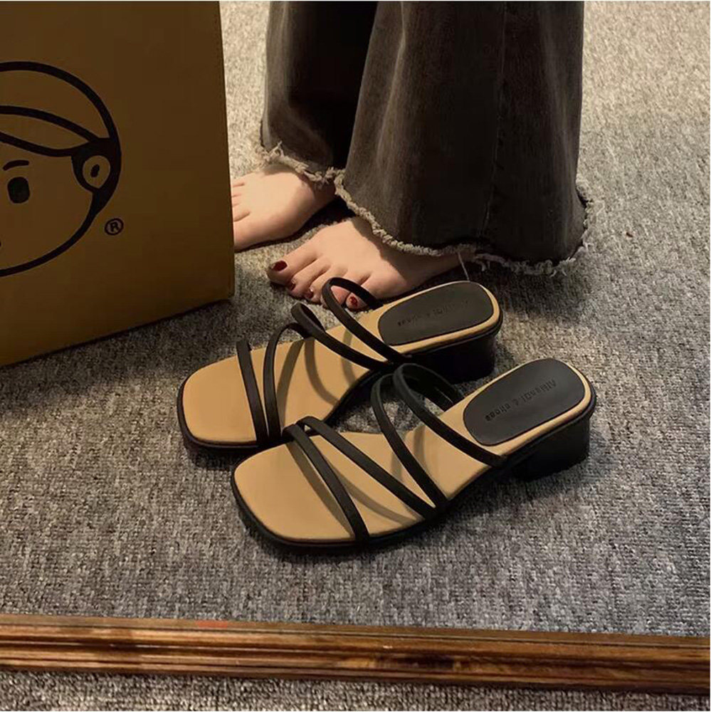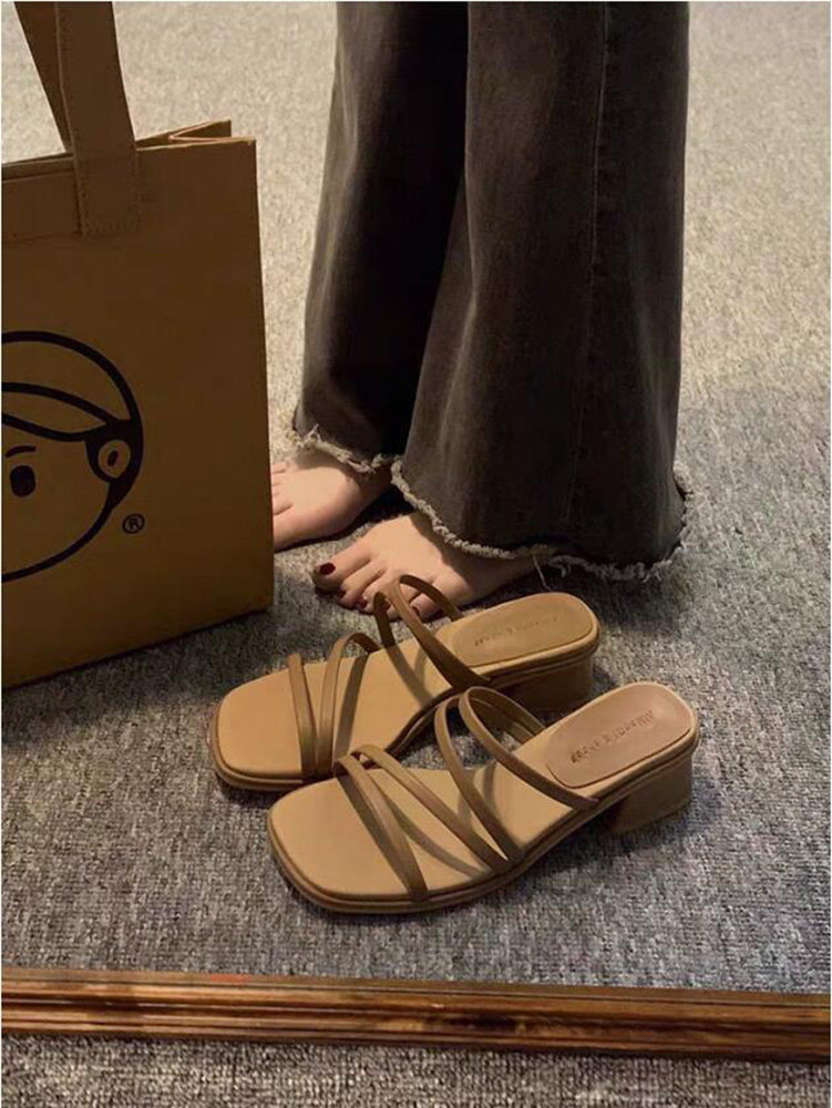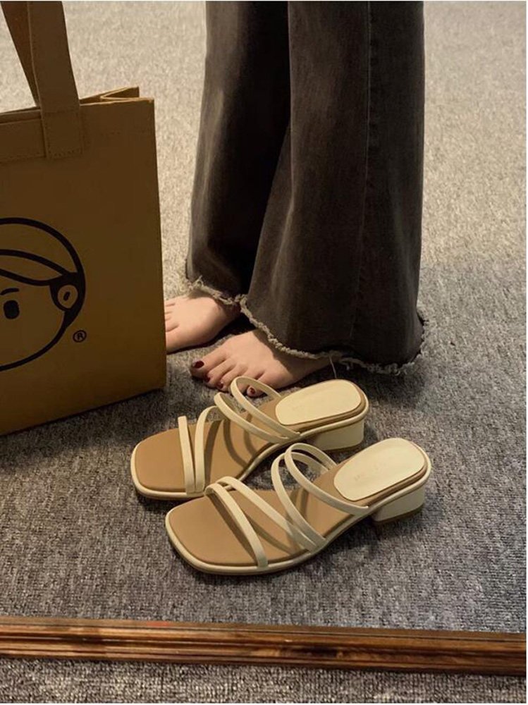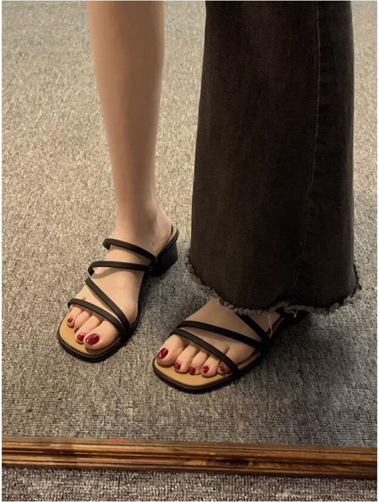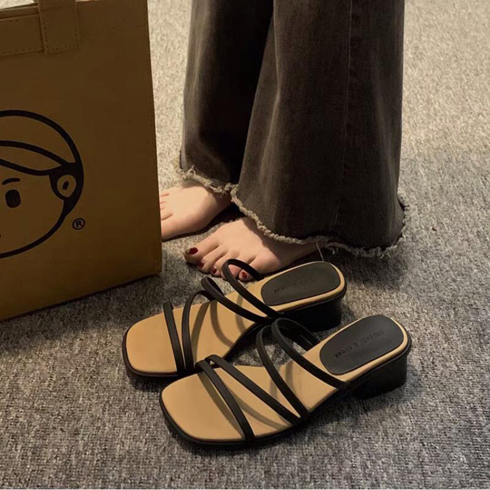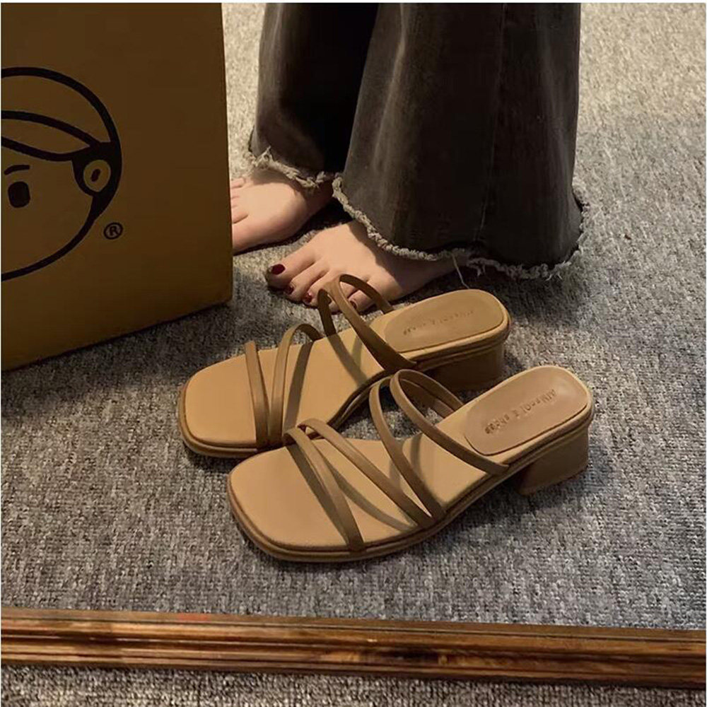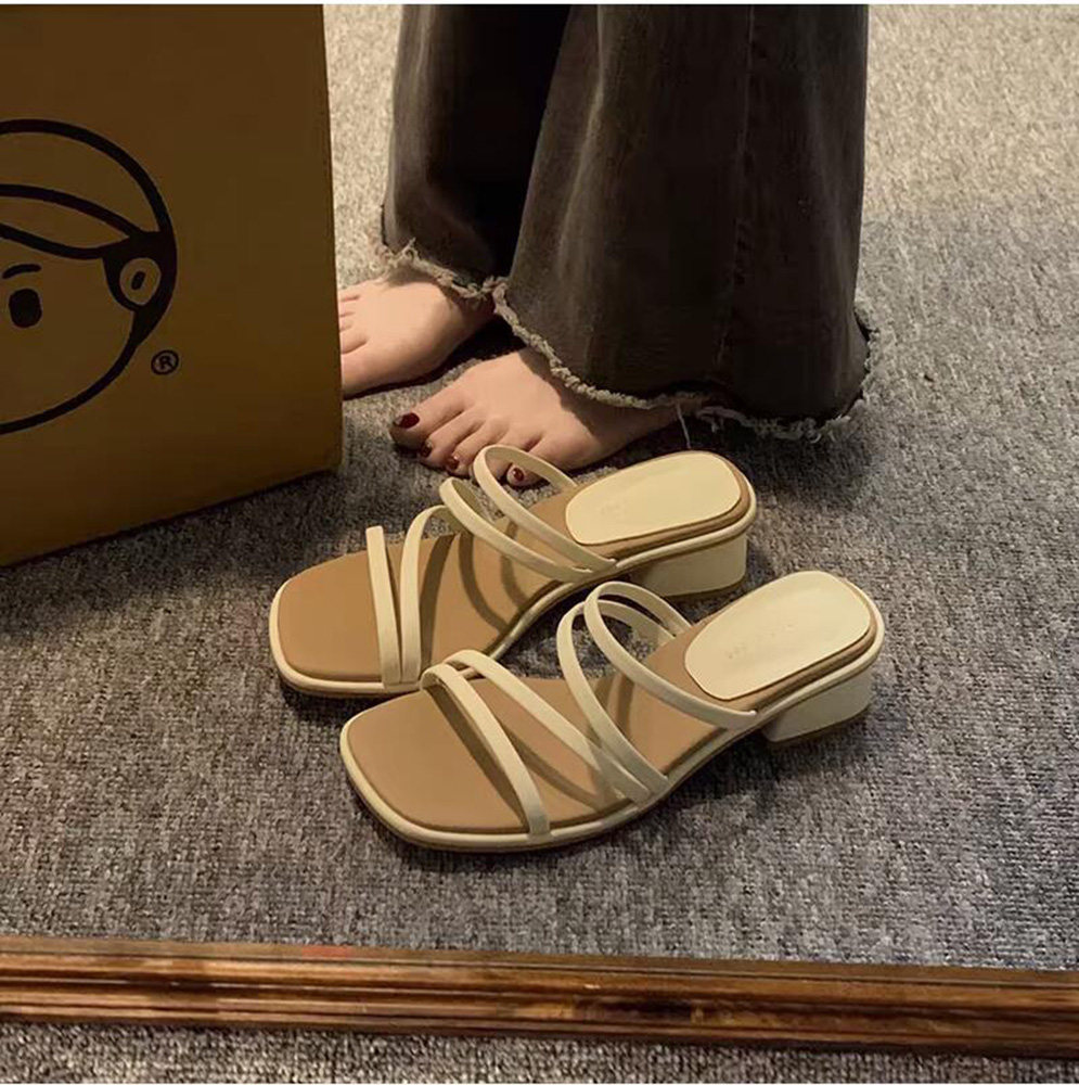 法式粗跟一字拖鞋女2024年夏季新款时尚仙女风细带百搭方头凉拖鞋