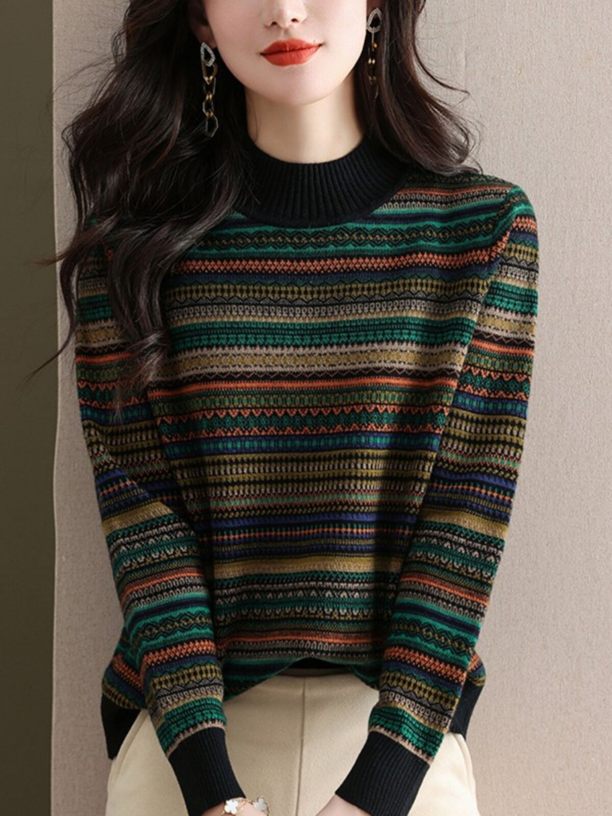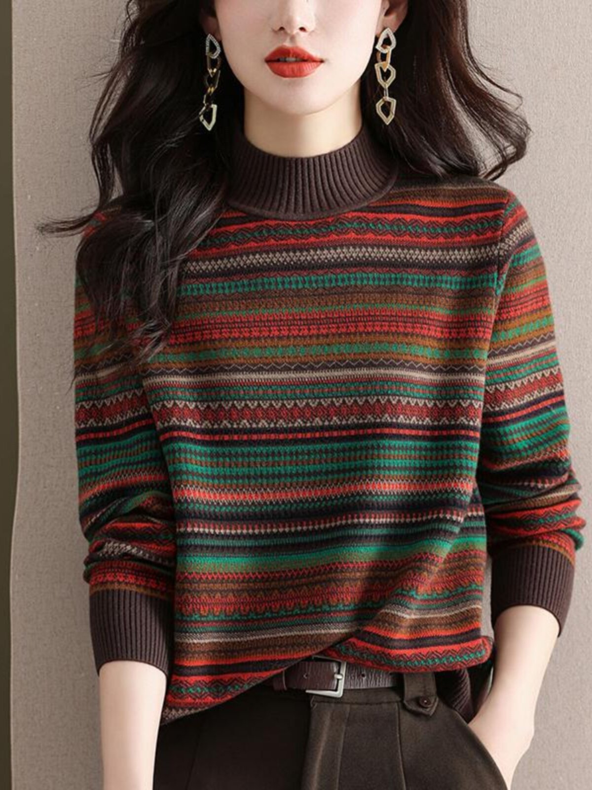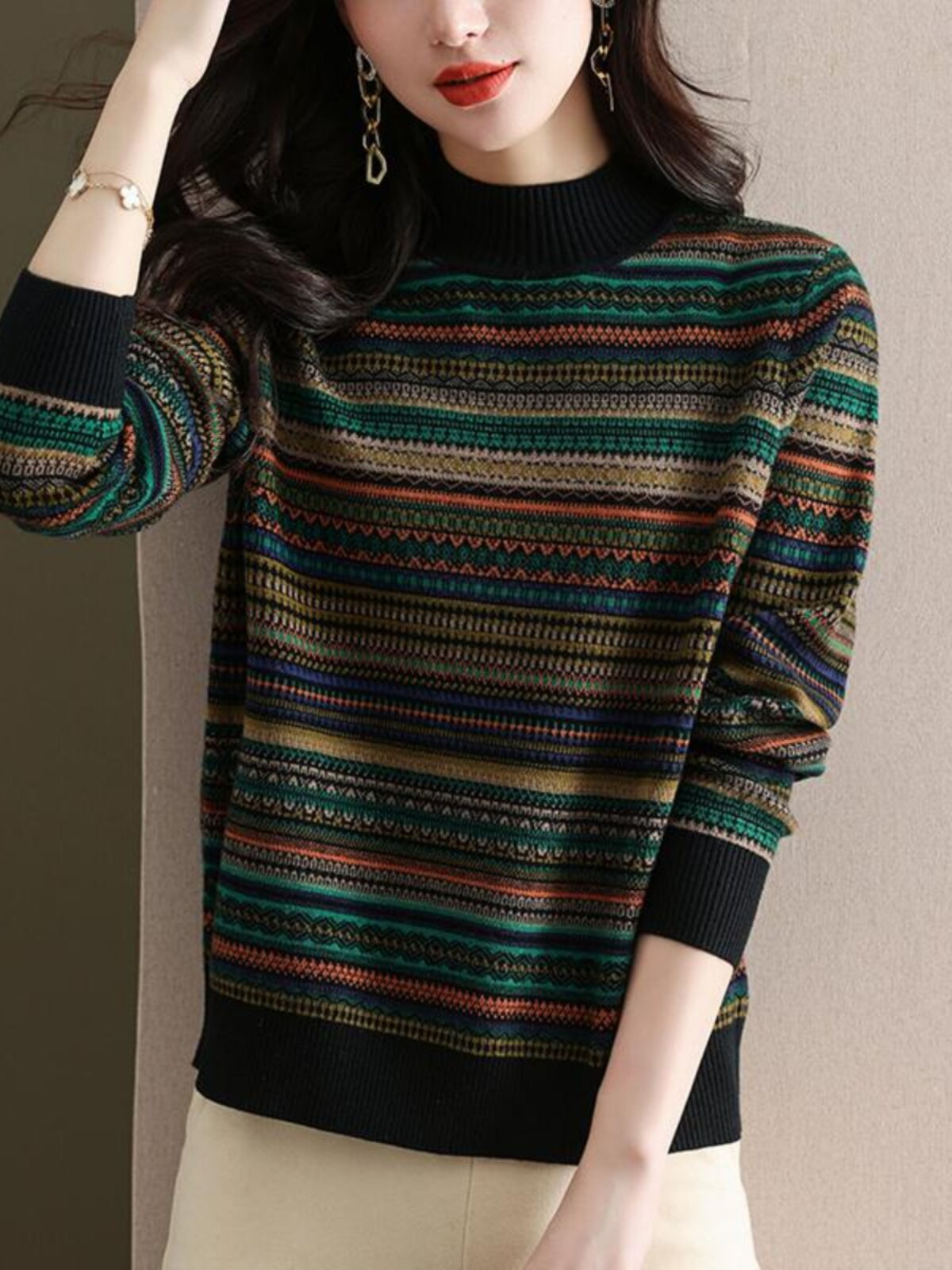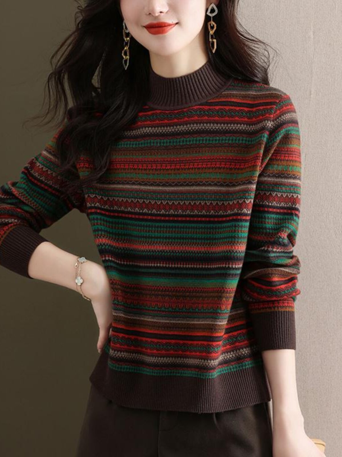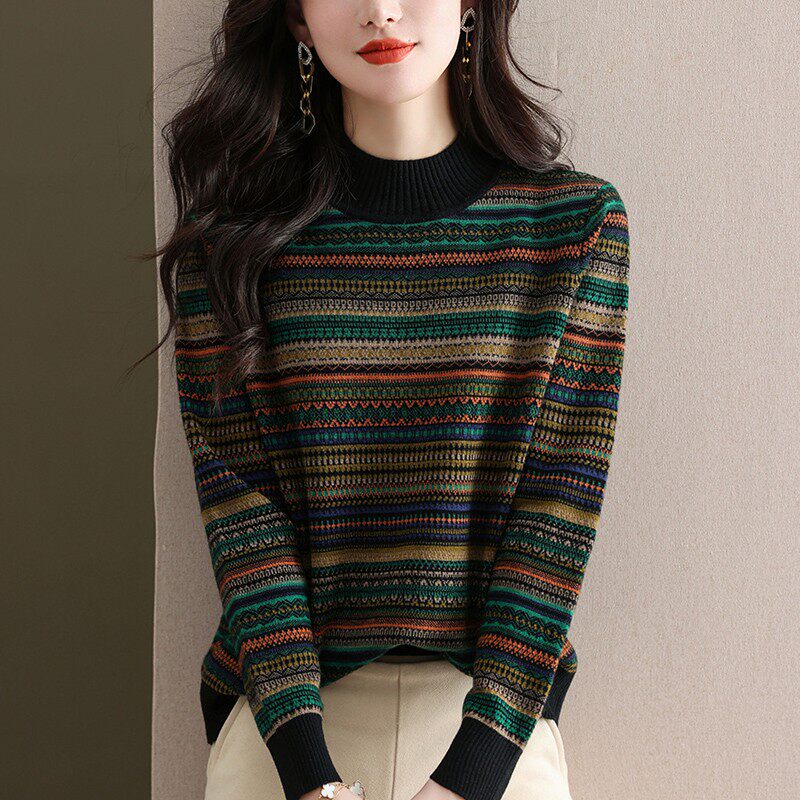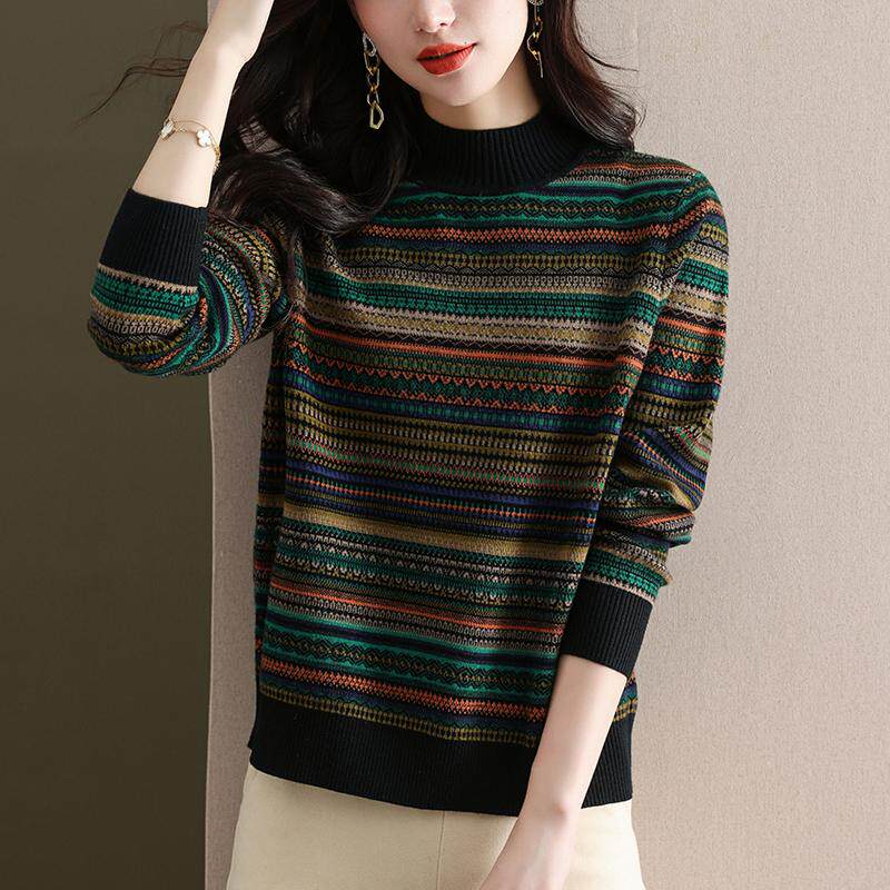中年女装复古时尚条纹半高领针织衫2024秋冬新款毛衣洋气打底小衫