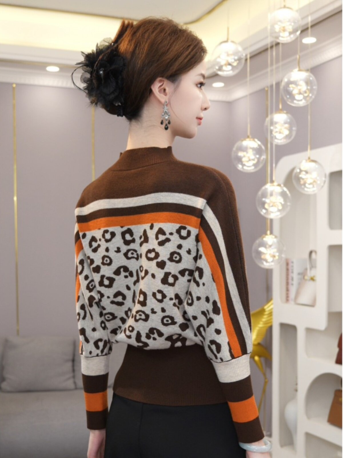 时尚撞色豹纹拼接半高领针织衫气质妈妈秋冬新款打底毛衣减龄小衫