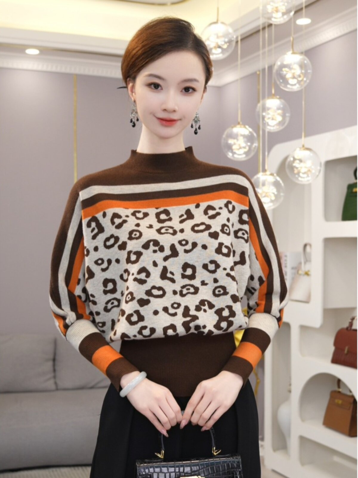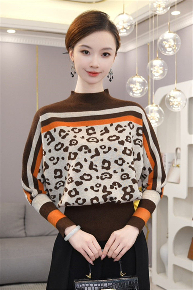 HomeProducts时尚撞色豹纹拼接半高领针织衫气质妈妈秋冬新款打底毛衣减龄小衫