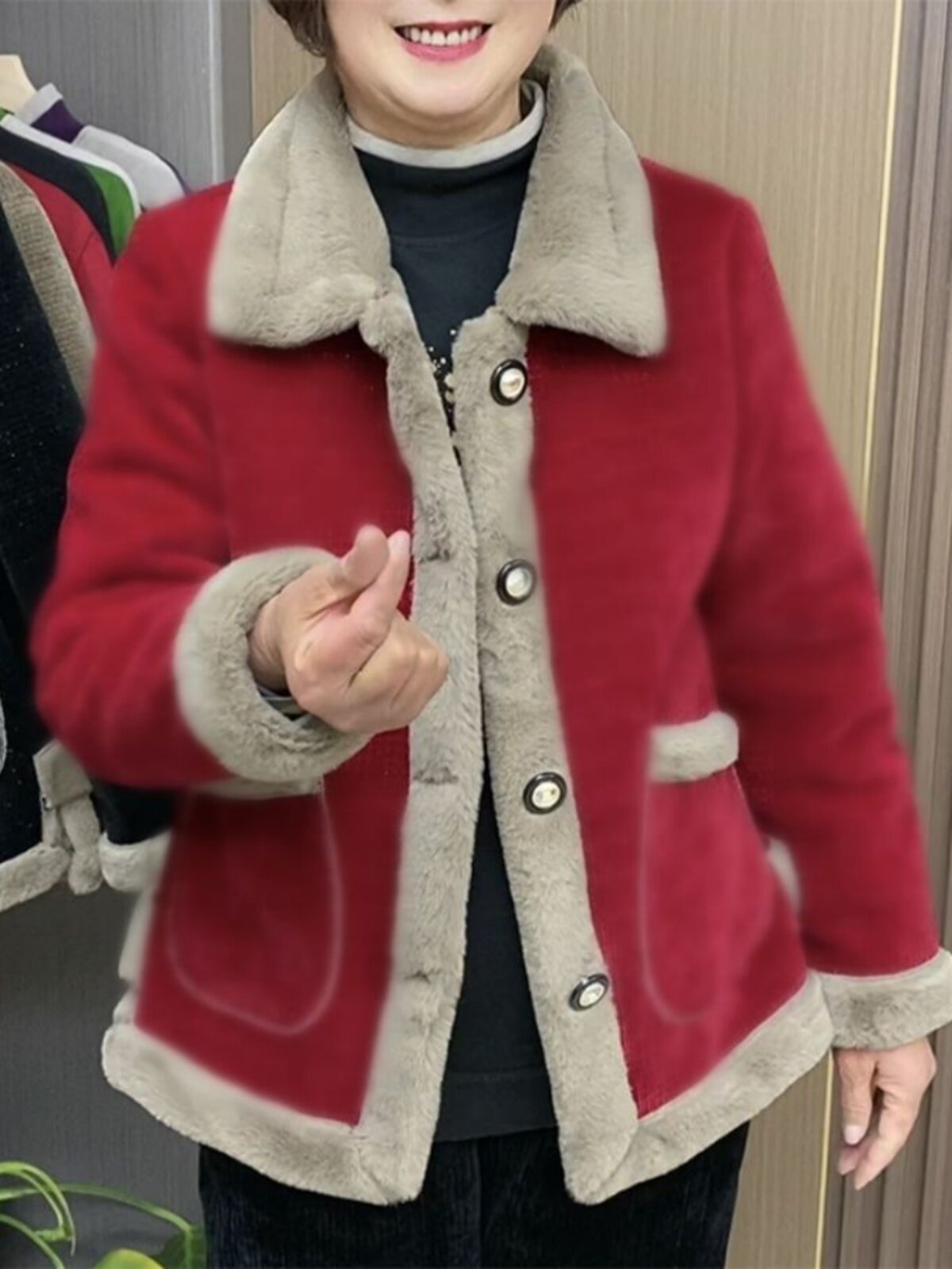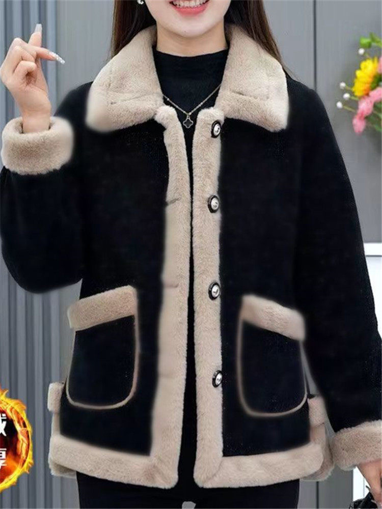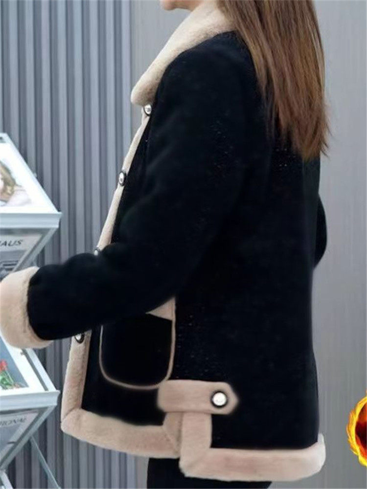 HomeProducts时尚撞色加绒毛呢短外套女2025春季新款加厚保暖妈妈洋气开衫上衣