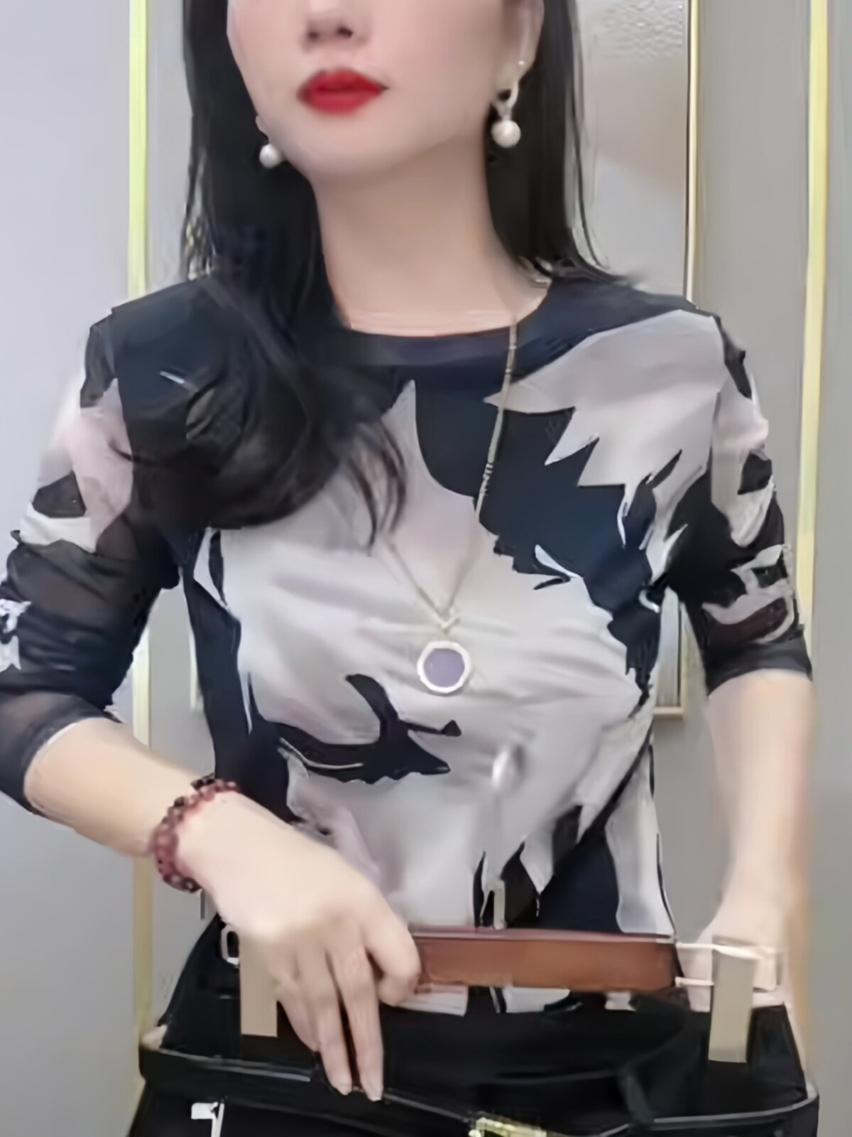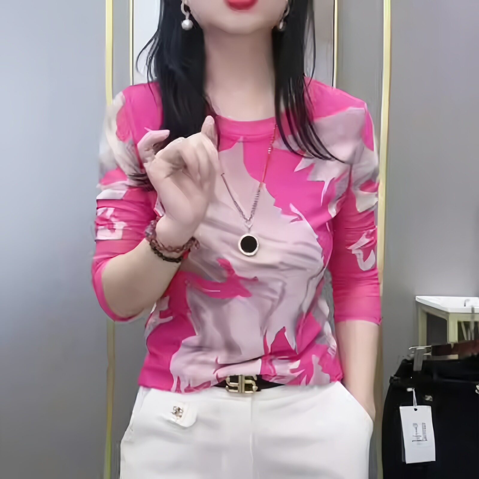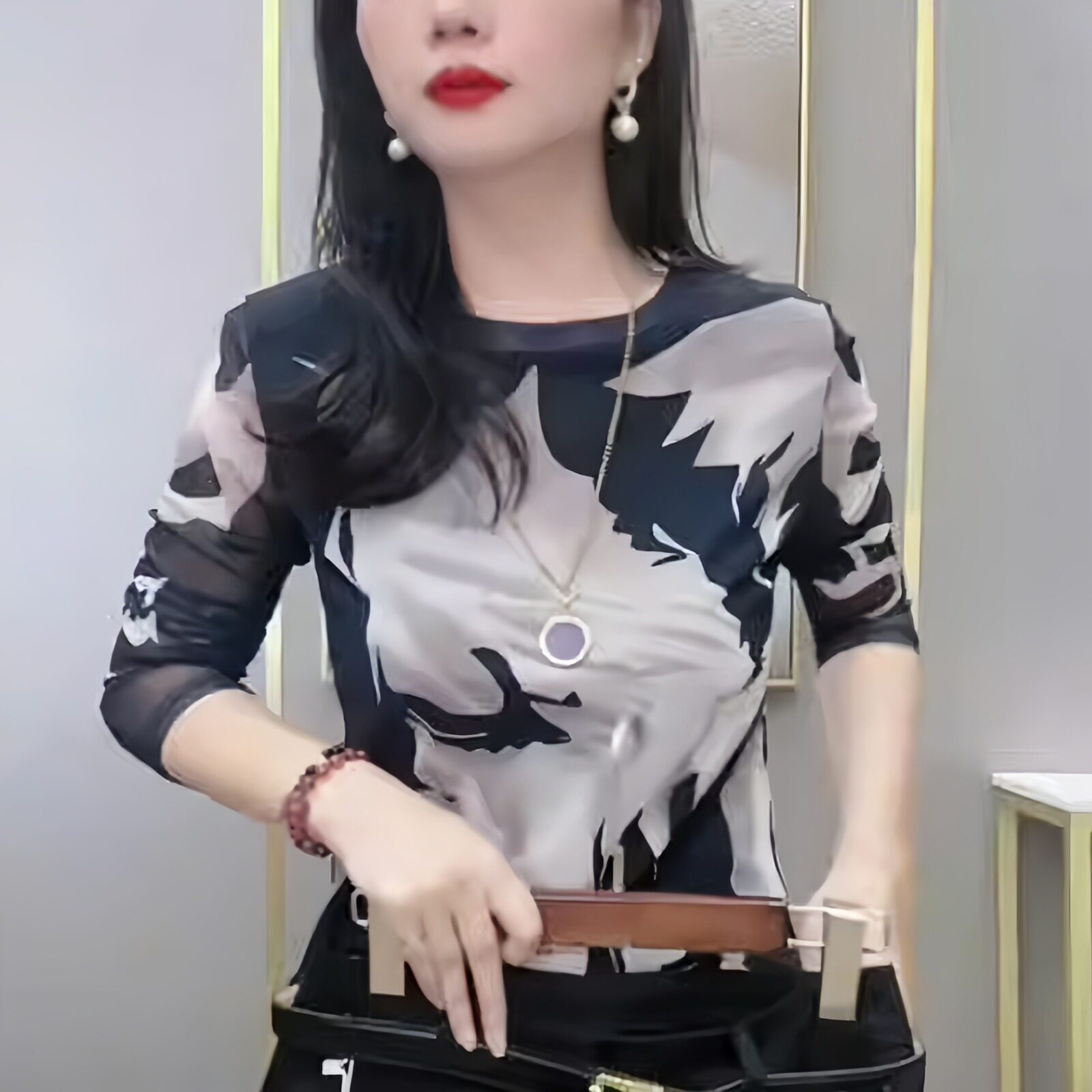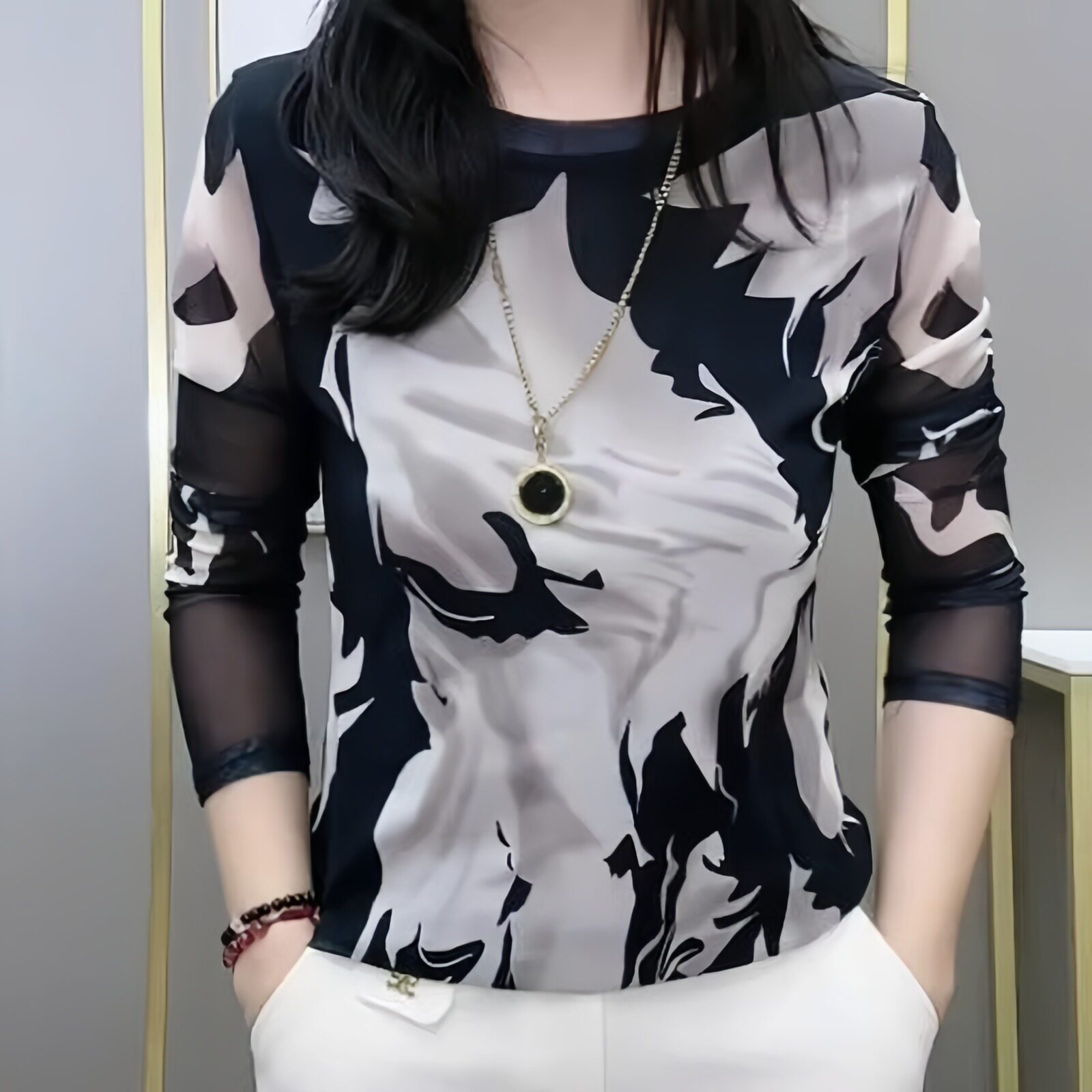 肌肤双层网纱长袖打底衫女士高档显瘦百搭t恤春秋款时尚修身上衣