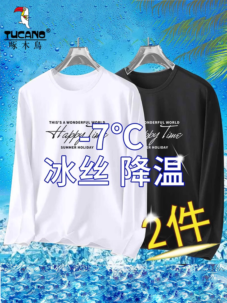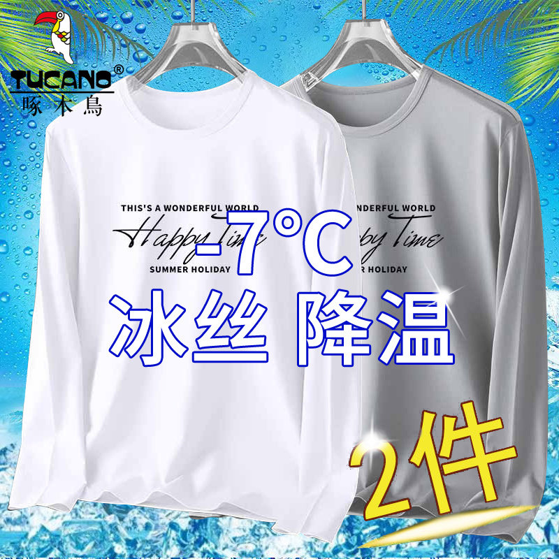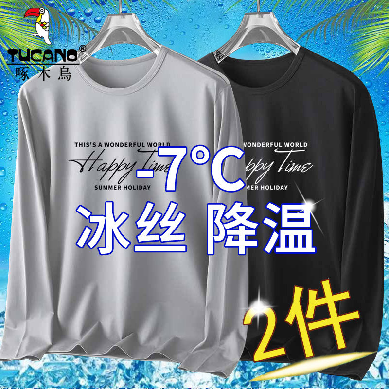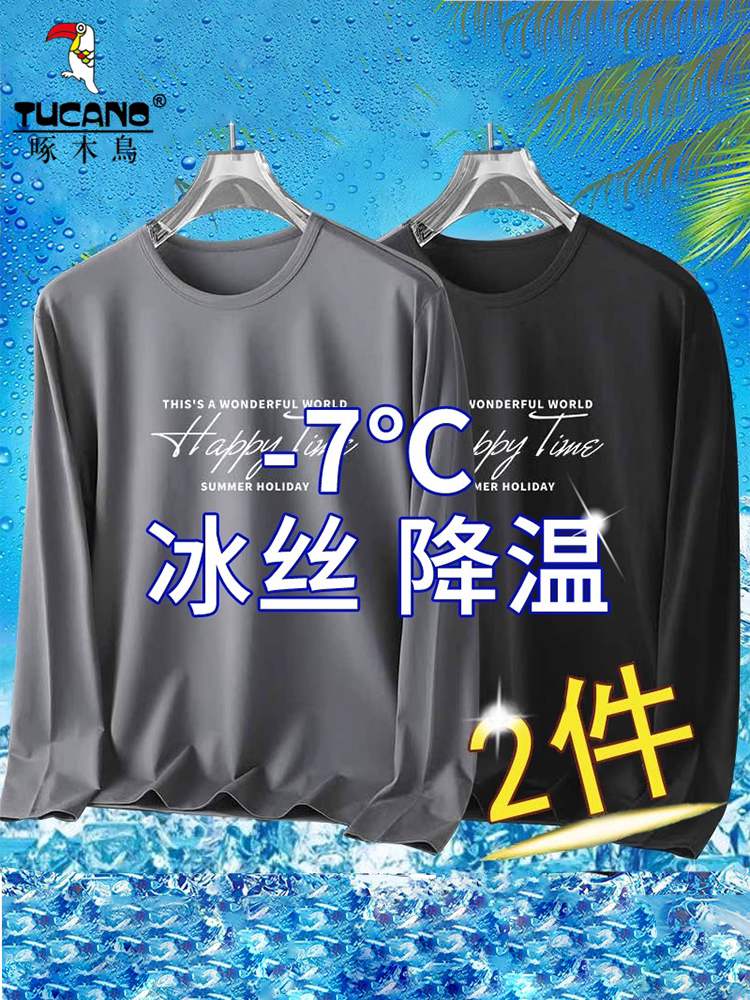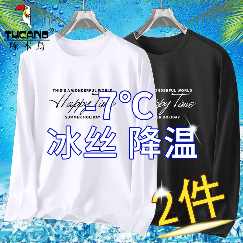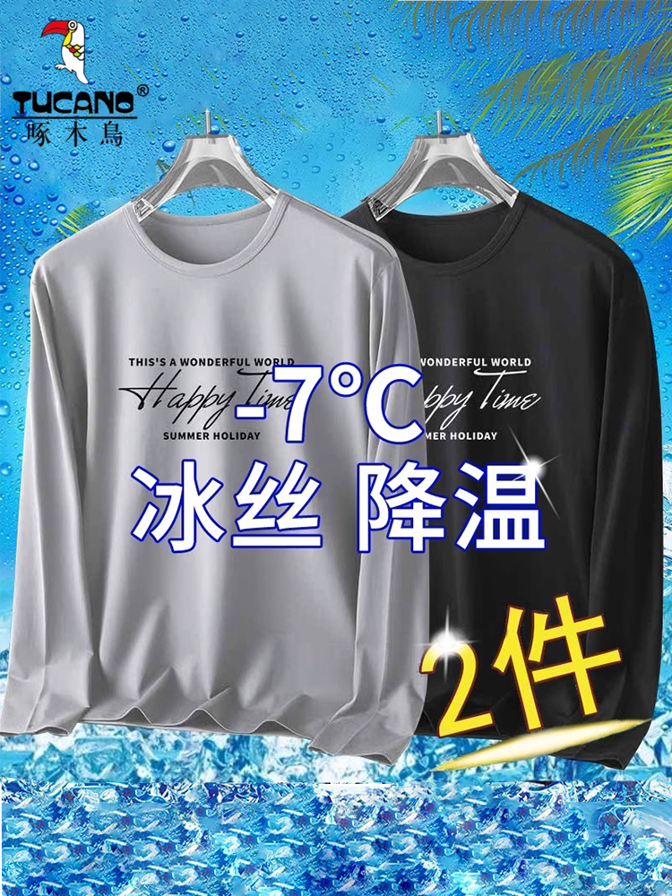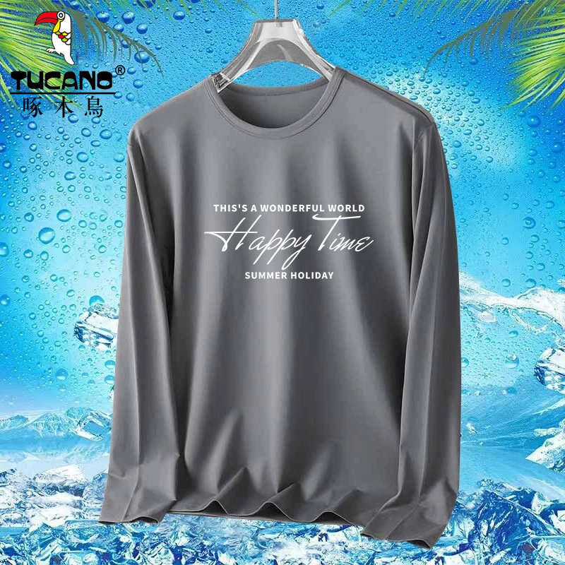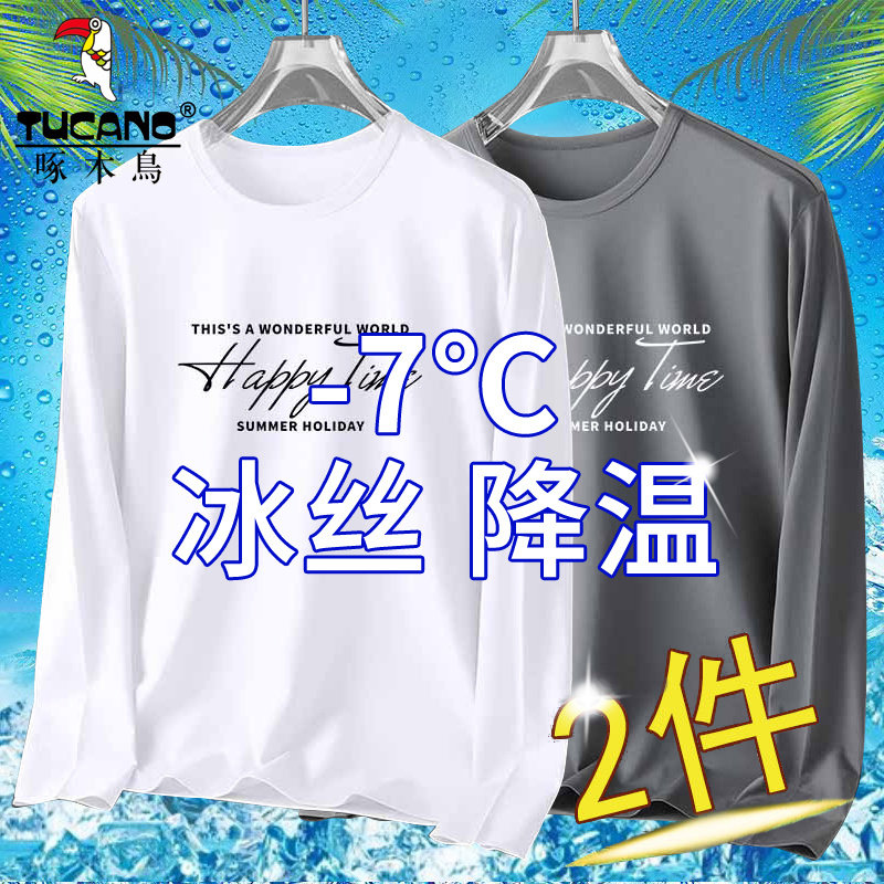 啄木鸟夏季网眼冰丝薄款长袖t恤男士大码宽松百搭圆领印花排汗衫