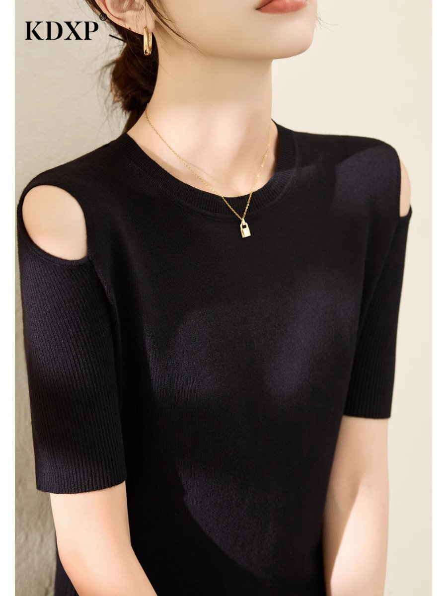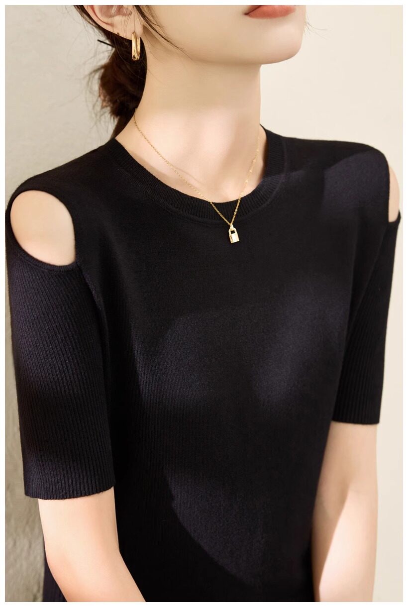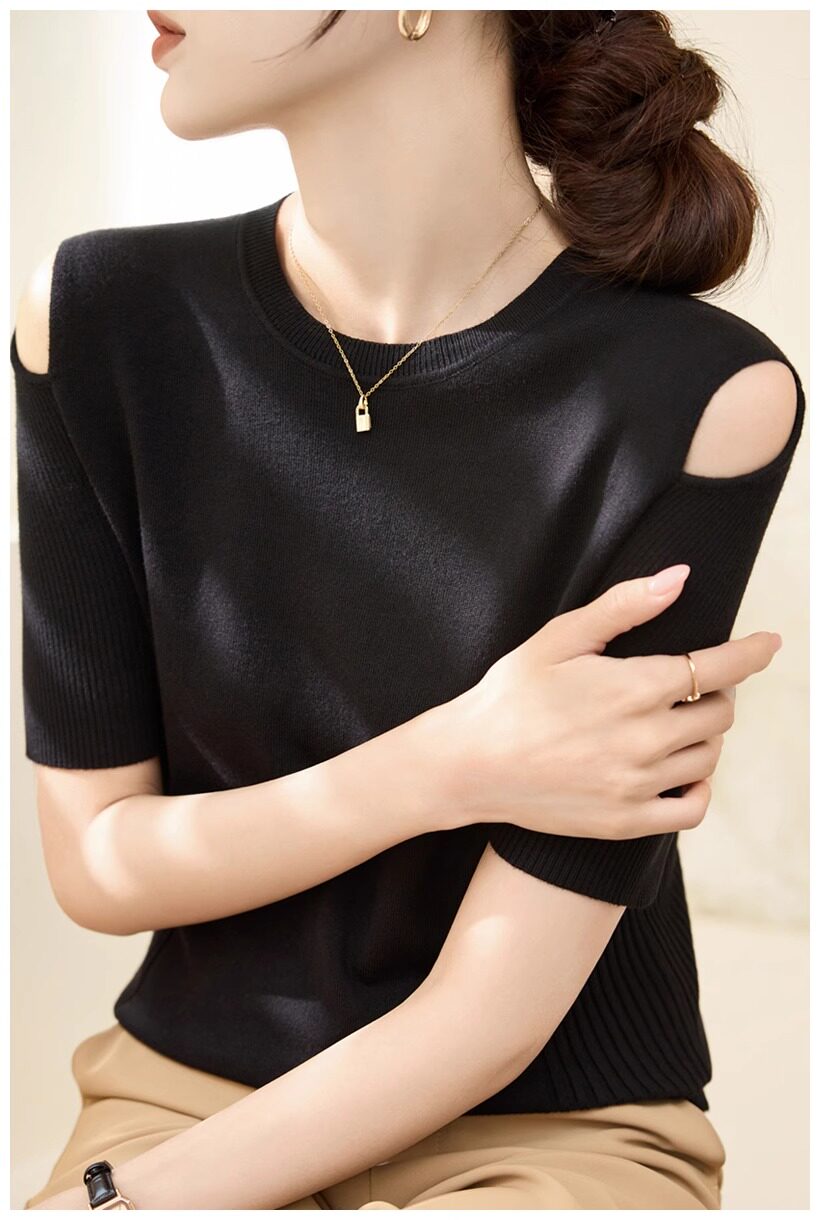 黑色短袖T恤女2026年夏季新款时尚修身百搭露肩设计冰丝针织上衣