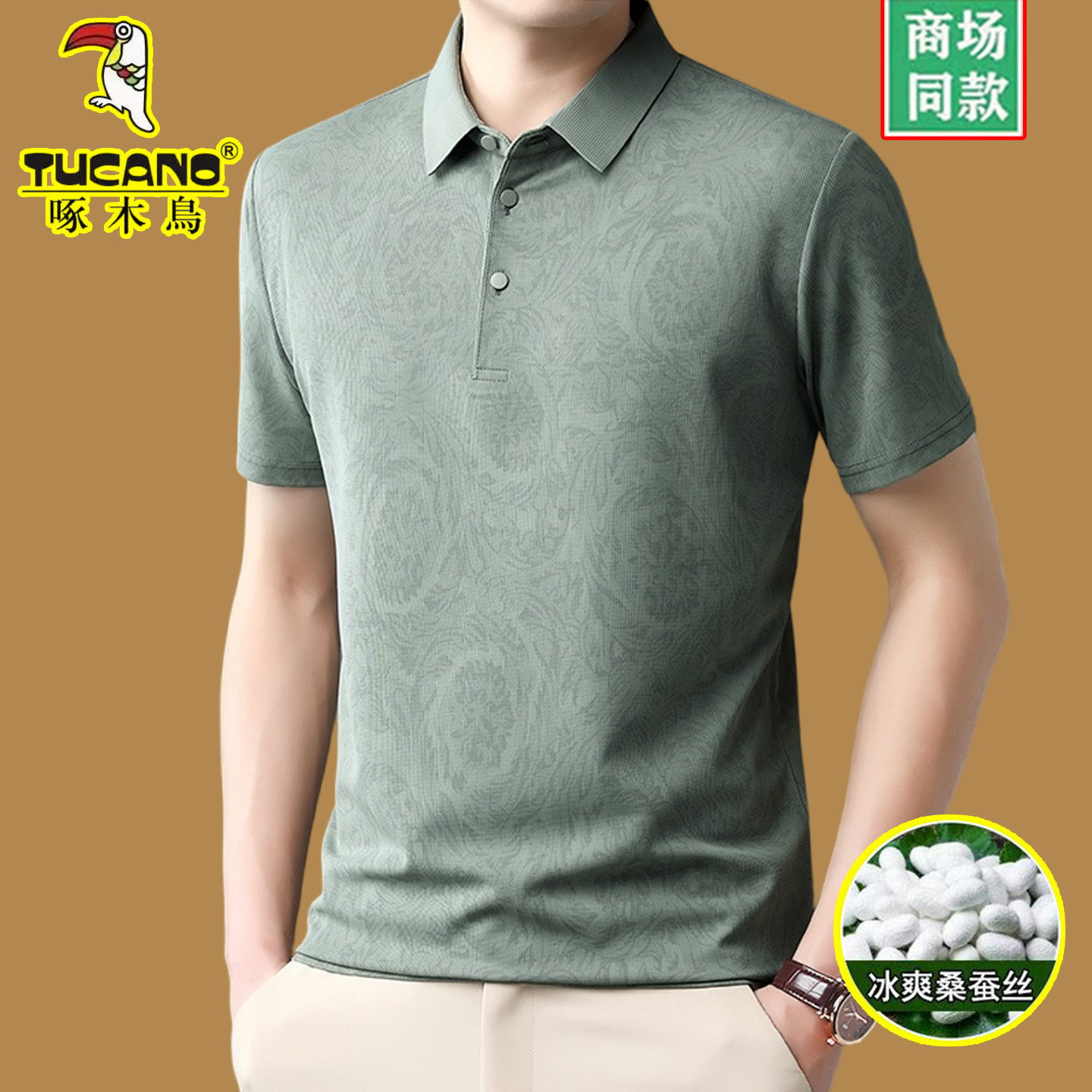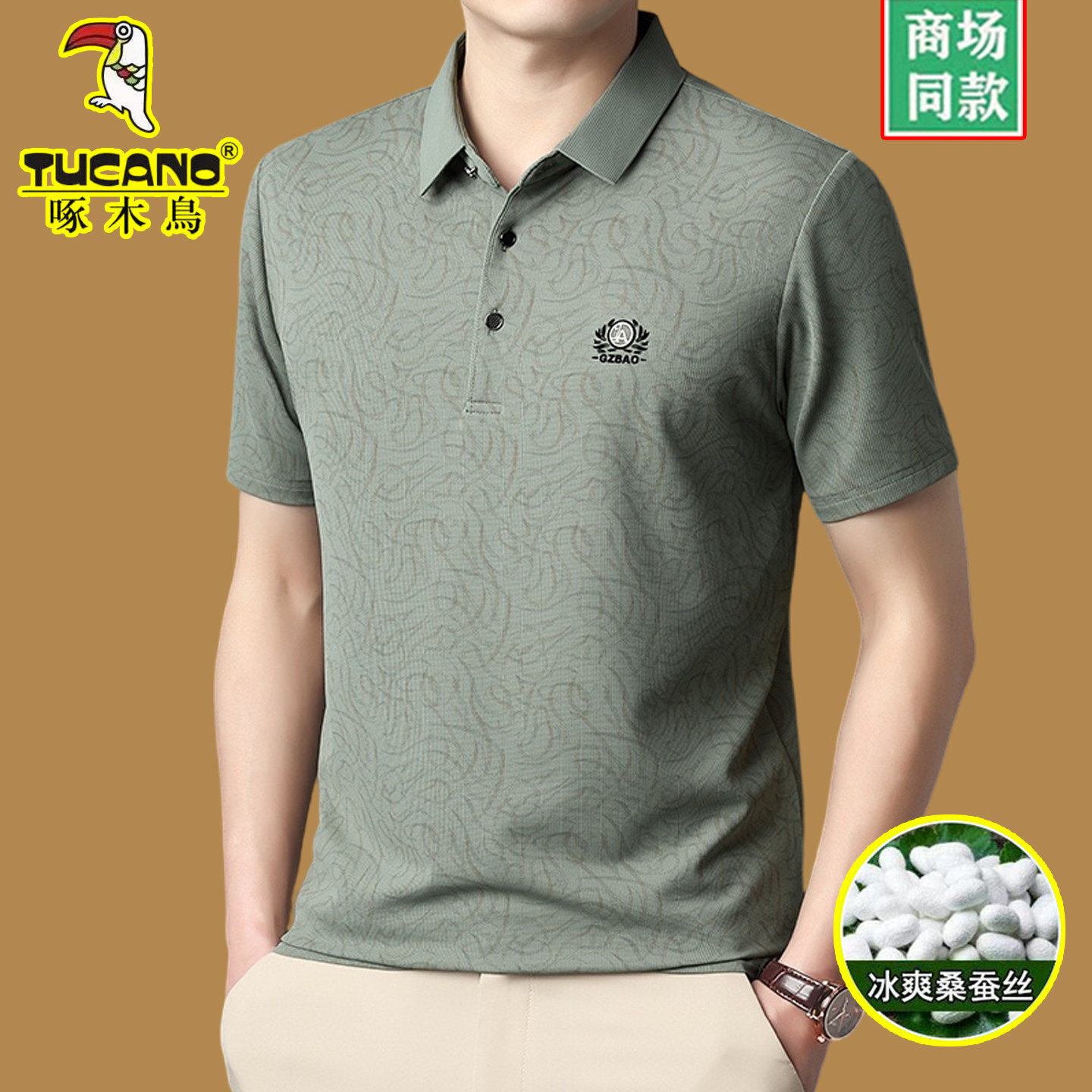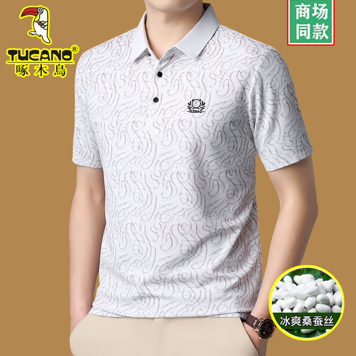 啄木鸟男士短袖t恤夏季桑蚕丝POLO衫男中年新款翻领冰丝体恤上衣T
