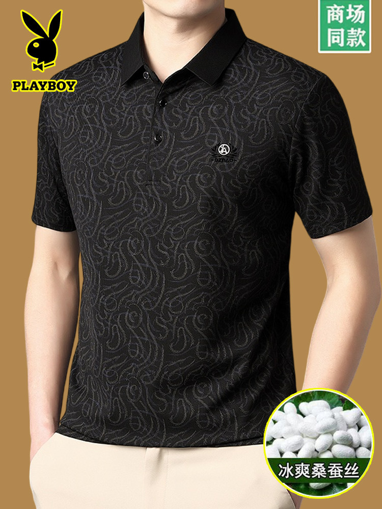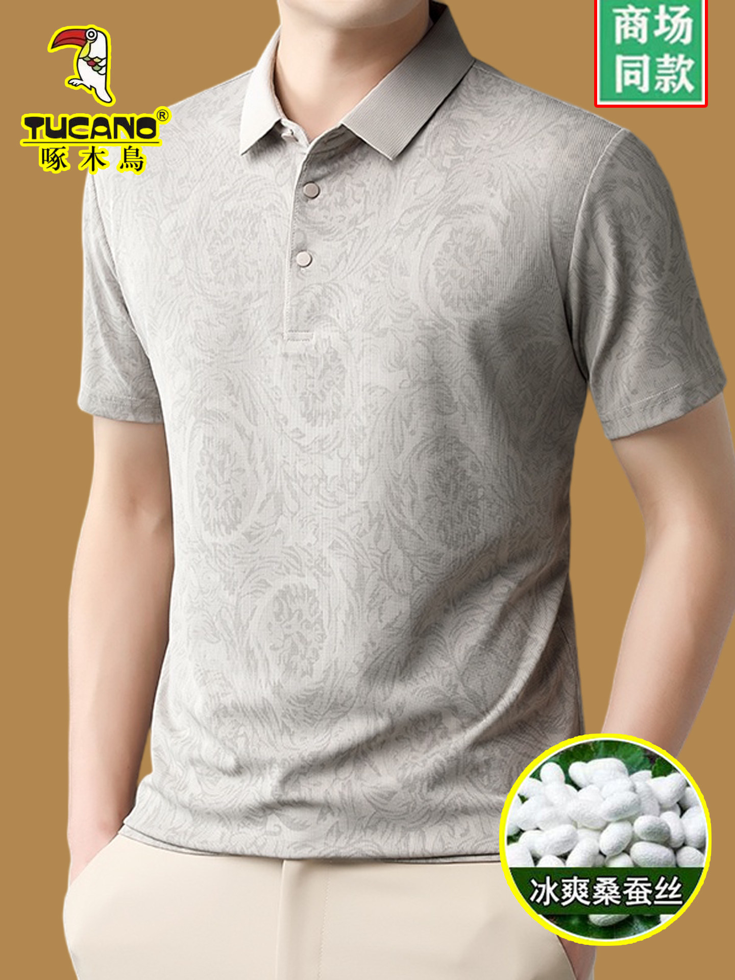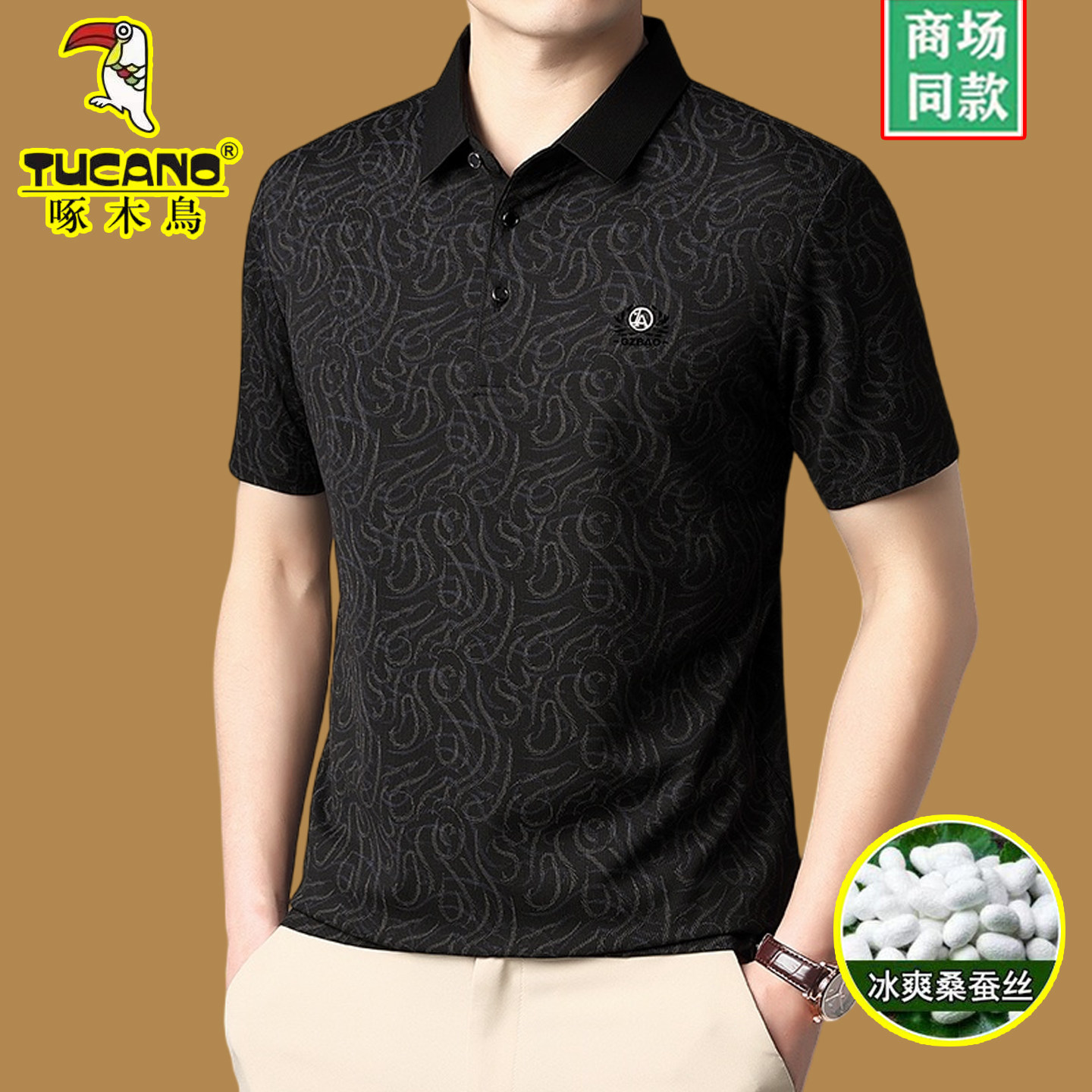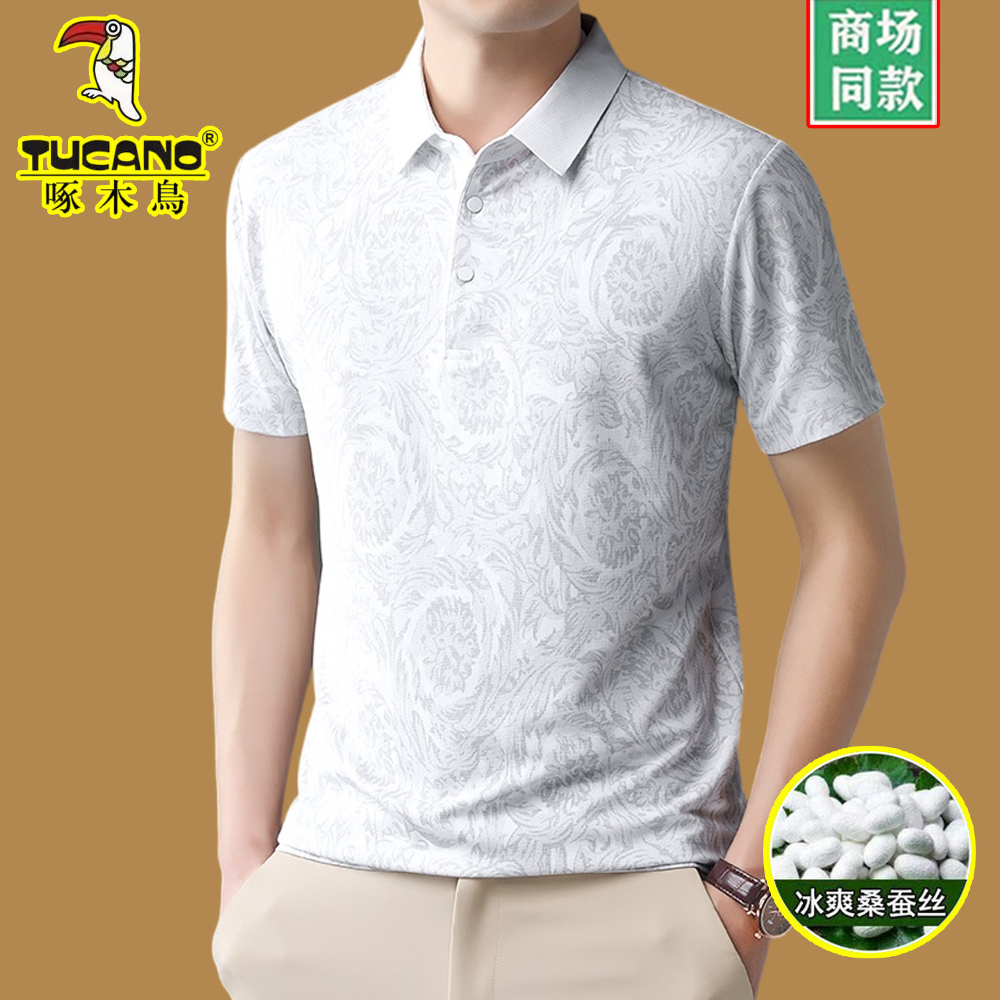 啄木鸟男士短袖t恤夏季桑蚕丝POLO衫男中年新款翻领冰丝体恤上衣T
