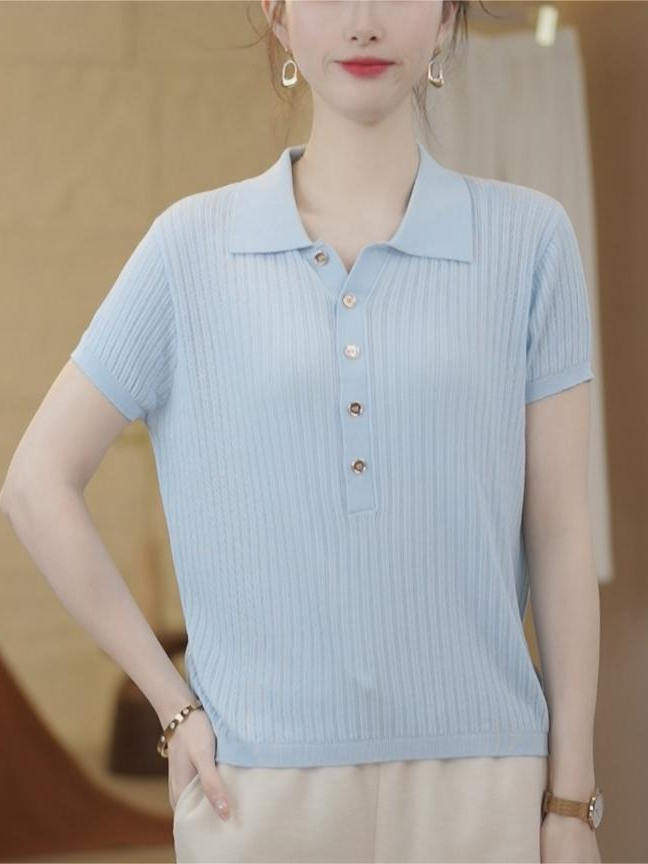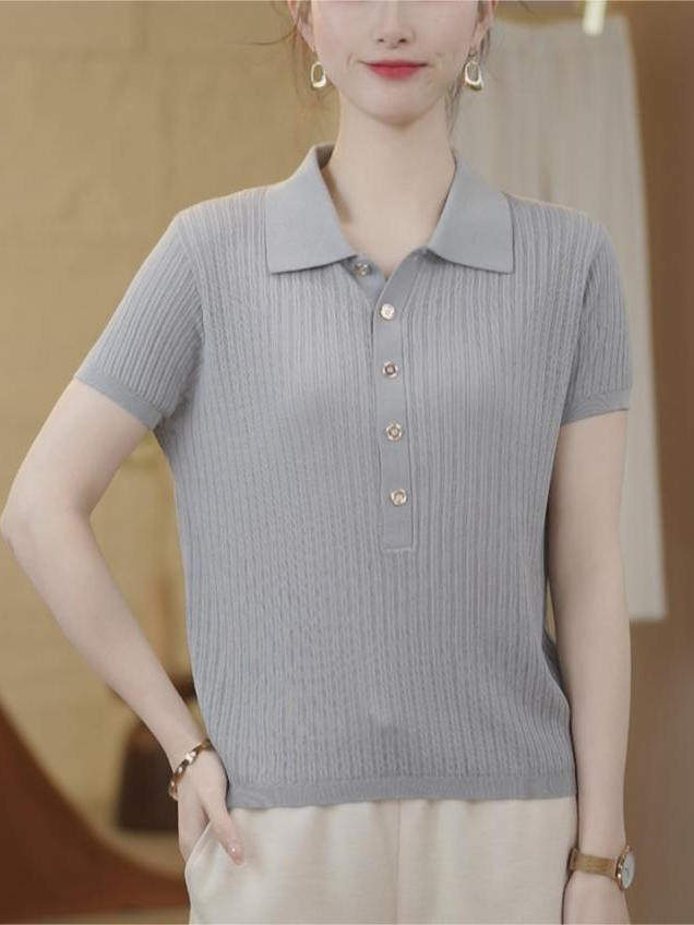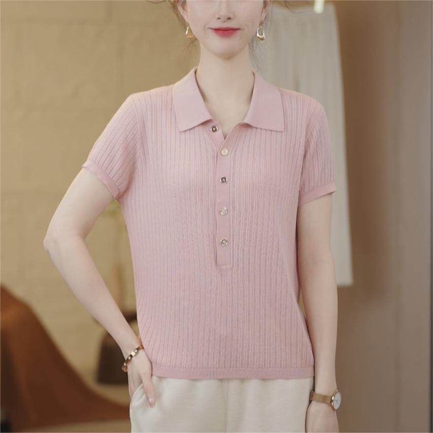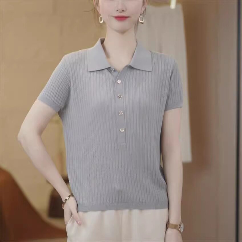 时尚纯色休闲翻领短袖T恤女薄款针织衫2025夏季新款中年女装上衣