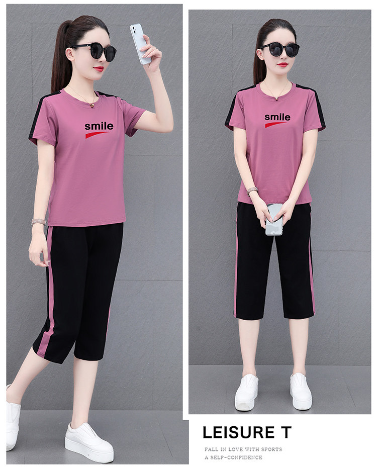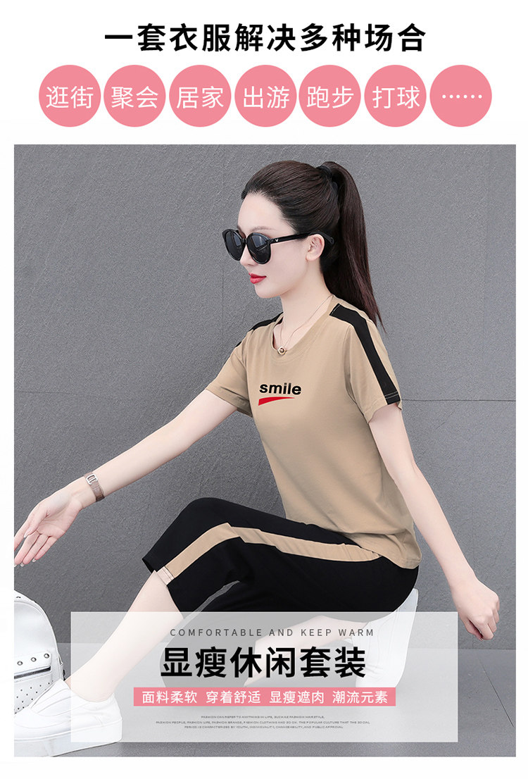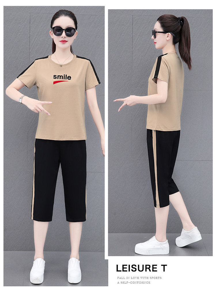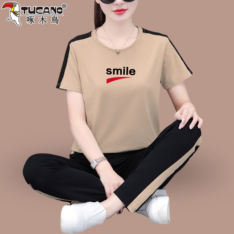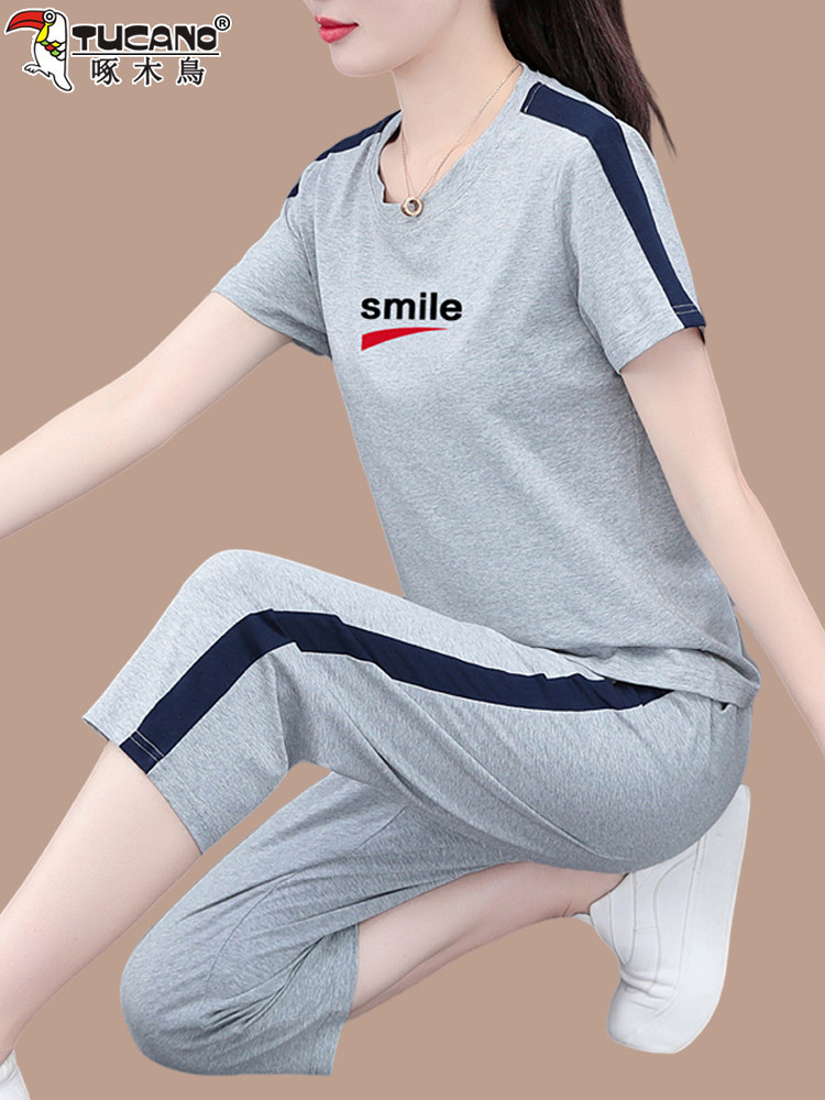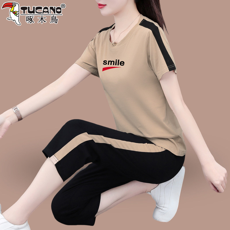 啄木鸟纯棉短袖七分裤套装女夏季2026新款妈妈洋气休闲运动两件套
