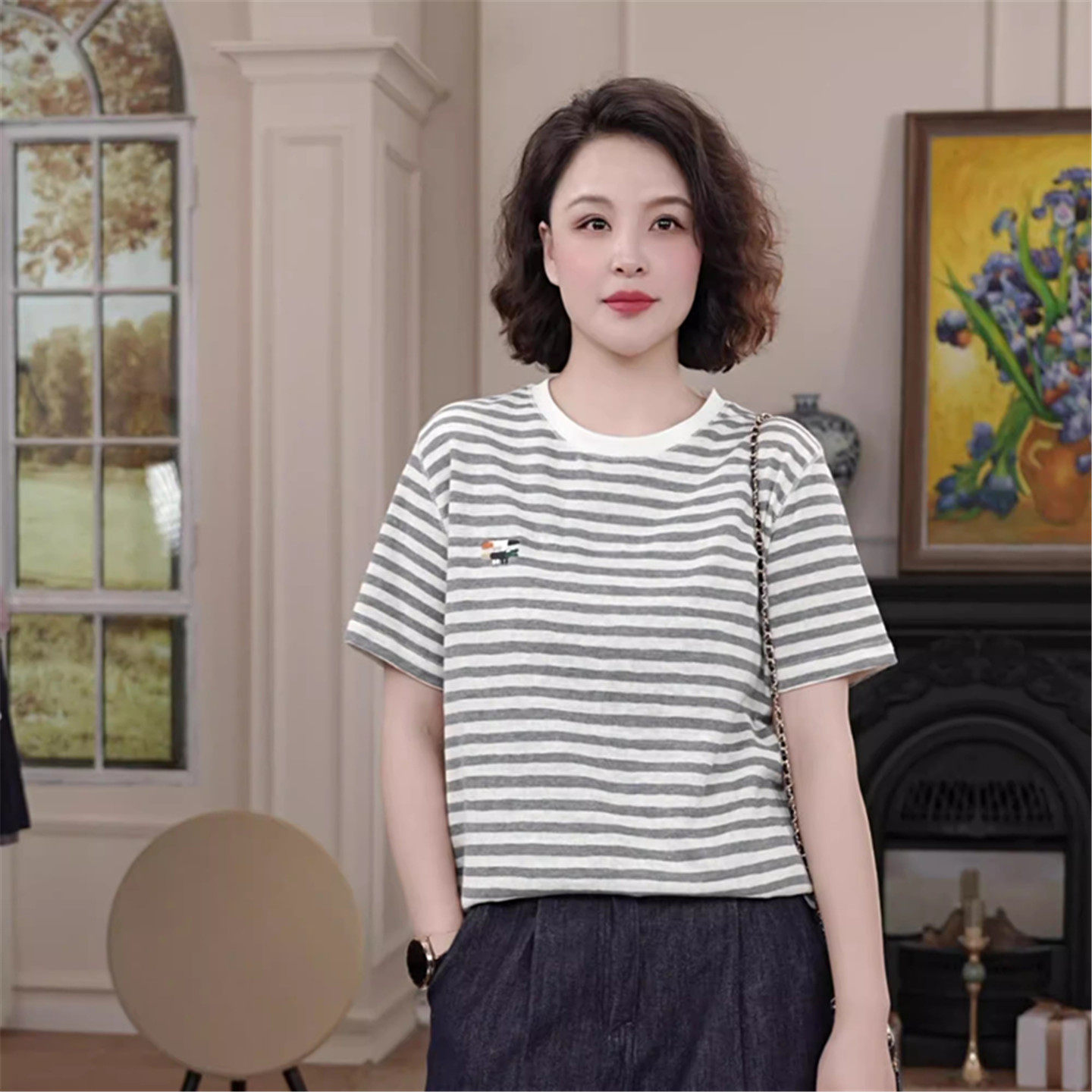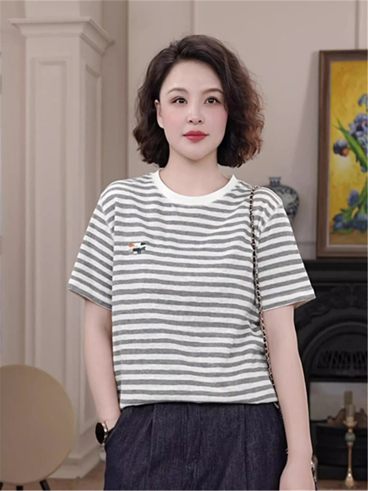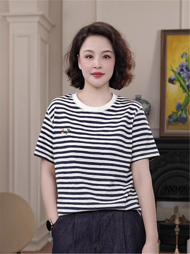 时尚圆领条纹纯棉T恤女士短袖洋气上衣2025夏季新款大码宽松小衫