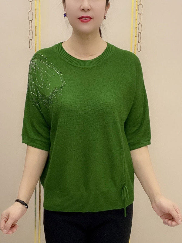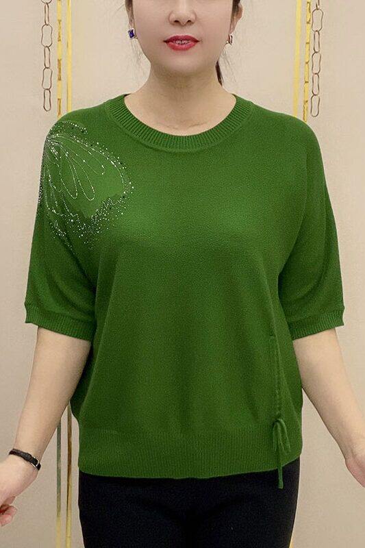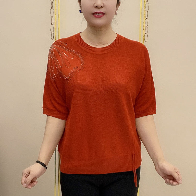 HomeProducts中老年时尚烫钻圆领薄款针织衫女士大码宽松显瘦洋气纯色百搭T恤