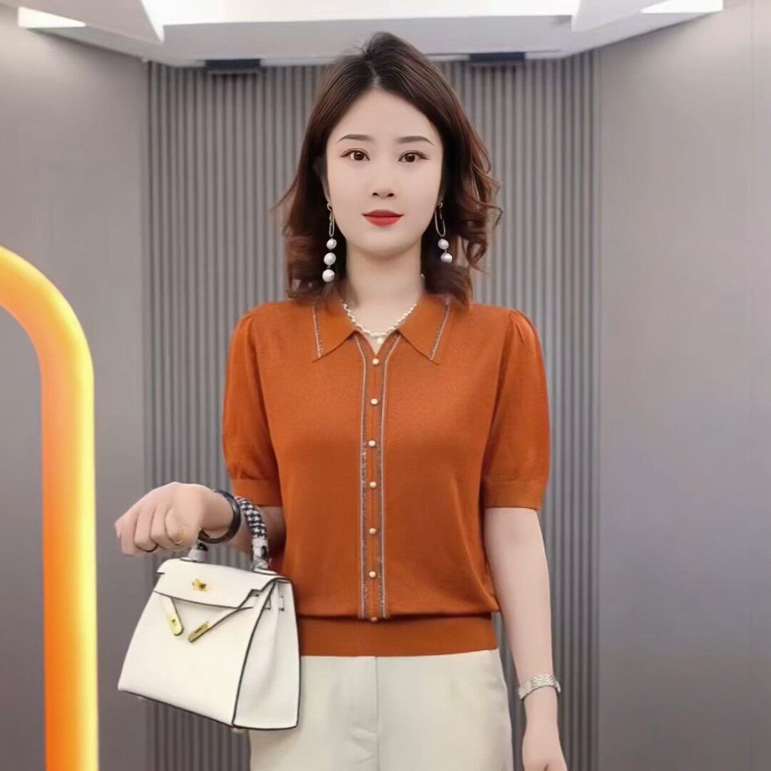 高级感镶钻翻领针织衫女中袖上衣夏新款轻奢妈妈夏装时尚洋气小衫