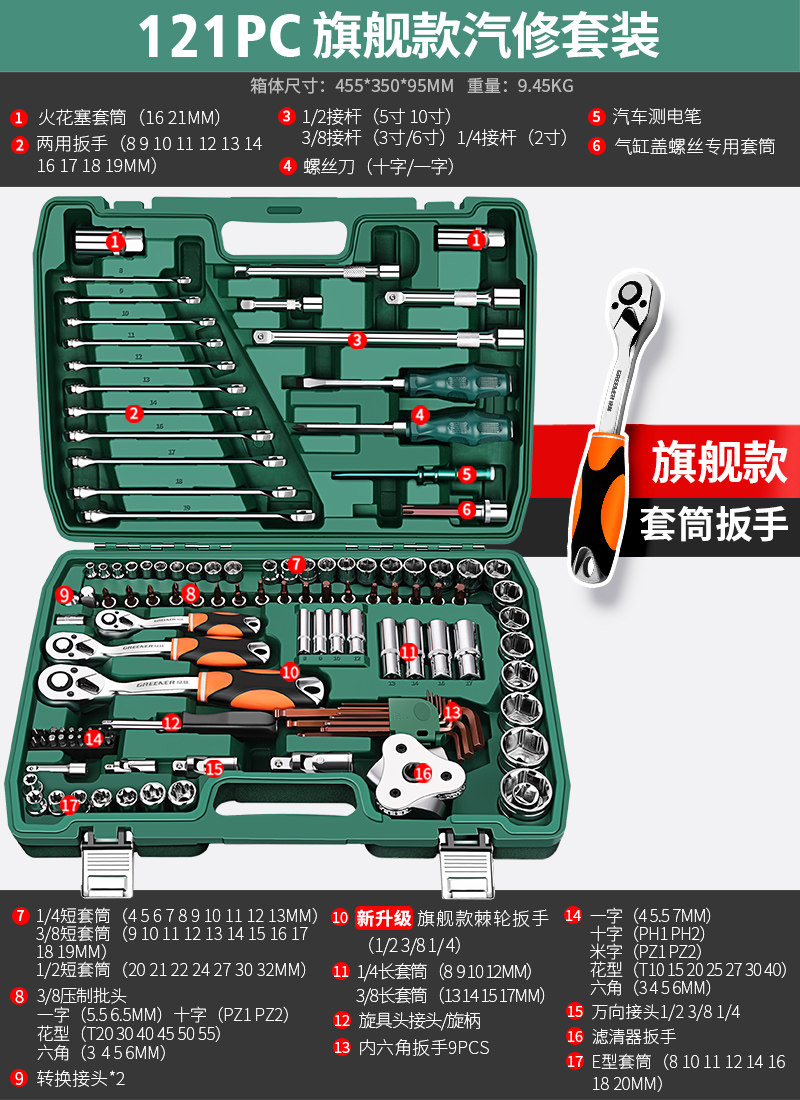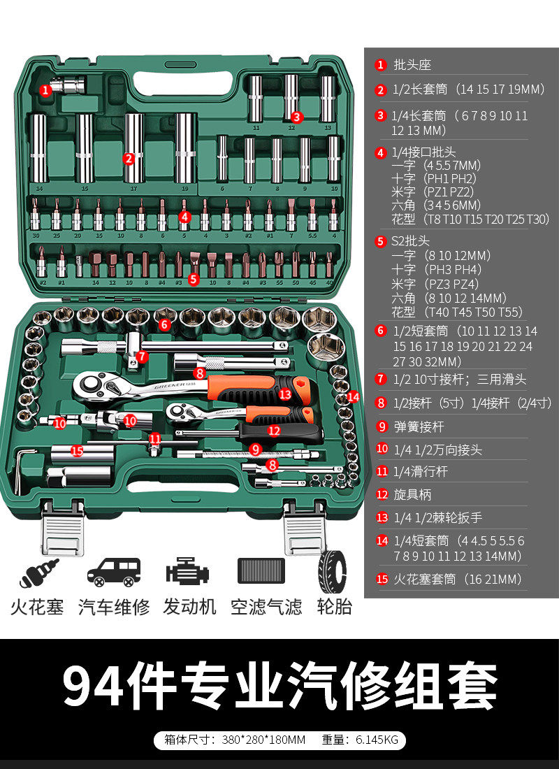 绿林X系列汽修工具套装套筒组合棘轮扳手摩托车修汽车工具箱大全