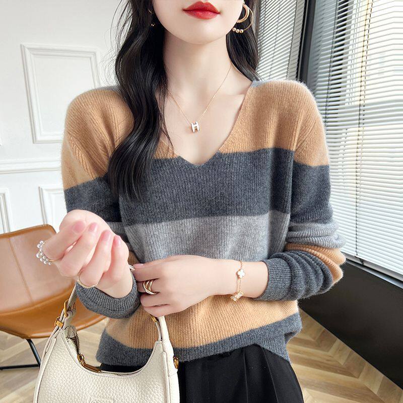 慵懒风条纹V领针织衫女秋装2025新款时尚撞色毛衣宽松显瘦打底衫