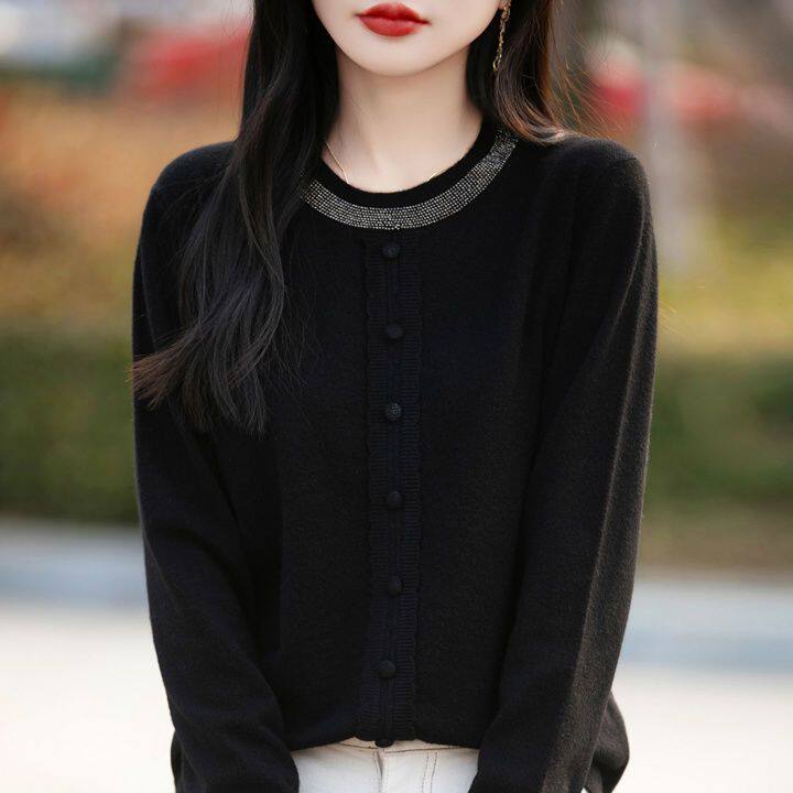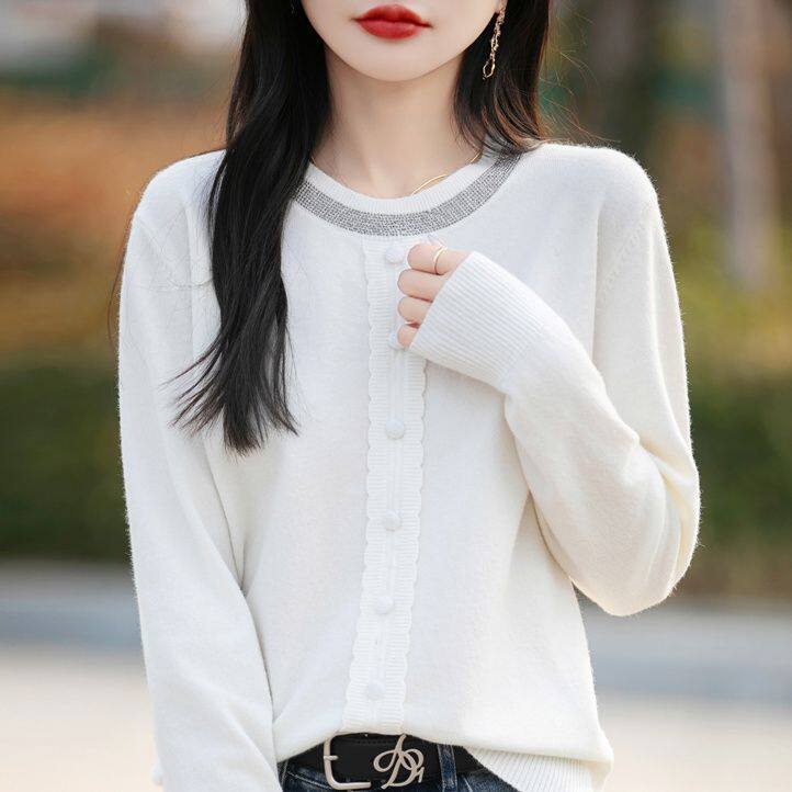 气质圆领烫钻长袖针织衫女2025秋冬新款时尚毛衣内搭长袖打底小衫