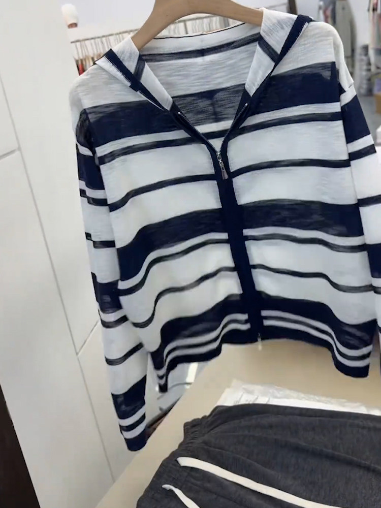 今年新款2025秋季条纹长袖针织衫女蓝色连帽拉链设计时尚显瘦上衣