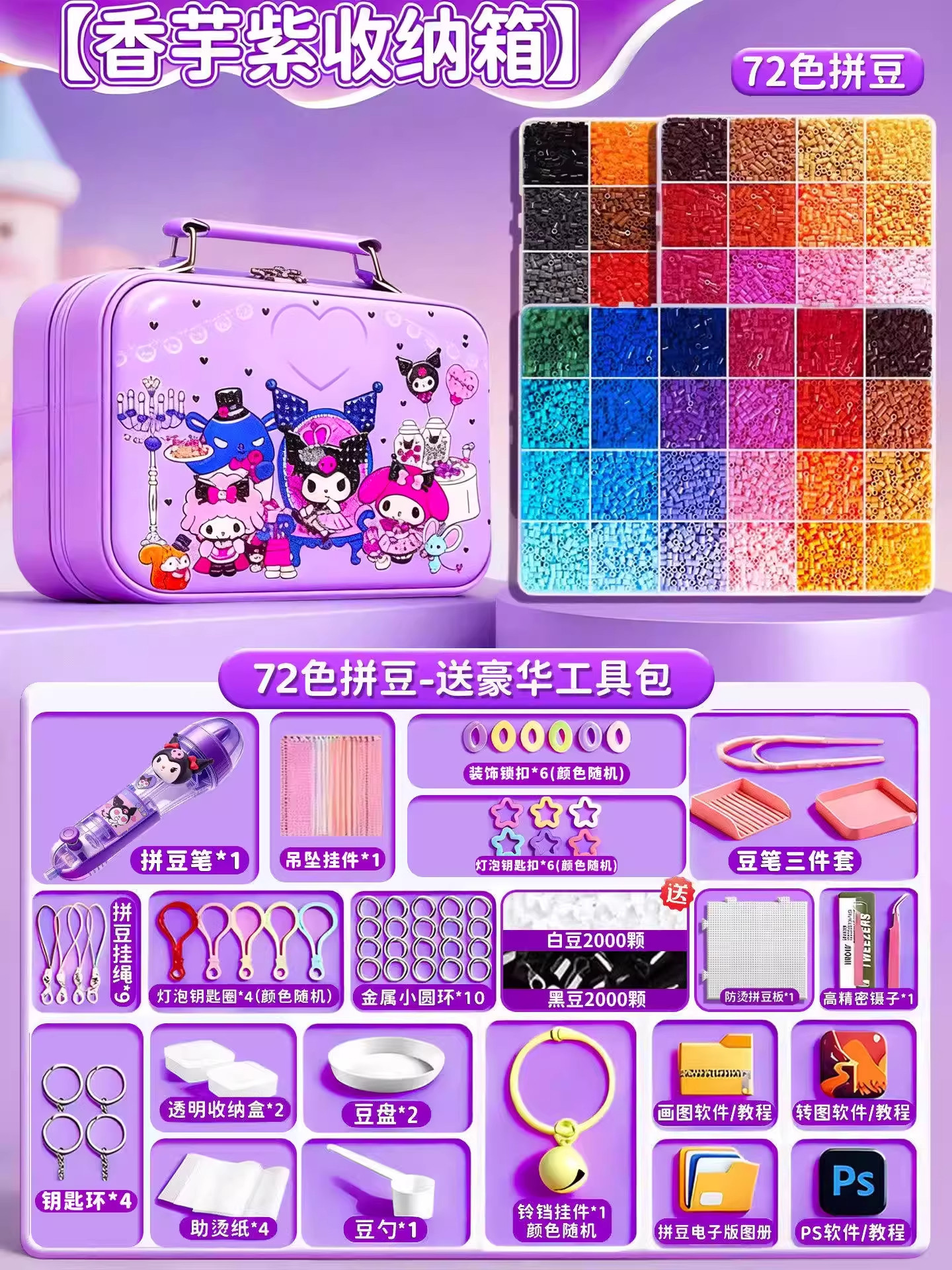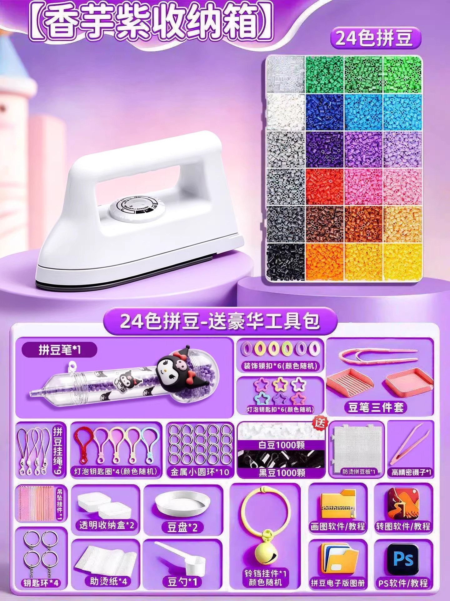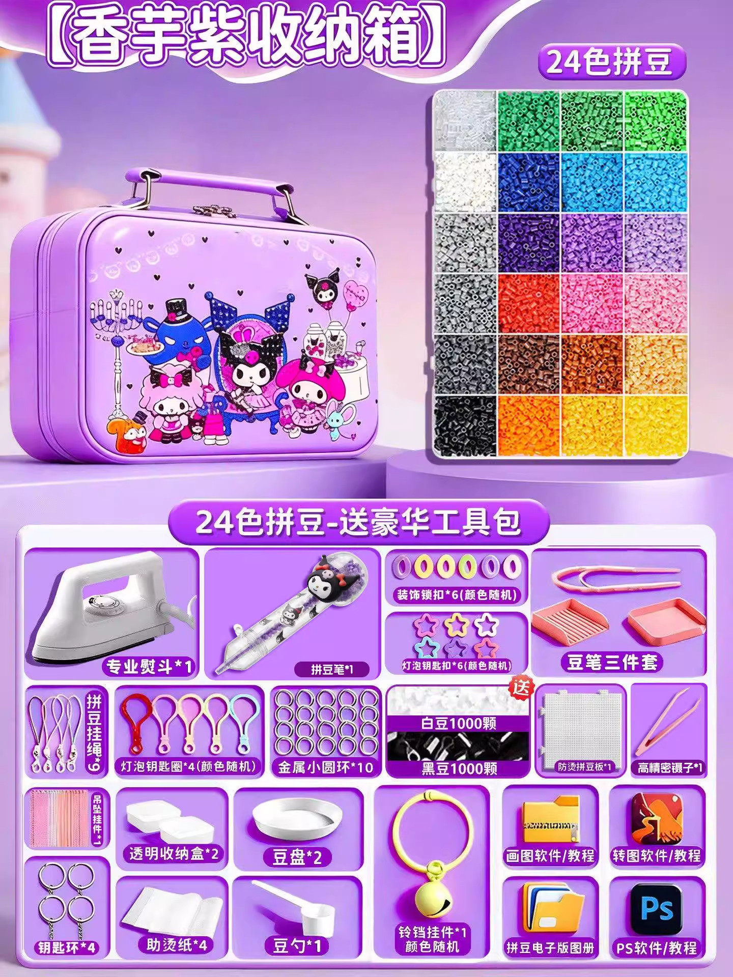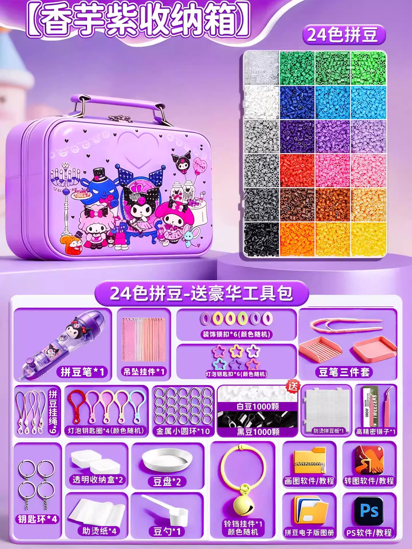 24色⭐【送自动拼豆笔+紫色收纳箱】送豪华工具包+黑白豆2000颗